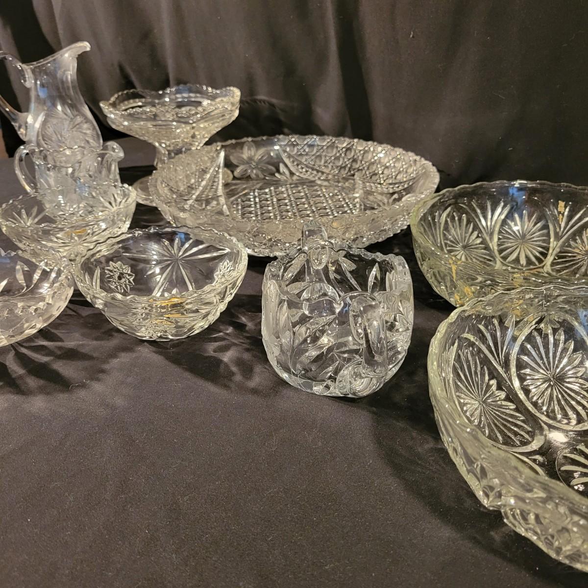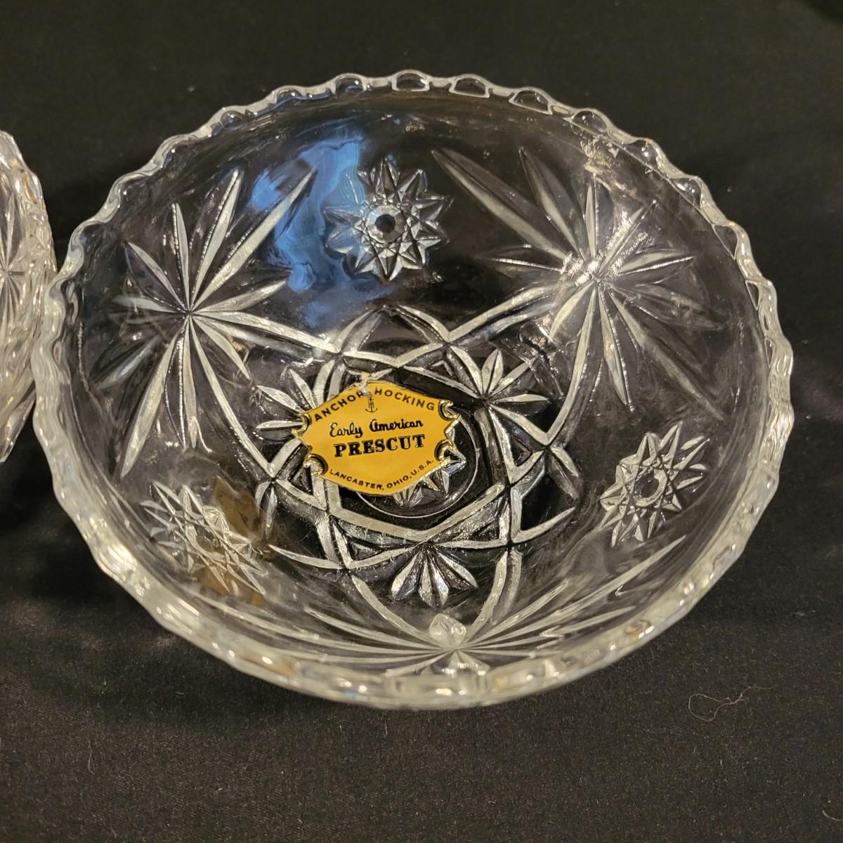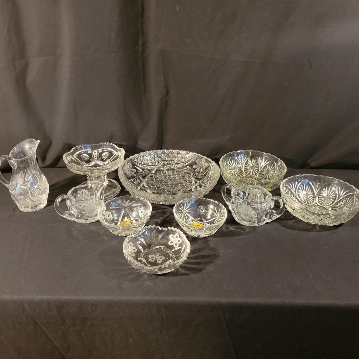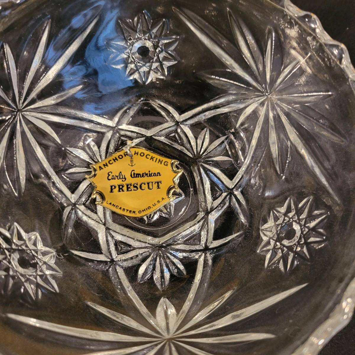 A collection of 10 pieces of pressed and cut glass pieces in good condition with no notable chips or damage. Assortment includes pieces manufactured by Anchor Hocking and is an assortment of bowls, dishes, pitchers and more. The largest piece is a footed bowl that measures approximately 12" x 3". We cannot confirm that all item are Anchor Hocking Prescut, but unlabeled items are a similar style. Shipping available