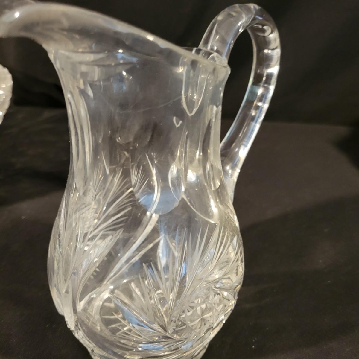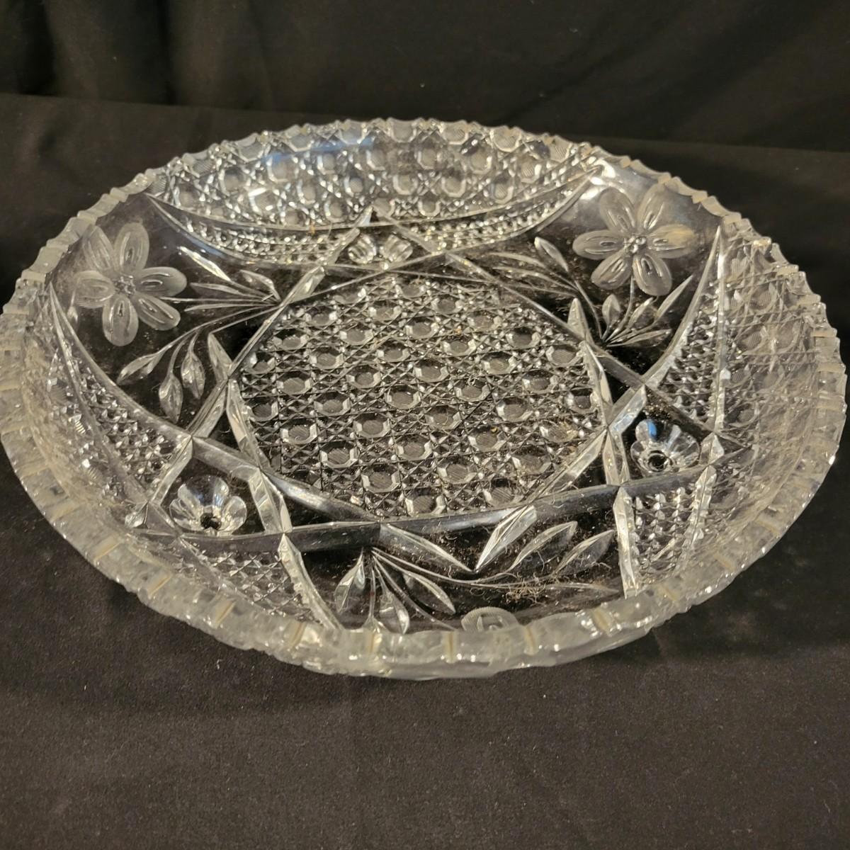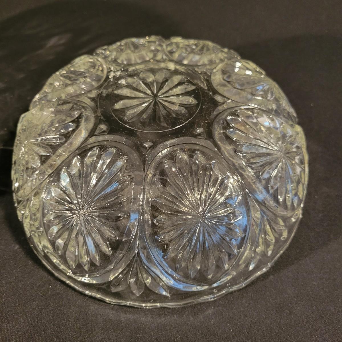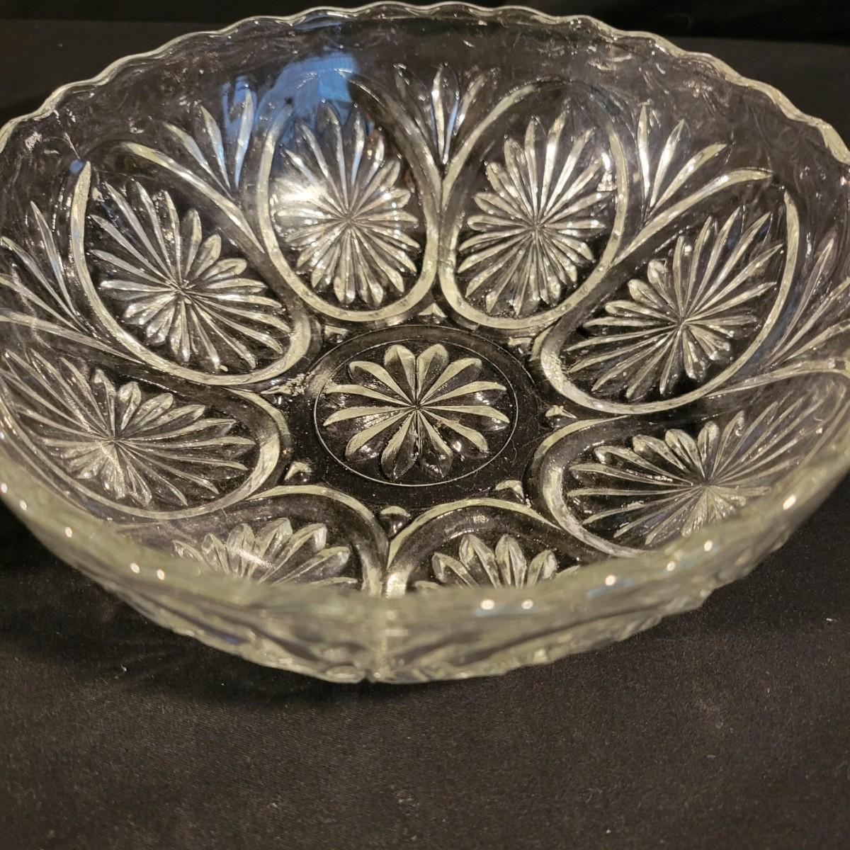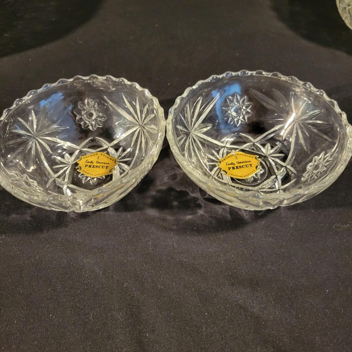 A collection of 10 pieces of pressed and cut glass pieces in good condition with no notable chips or damage. Assortment includes pieces manufactured by Anchor Hocking and is an assortment of bowls, dishes, pitchers and more. The largest piece is a footed bowl that measures approximately 12" x 3". We cannot confirm that all item are Anchor Hocking Prescut, but unlabeled items are a similar style. Shipping available