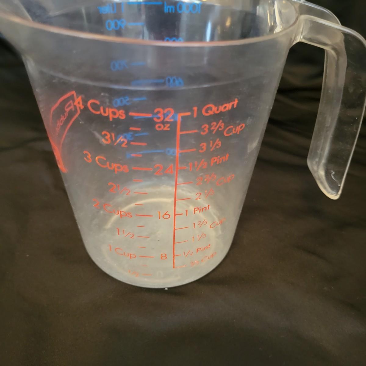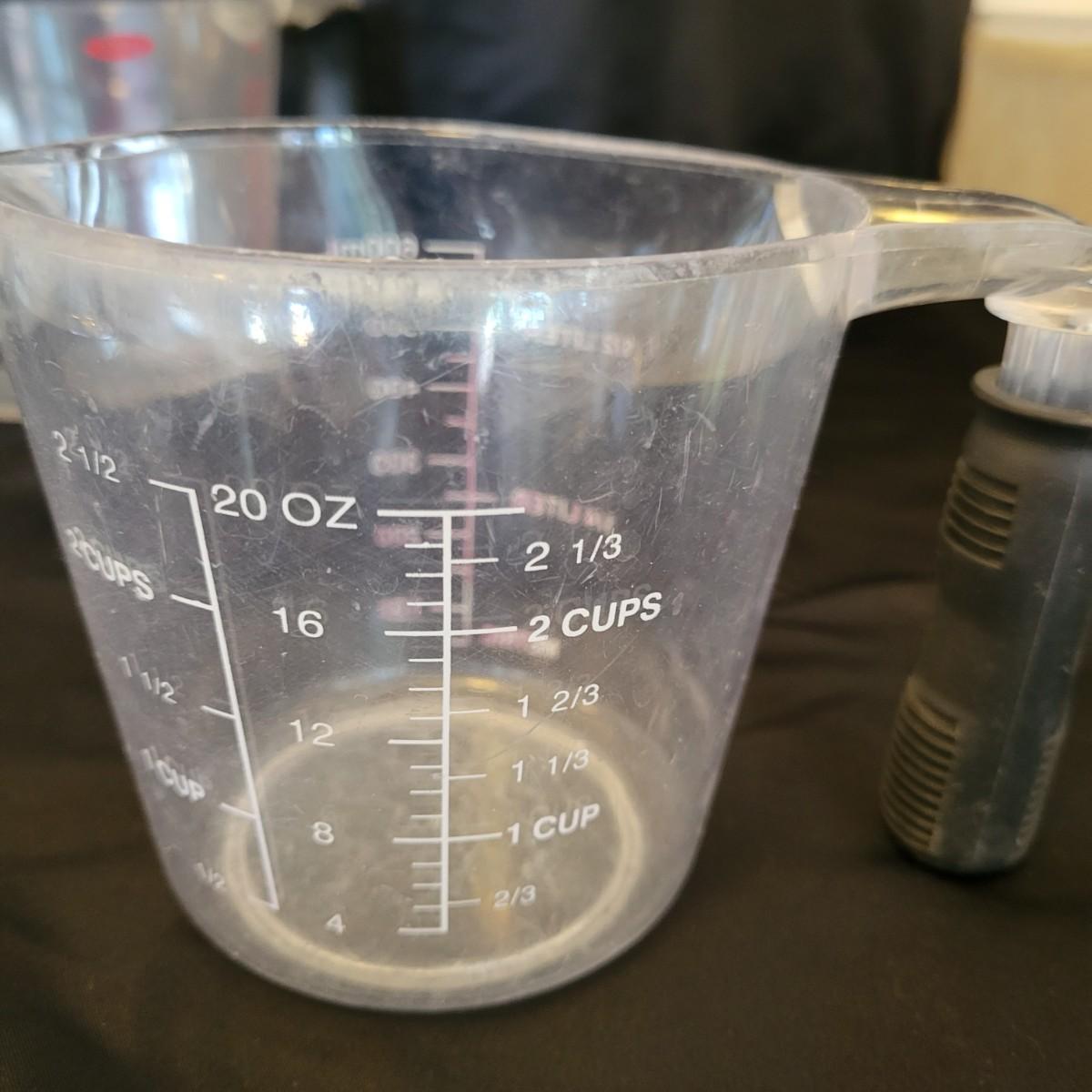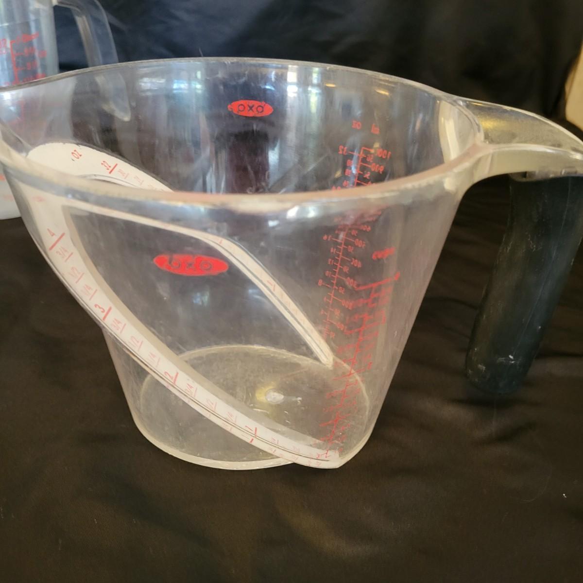 An assortment of measuring cups in good condition, but some do show use. Included are three glass measuring cups: one made by Anchor Hocking, one by Pyrex and one by Oven Basics. Lot also includes three larger plastic measuring cups with volumes up to four cups. Shipping available