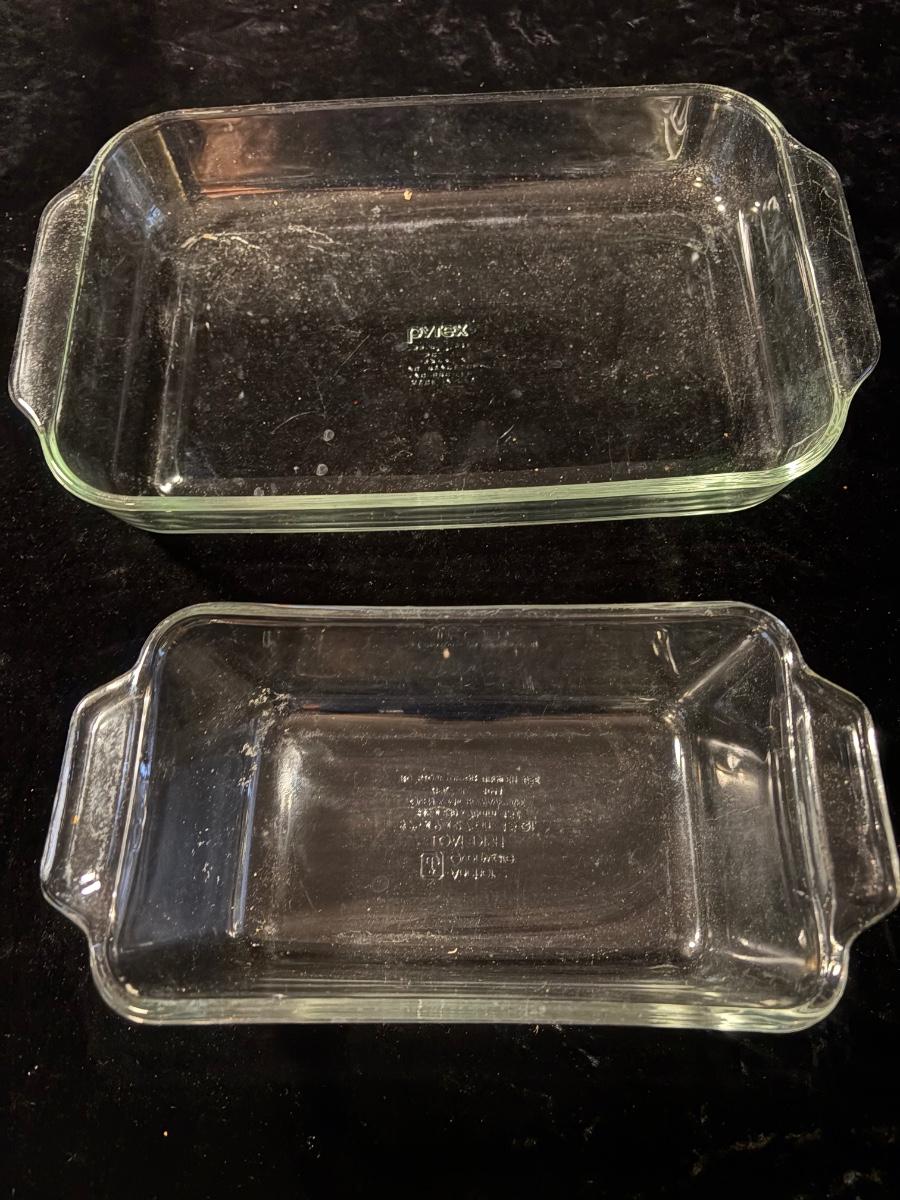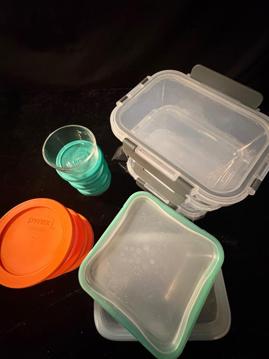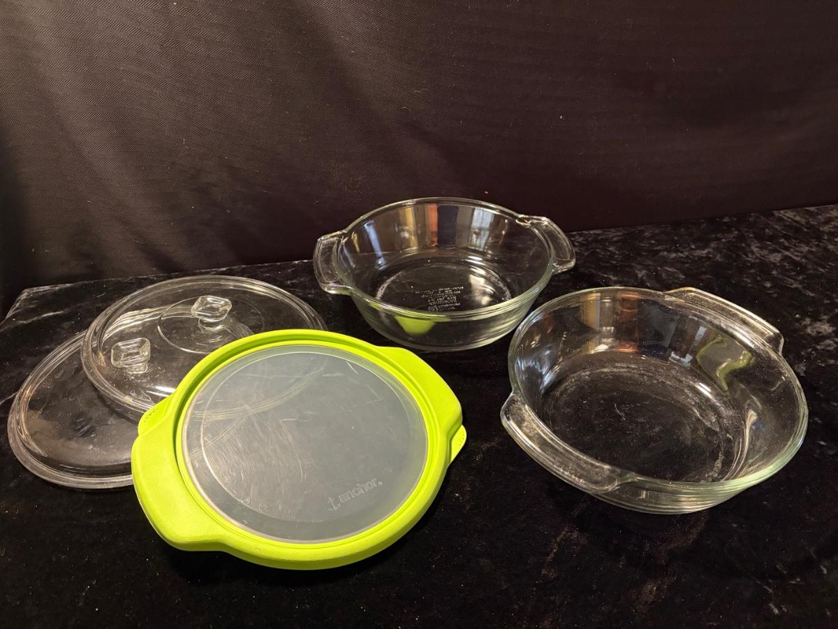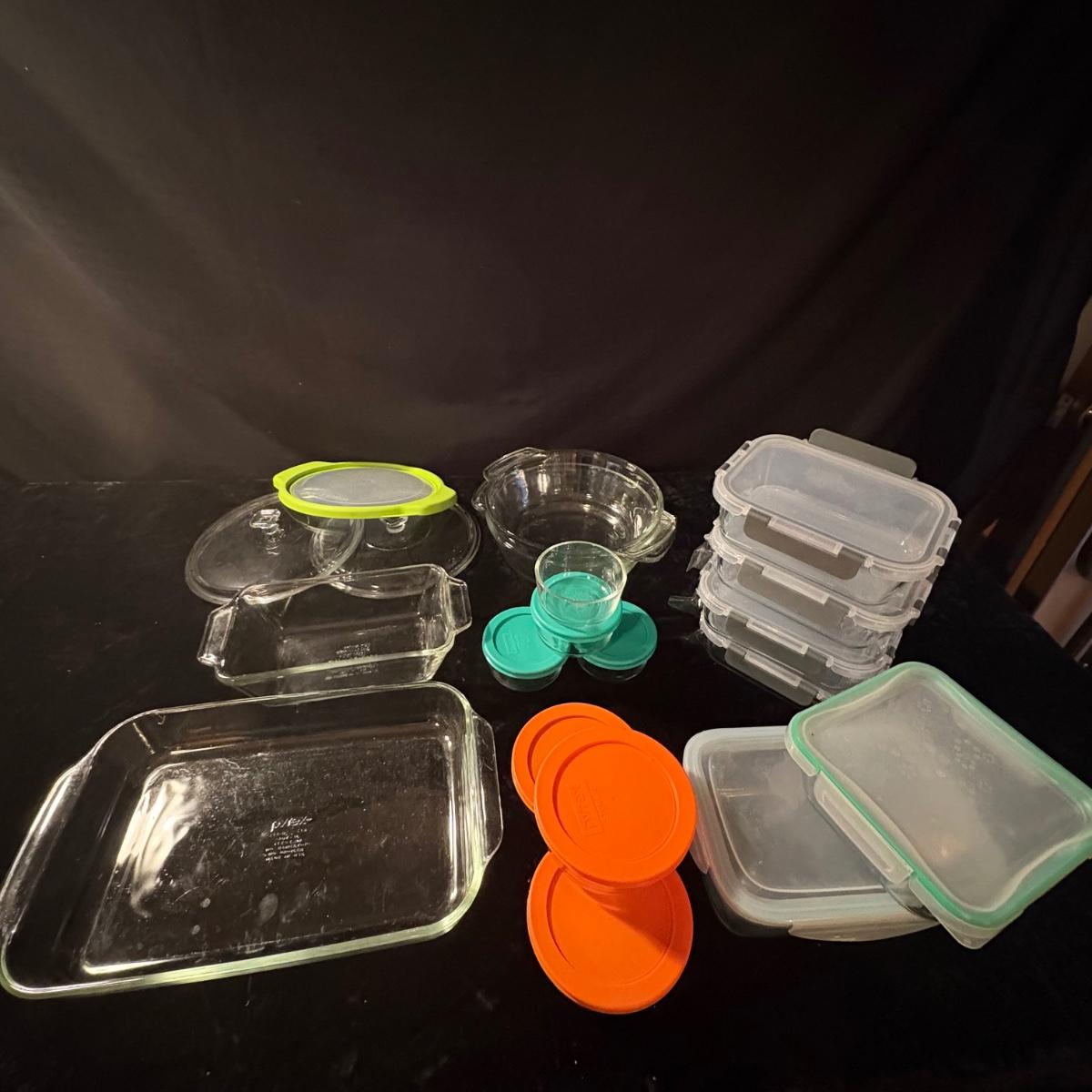 This large set features two 9” (2qt.) round casseroles w/lids, 13” x 9” and 5.15” x 9” casseroles, and 13 mixed size food storage containers, a mix of plastic lid-locking style and smaller glass Pyrex - all but one with lids.