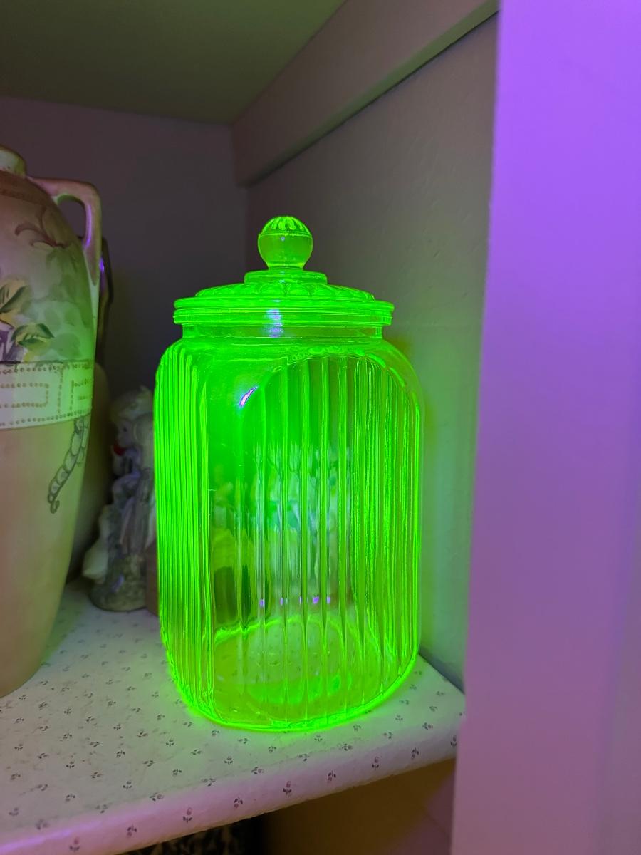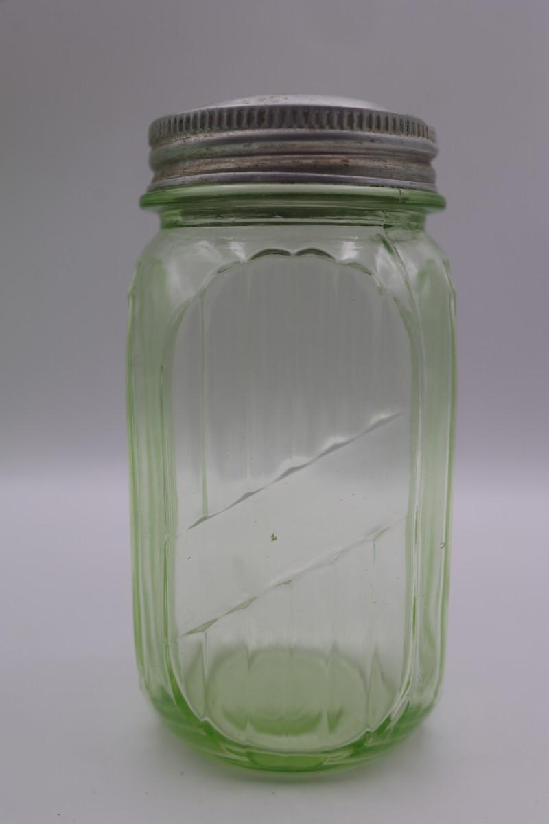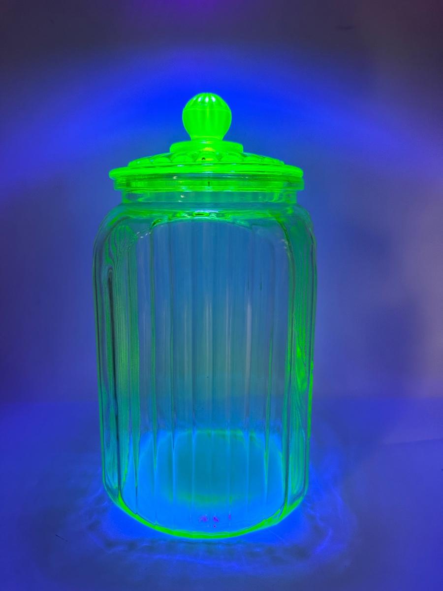 Smaller vintage uranium glass Anchor Hocking ribbed jar w/ screw lid.