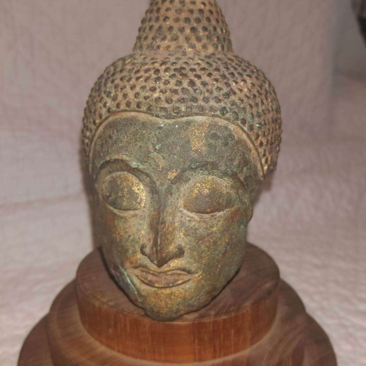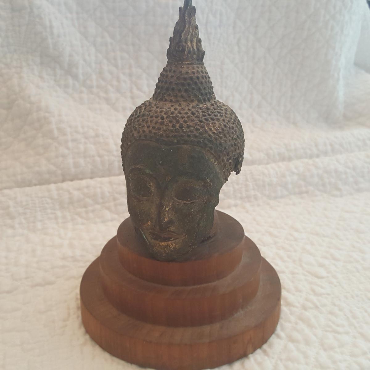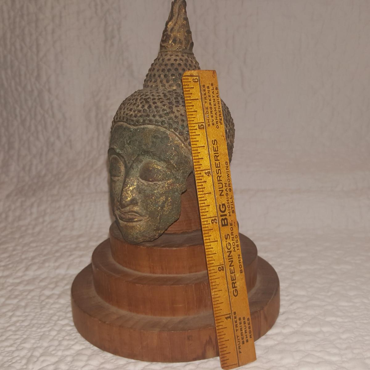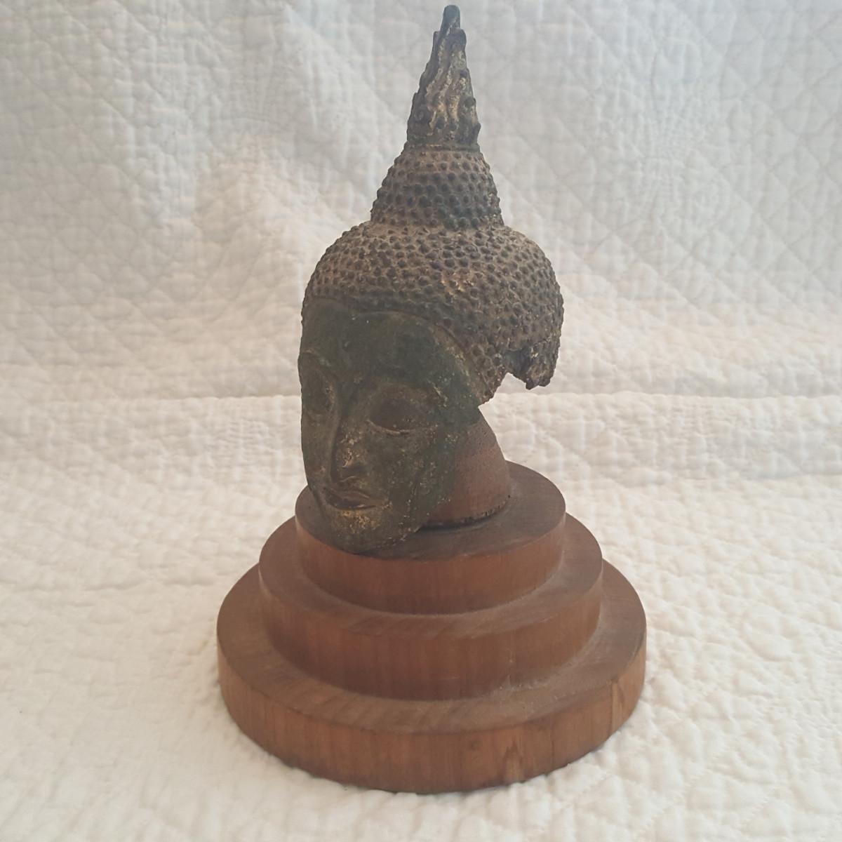 This auction lot is for an Ancient Cambodian (?) Statue Head. The statue appears to be a part of an old Budda, Diety or Goddess. This wonderful fragment of what surely must have been quite a magnificent ancient statue is in very good condition for its age and travels. The head measures about 6-inches tall not including the stand with a diameter of about 4-inches. It is carved/moulded from an ore-bearing stone of some type. This item is from the estate of US State Department employees who were stationed in Southeast Asia in the 1950s. Comes with the stand. The heirs tell us the collectors were living in Laos but traveled throughout the region in search of interesting items like this. We previously sold their collected items from Africa. NOTE: There is another similar item elsewhere in this auction. Where are you gonna find items like this on the open market. We are offering this item with no reserve.
