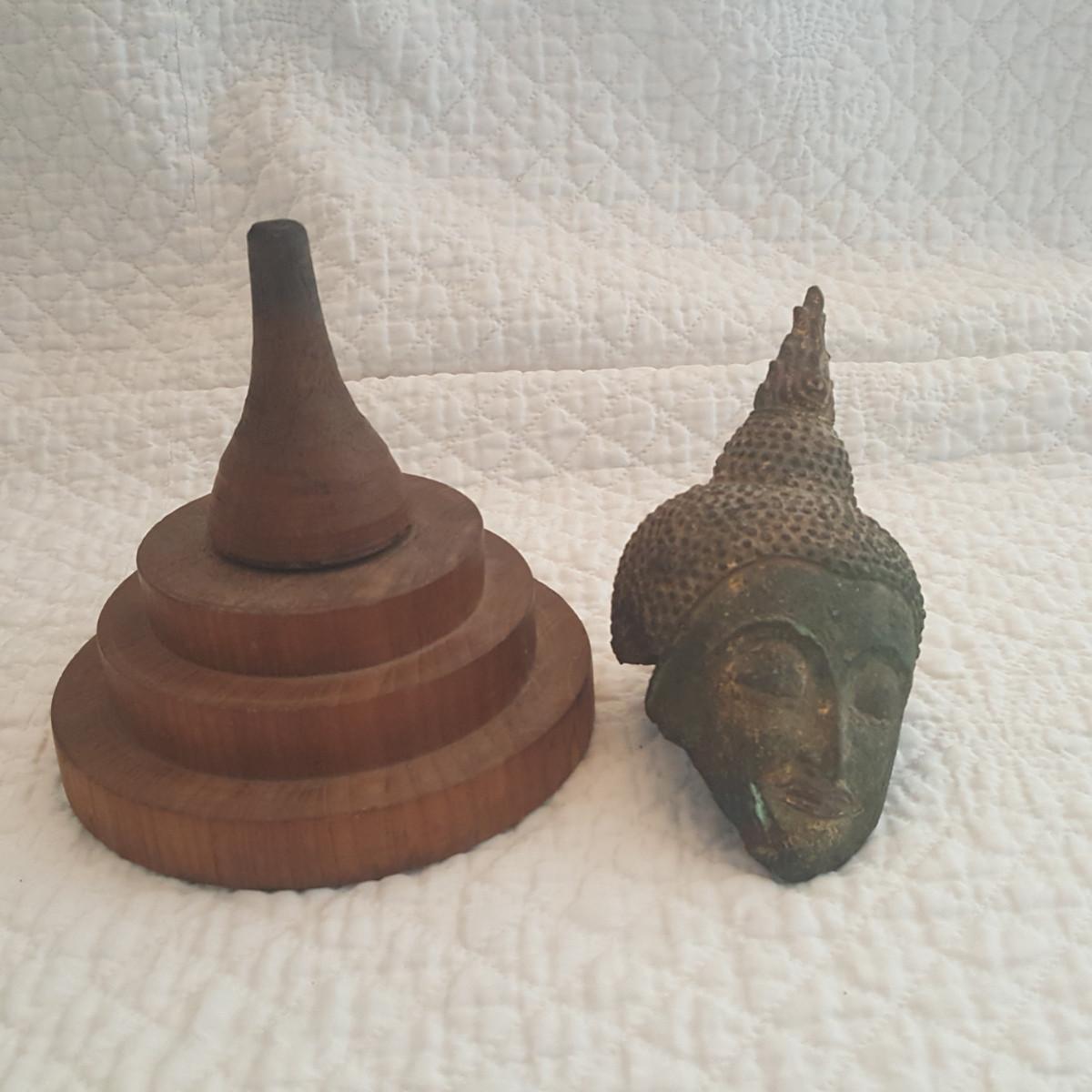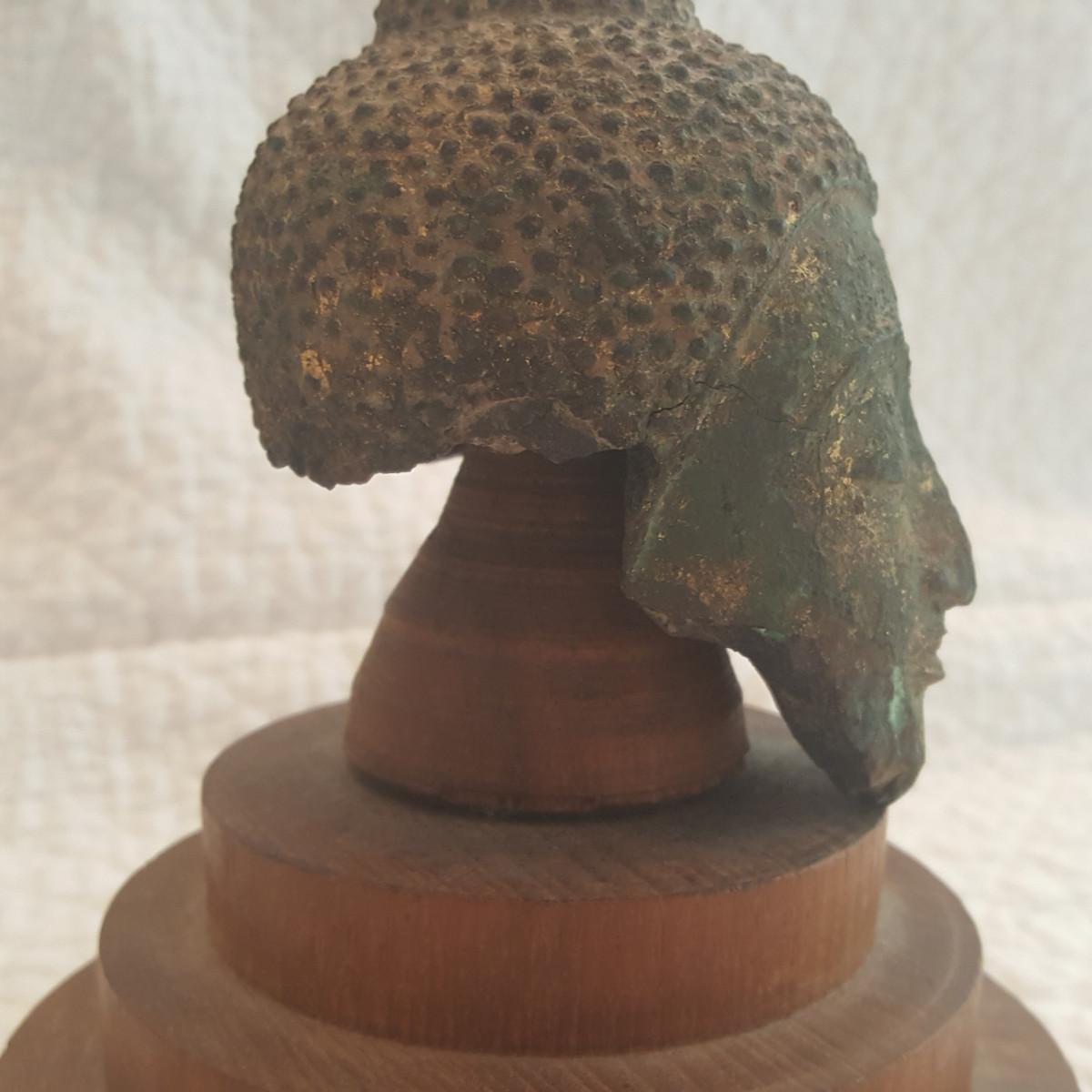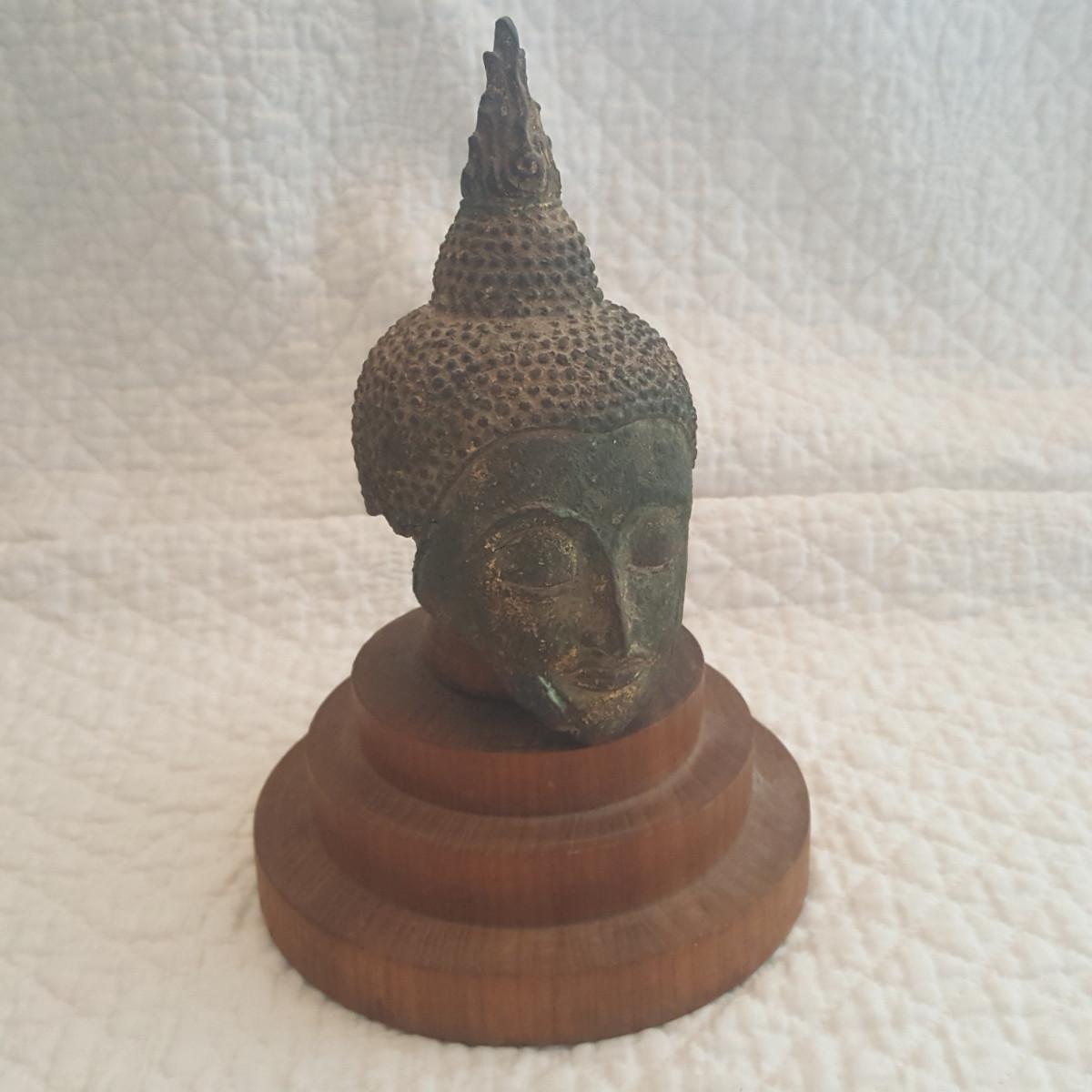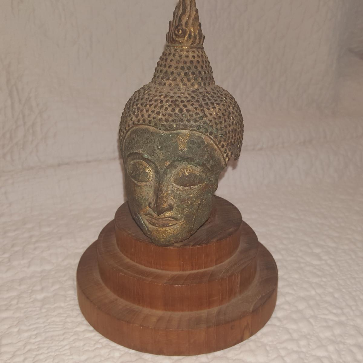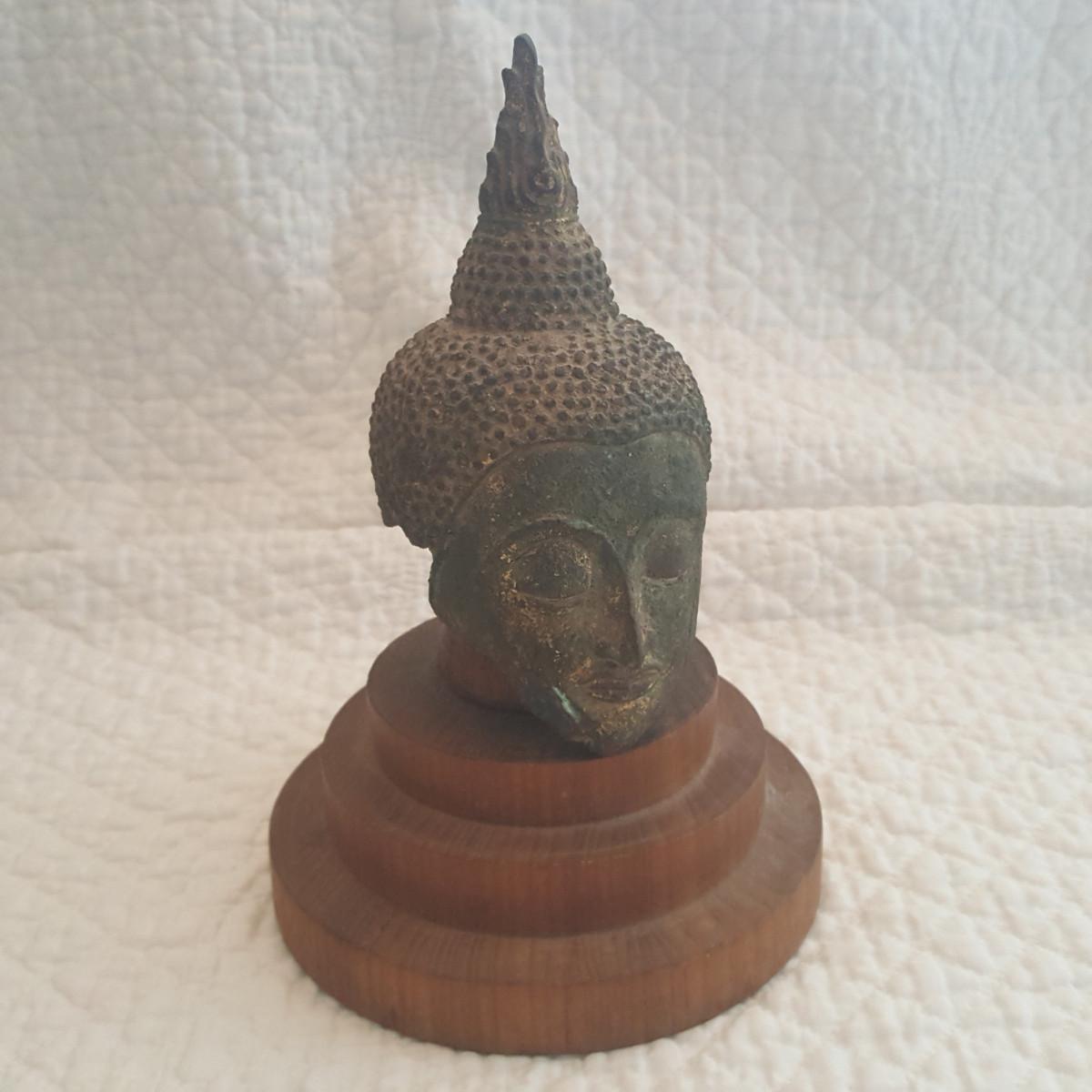 This auction lot is for an Ancient Cambodian (?) Statue Head. The statue appears to be a part of an old Budda, Diety or Goddess. This wonderful fragment of what surely must have been quite a magnificent ancient statue is in very good condition for its age and travels. The head measures about 6-inches tall not including the stand with a diameter of about 4-inches. It is carved/moulded from an ore-bearing stone of some type. This item is from the estate of US State Department employees who were stationed in Southeast Asia in the 1950s. Comes with the stand. The heirs tell us the collectors were living in Laos but traveled throughout the region in search of interesting items like this. We previously sold their collected items from Africa. NOTE: There is another similar item elsewhere in this auction. Where are you gonna find items like this on the open market. We are offering this item with no reserve.