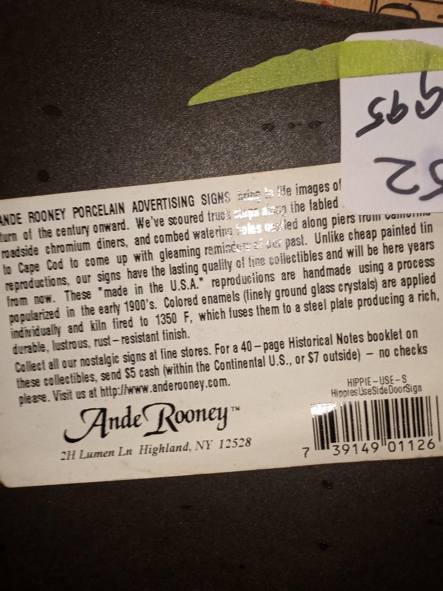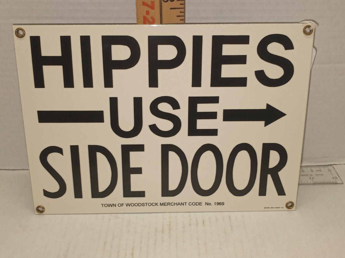Ande Rooney Enameled Porcelain Metal Sign Hippies Use Side Door