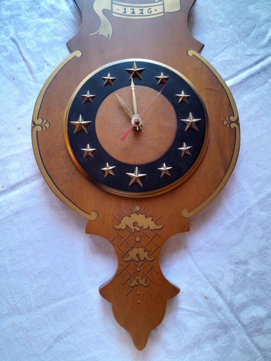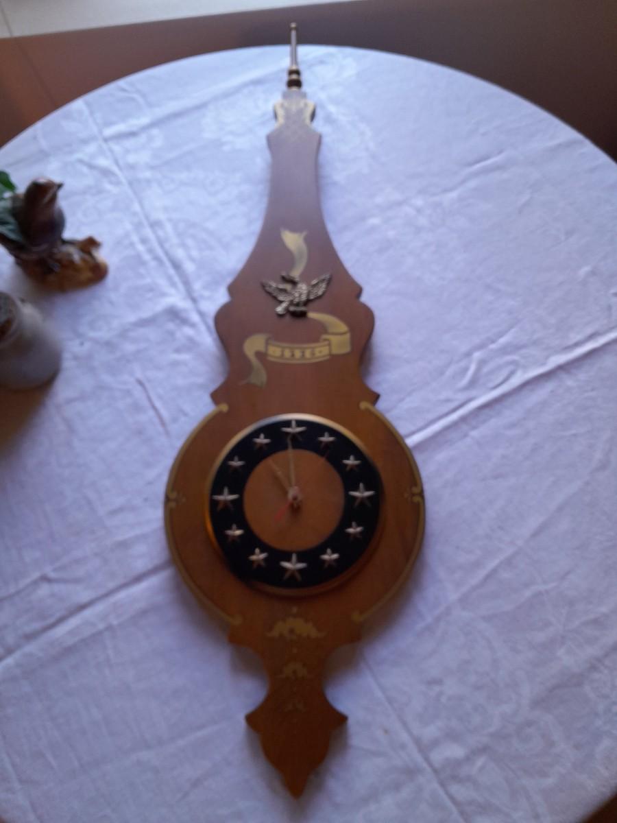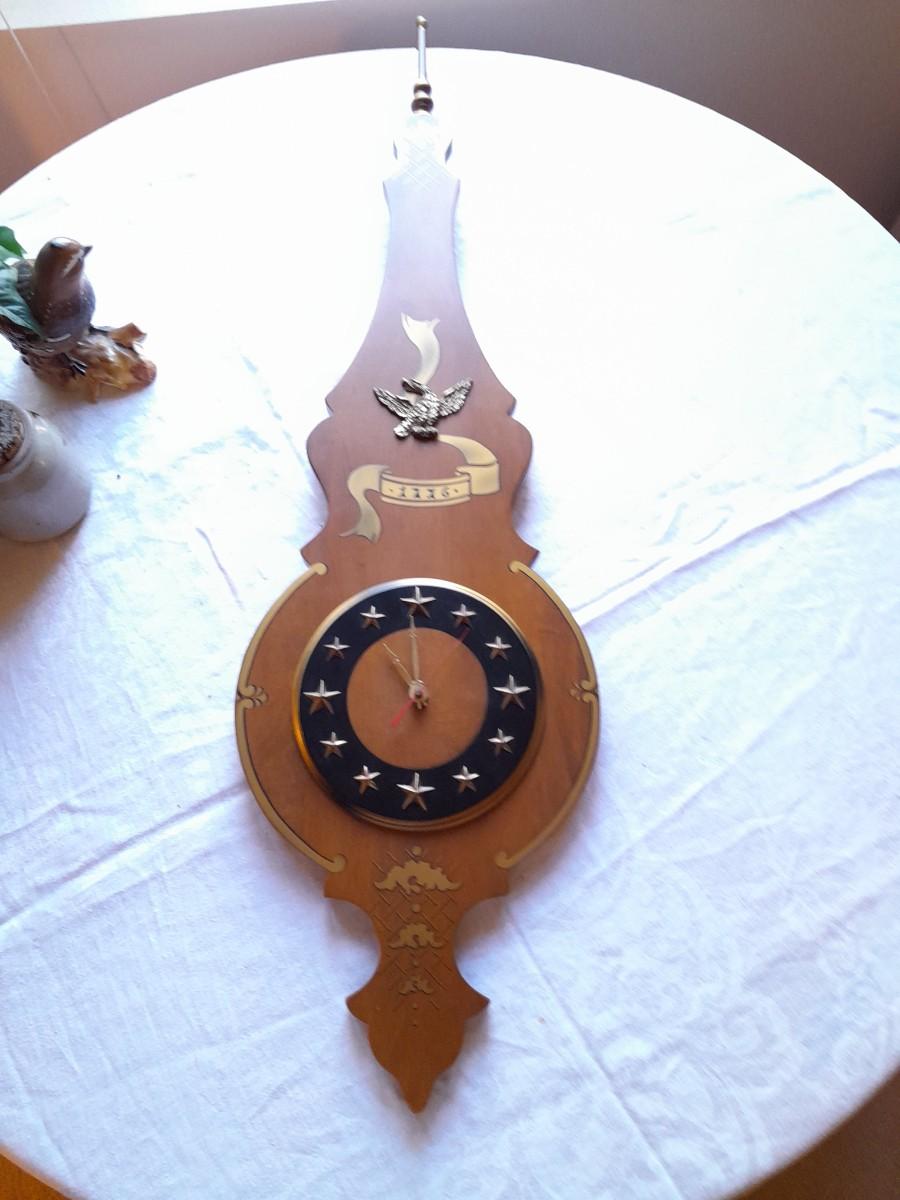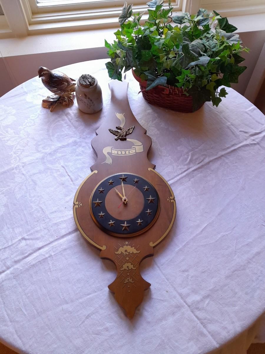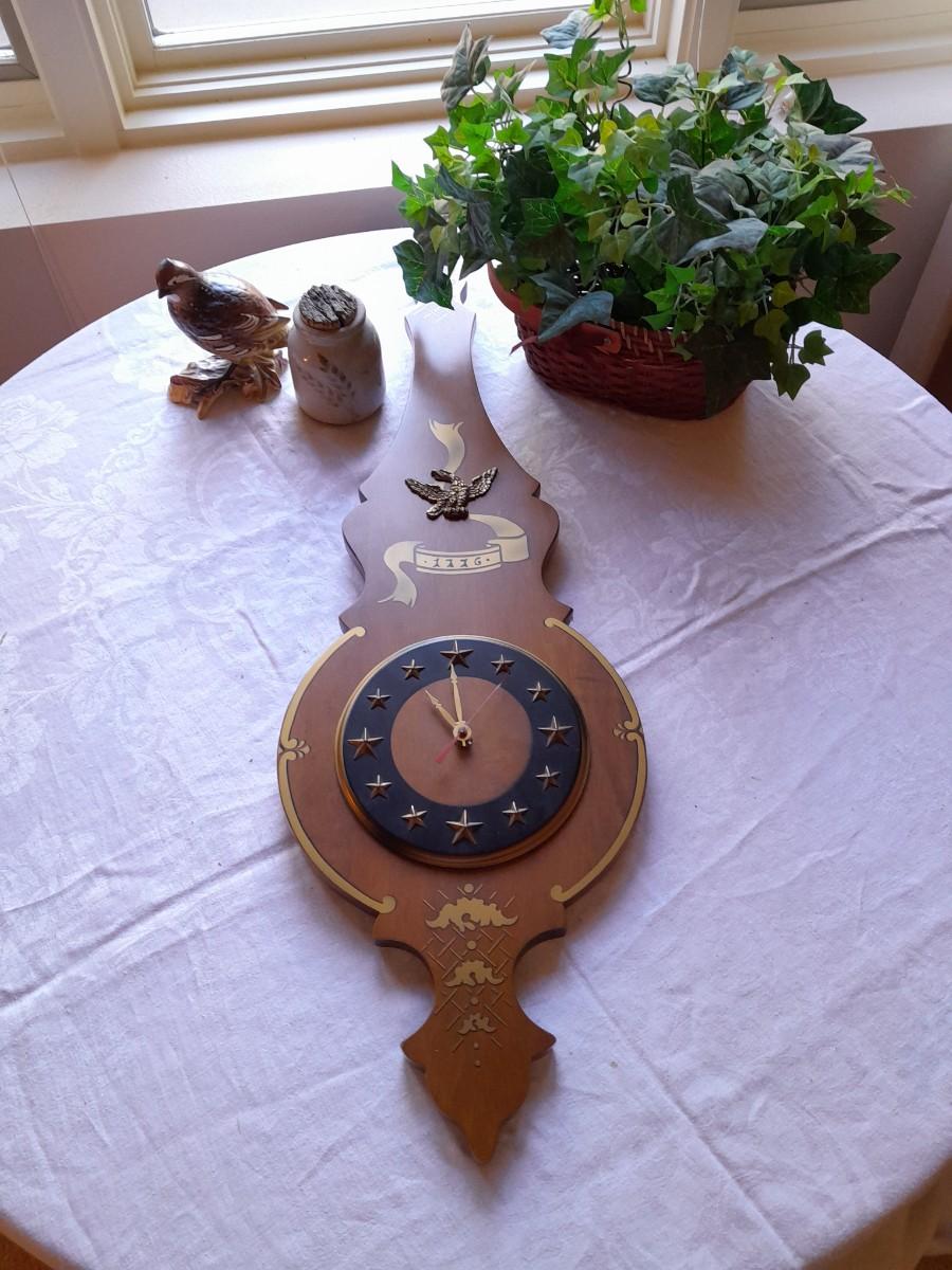 36" ANDOVER WALL CLOCK 1776 MADE BY THE TELL CITY CHAIR COMPANY, FAUX IVY IN A BASKET, PORCELAIN QUAIL AND A SMALL SIGNED CORKED CROCK