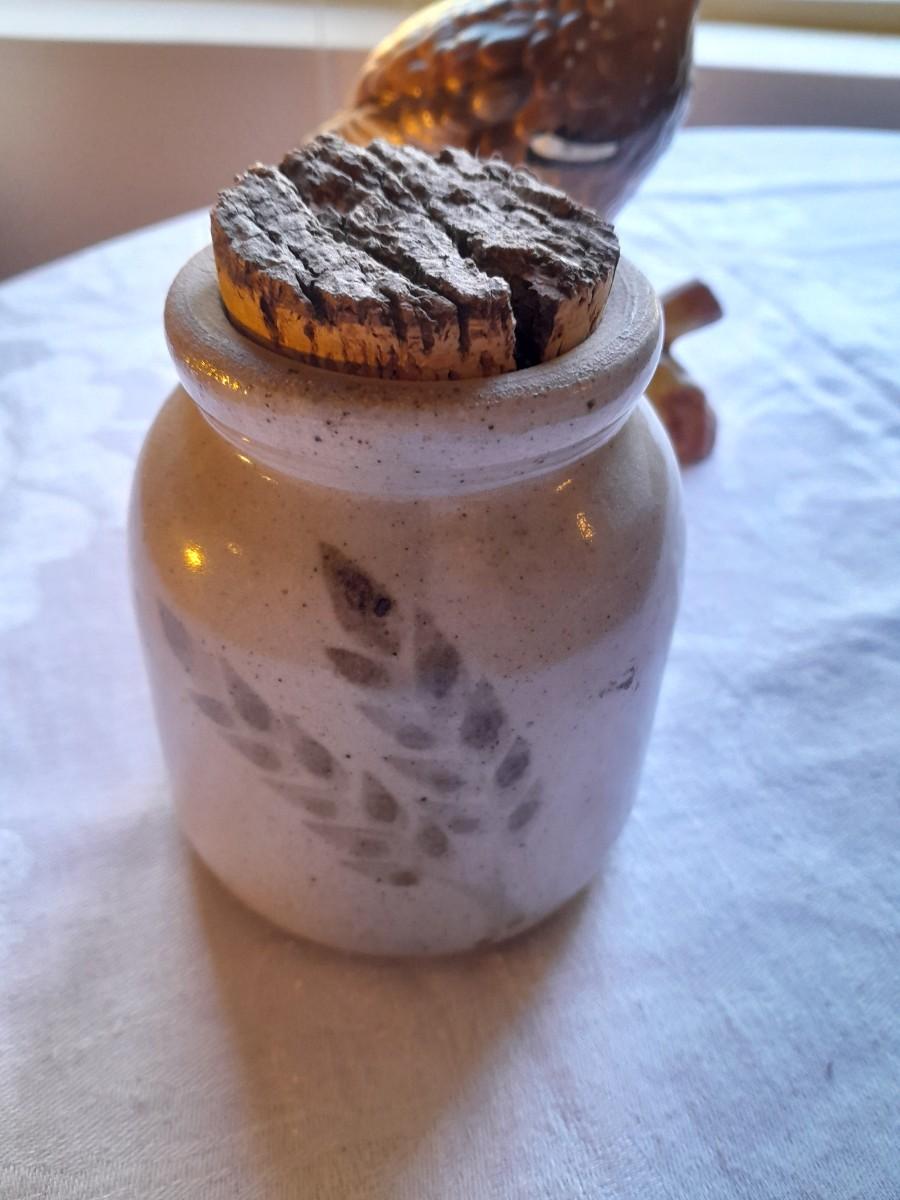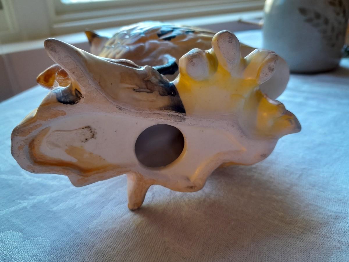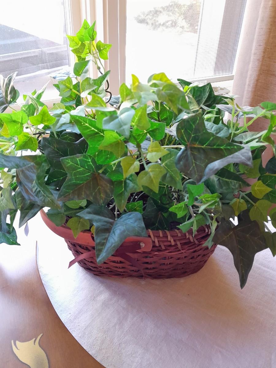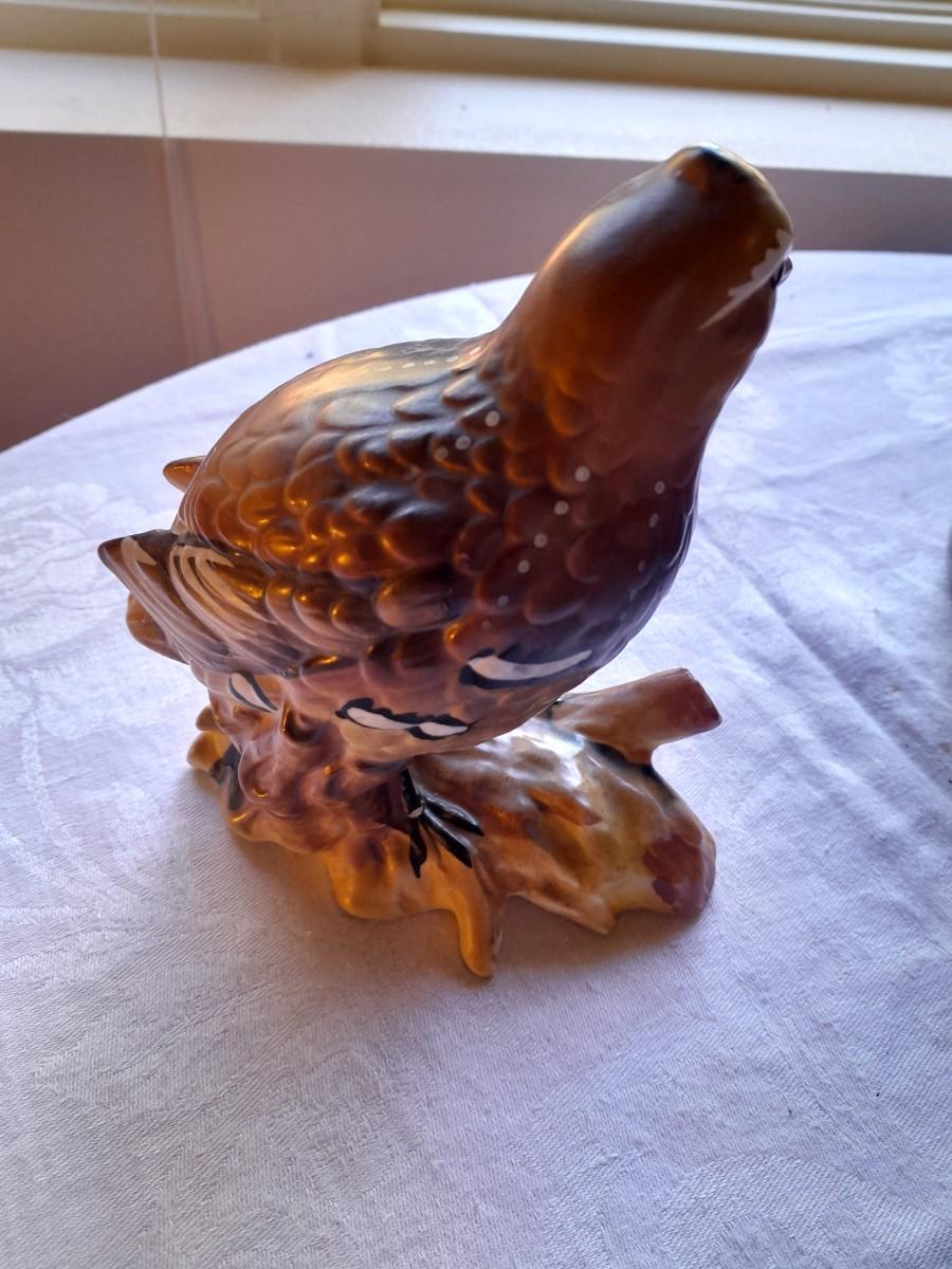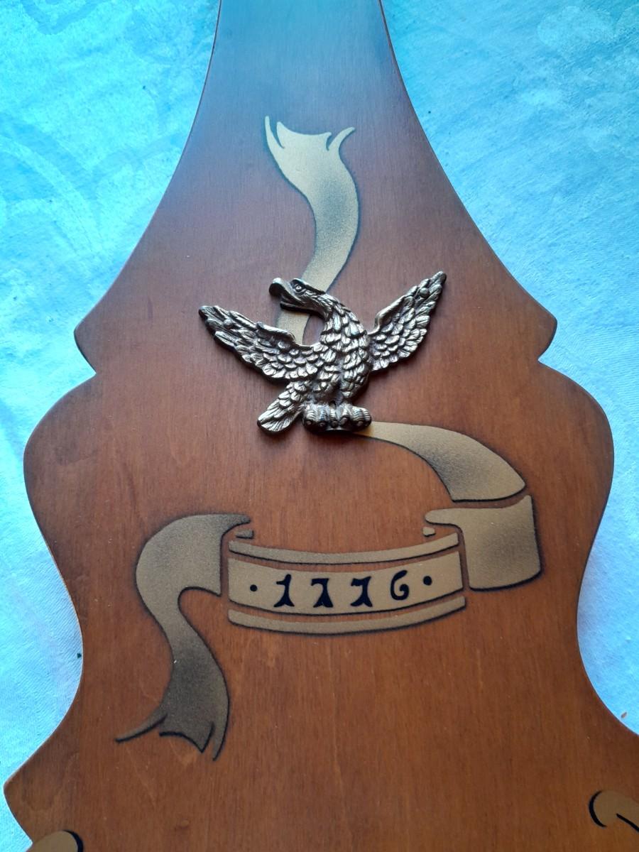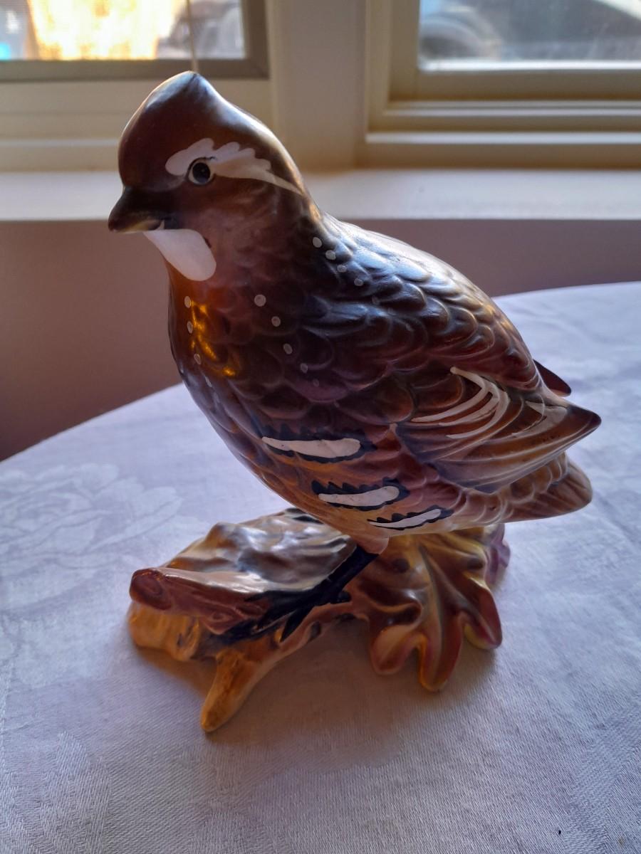 36" ANDOVER WALL CLOCK 1776 MADE BY THE TELL CITY CHAIR COMPANY, FAUX IVY IN A BASKET, PORCELAIN QUAIL AND A SMALL SIGNED CORKED CROCK