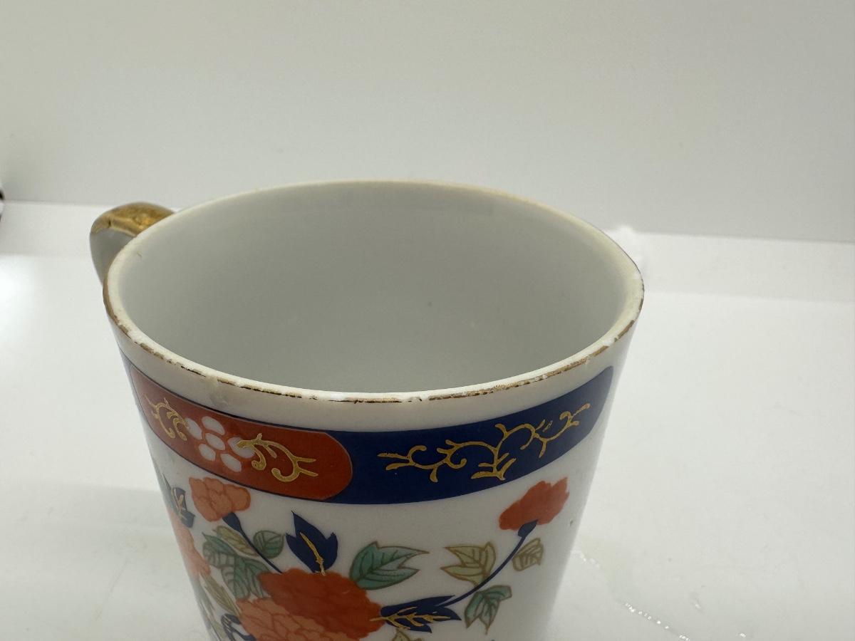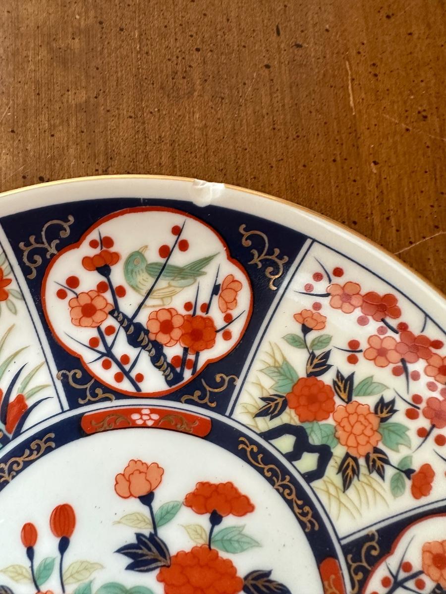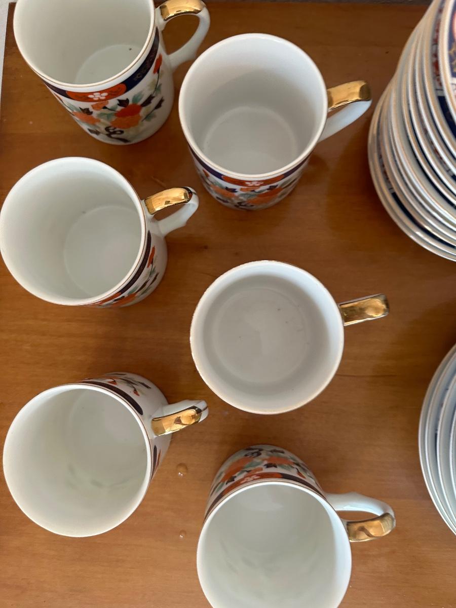 One plate has a small chip, see last pictures. One cup had a rough edge, see last pictures.