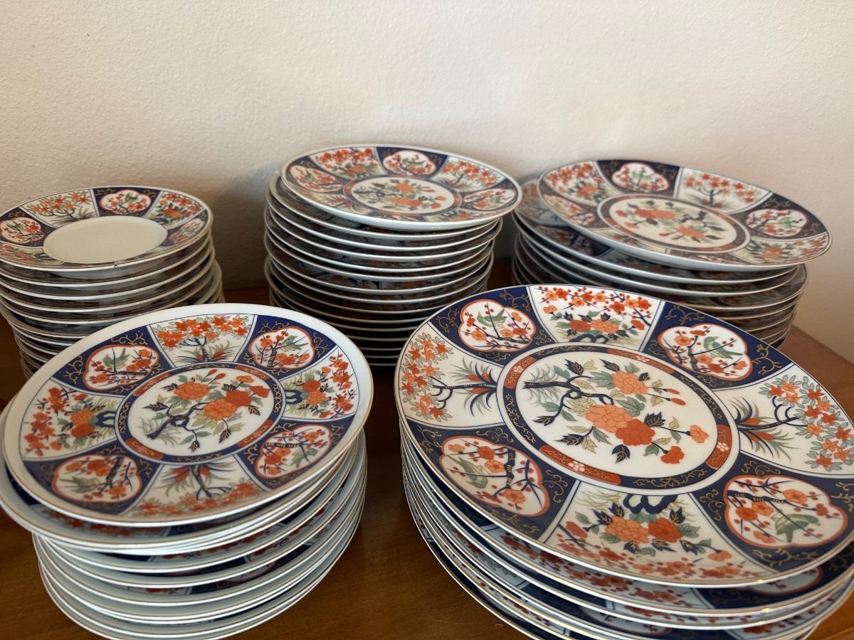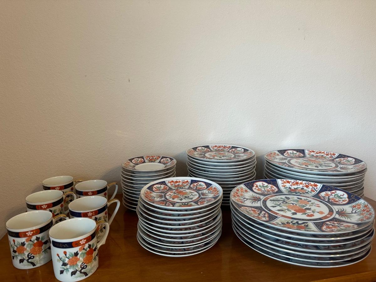6 cups, 12 saucers. 12 salad plates, 12 smaller plates, 18 dinner plates