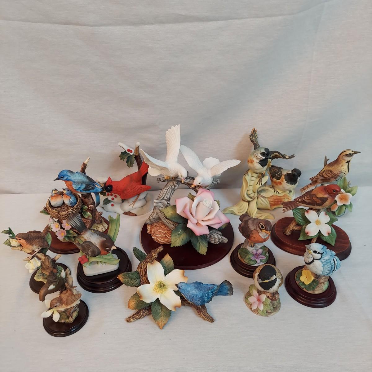 Approximately 14 porcelain bird figurines. Nine are Andrea by Sadek. Some are other brands while others are unmarked. The smallest Chickadee is approximately 4" tall. The largest piece is the dove with rose and it's approximately 7" x 7" x 9"H. Shipping available. Shipping certain items can be costly. We suggest contacting our preferred local shipping provider, Postage Express, with dimensions and getting an estimate before bidding: (828) 670-5501 or postageexpress@yahoo.com.