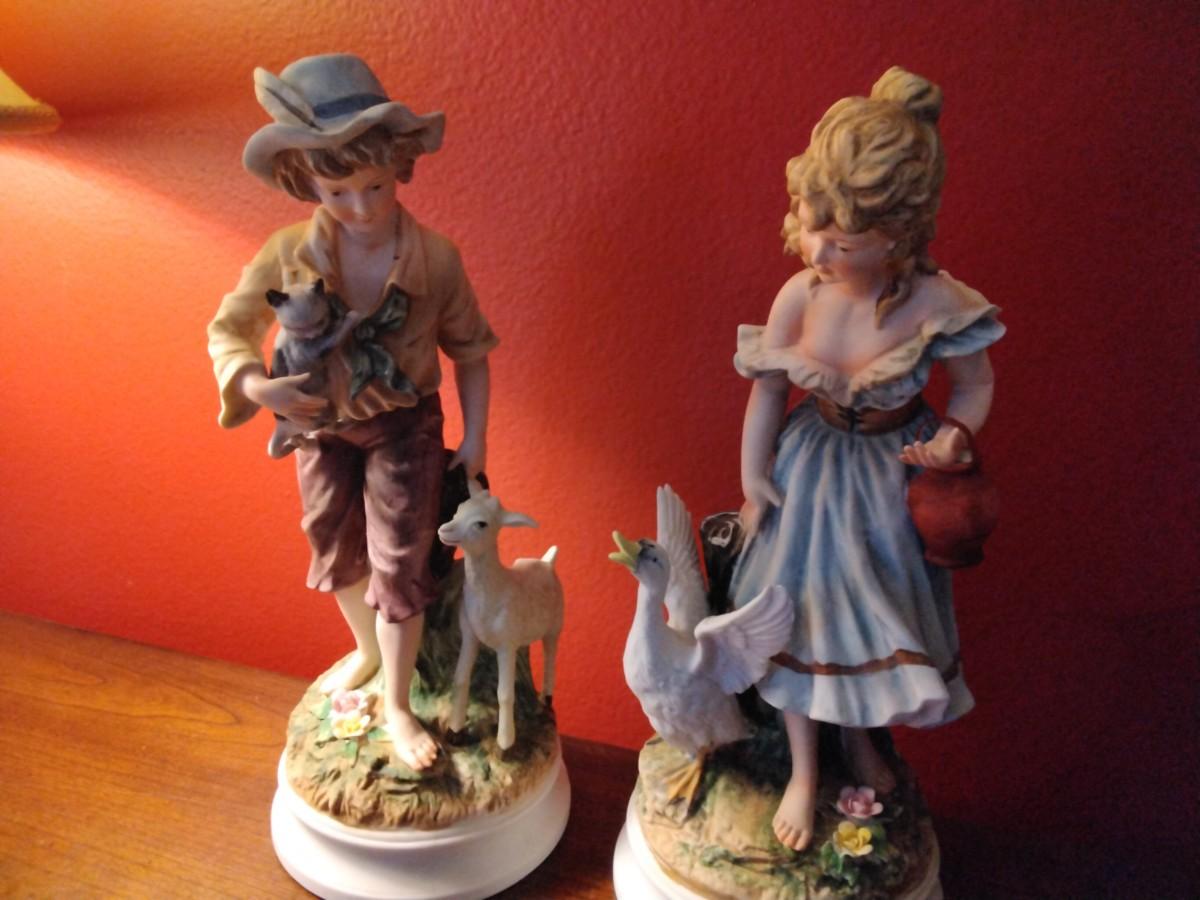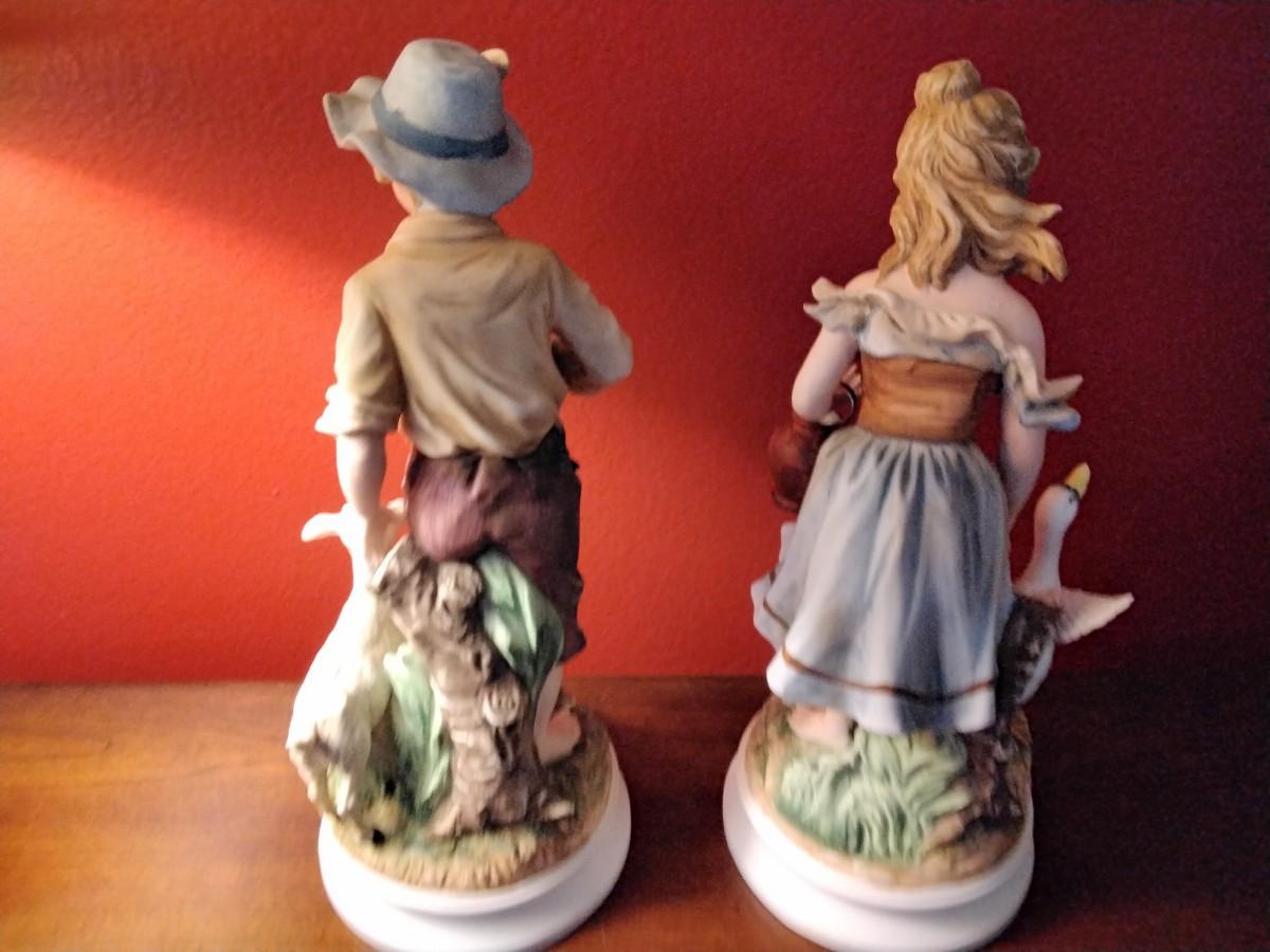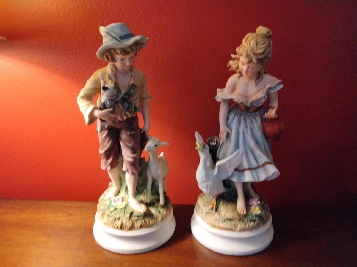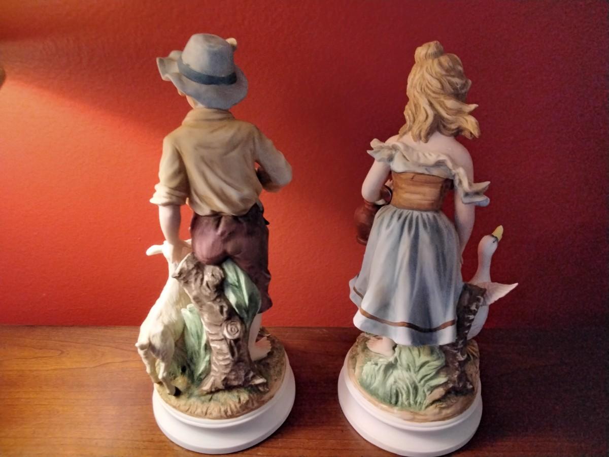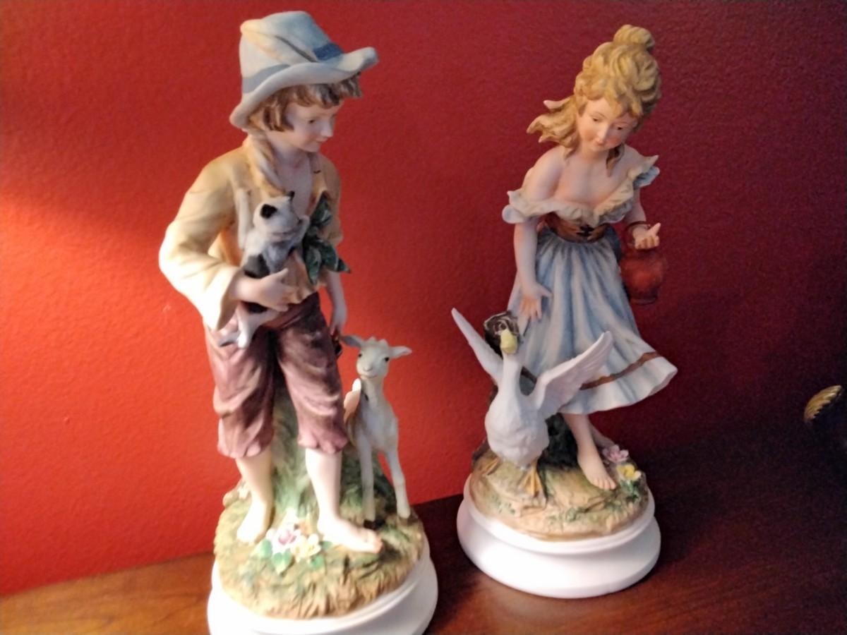 These two figures feature a girl with a duck, and a boy with a goat, and are approximately 12.5" tall. Both figures are numbered # 7893, and are in mint condition. These figurines from Andrea by Sadek will be a wonderful addition to your decor. No Chips, Cracks, or Repairs of any sort. Tier 3.