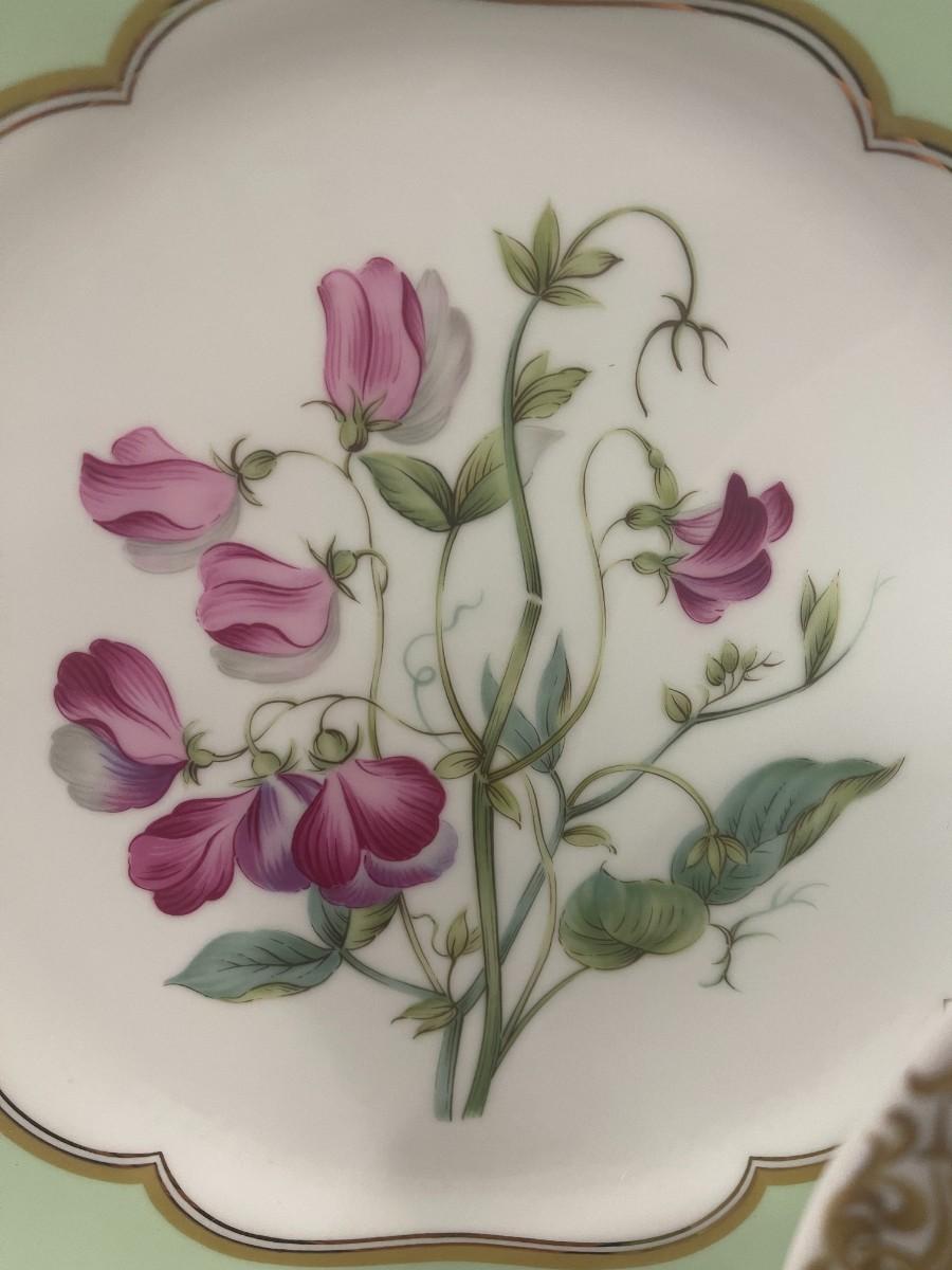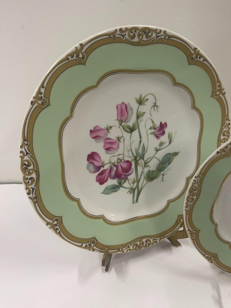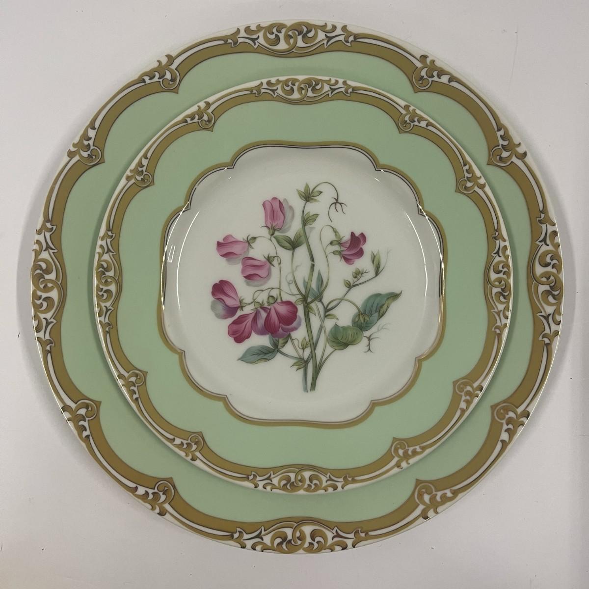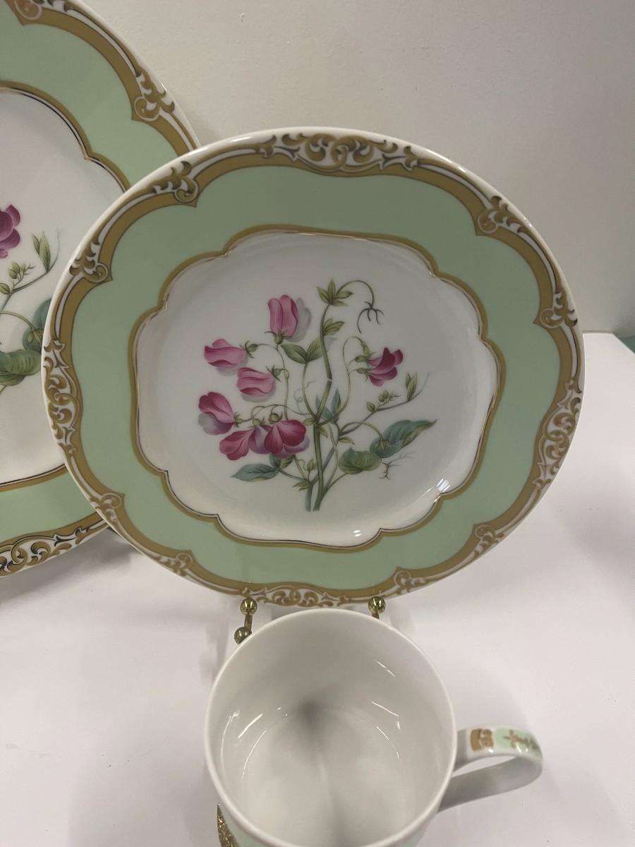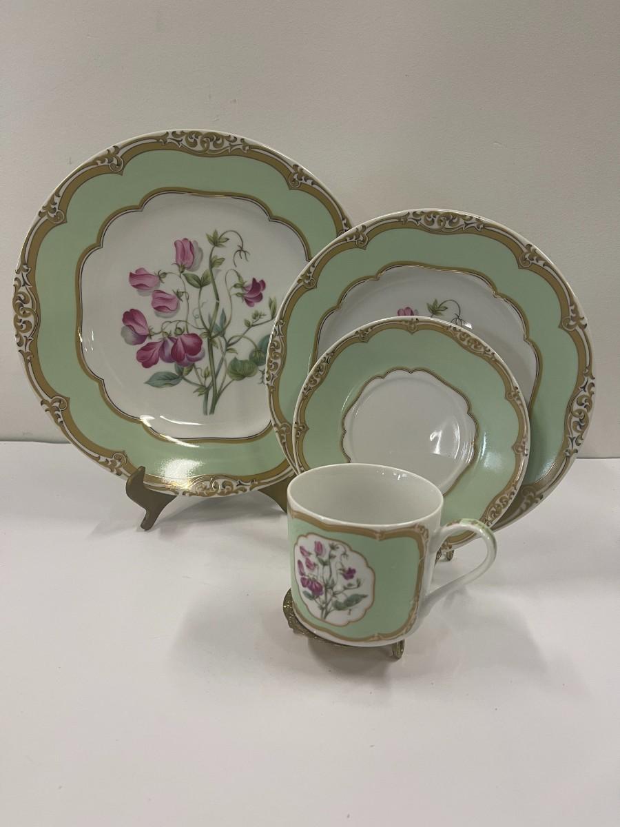 The theme of this place setting was adapted from a French porcelain dessert set made for the US President James K Polk in 1846. It is called the Winterthur adaptation and was made in Japan by Andrea for Sadek. The center is white with a spray of pink flowers. The border is light green with a gilt rim. Dinner plate 10 1/2", Salad / Lunch plate 8", Saucer 6", Cup 2 1/2" tall x 3" wide. Excellent condition.