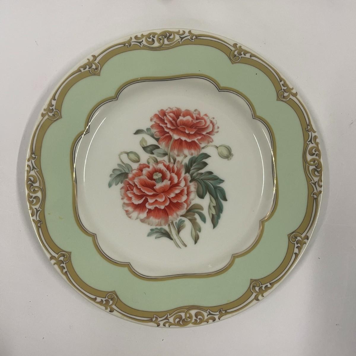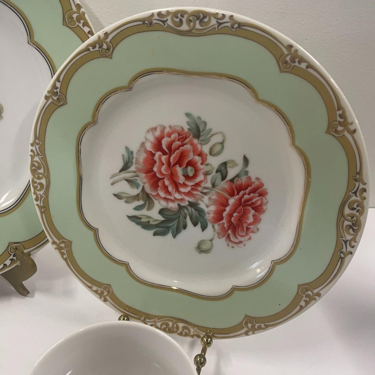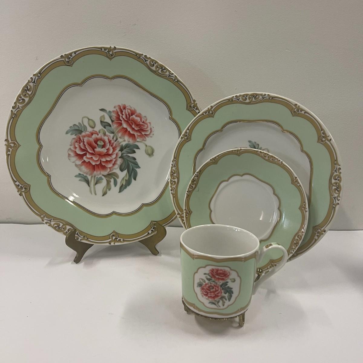 The theme of this place setting was adapted from a French porcelain dessert set made for the US President James K Polk in 1846. It is called the Winterthur adaptation and was made in Japan by Andrea for Sadek. The center is white with a spray of reddish, pink flowers. The border is light green with a gilt rim. Dinner plate 10 1/2", Salad / Lunch plate 8", Saucer 6", Cup 2 1/2" tall x 3" wide. Excellent condition. # 1136
