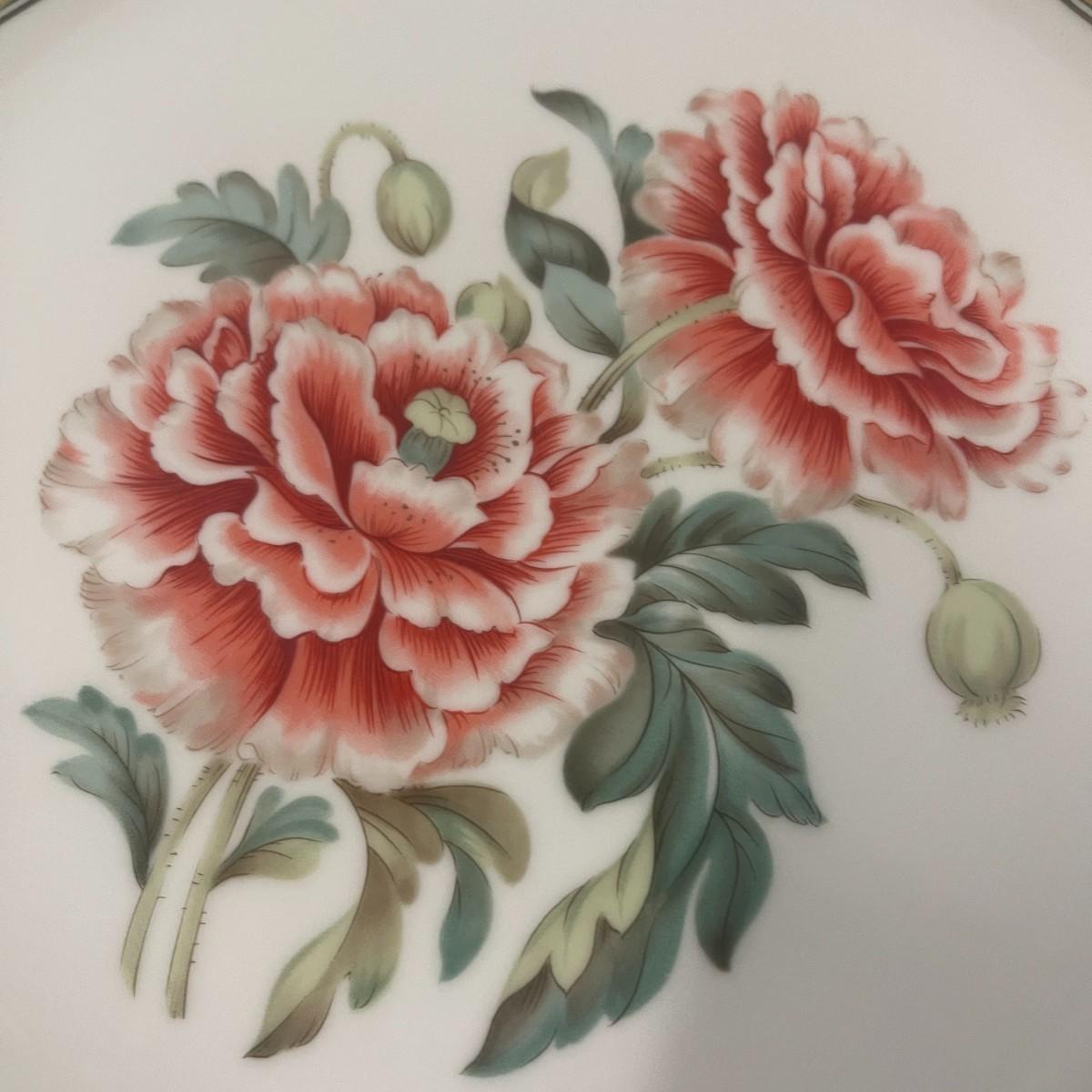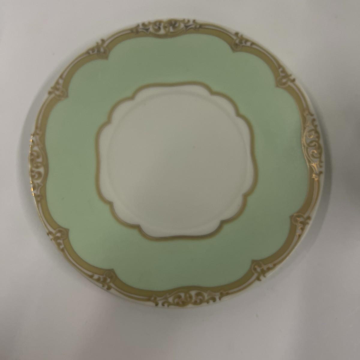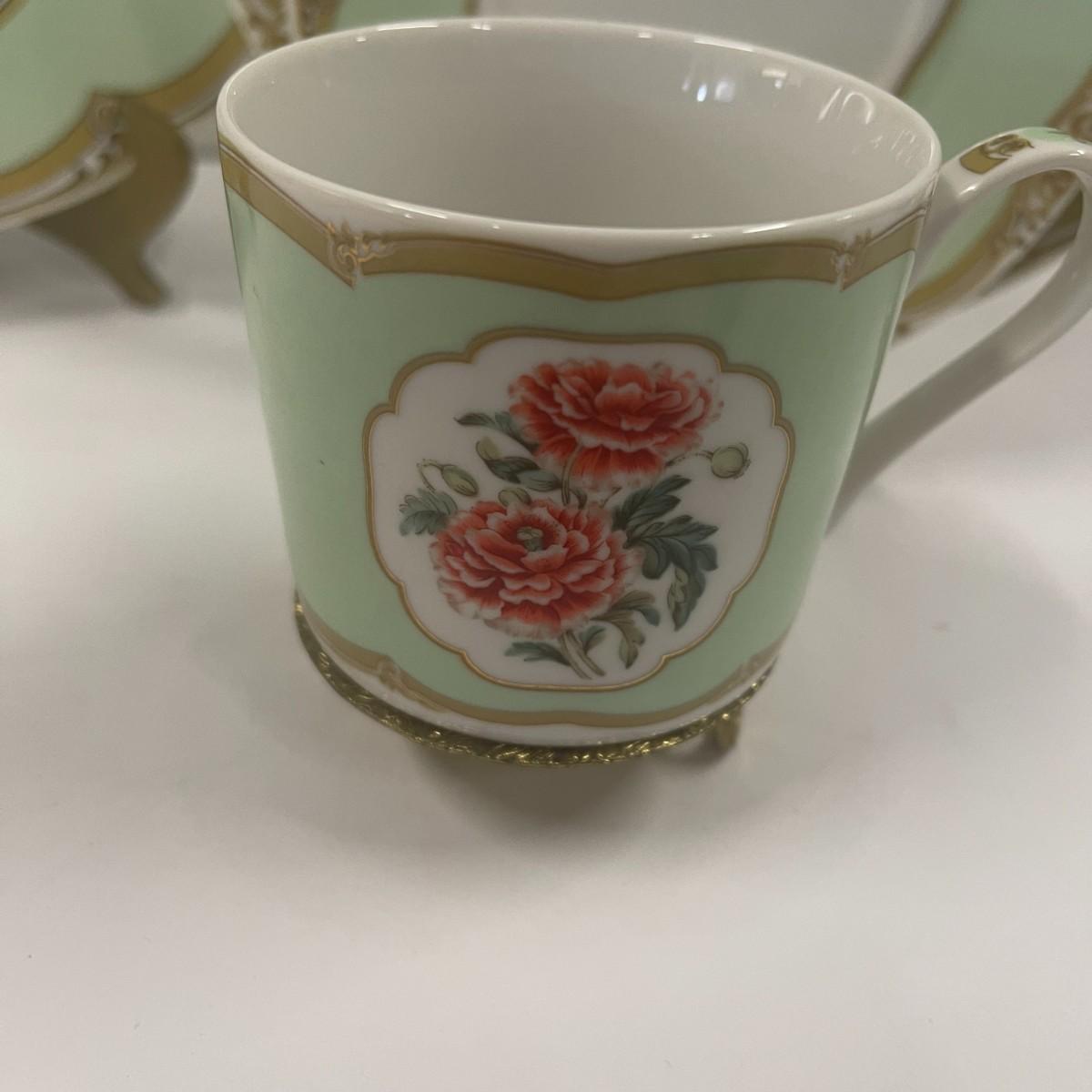 The theme of this place setting was adapted from a French porcelain dessert set made for the US President James K Polk in 1846. It is called the Winterthur adaptation and was made in Japan by Andrea for Sadek. The center is white with a spray of reddish, pink flowers. The border is light green with a gilt rim. Dinner plate 10 1/2", Salad / Lunch plate 8", Saucer 6", Cup 2 1/2" tall x 3" wide. Excellent condition. # 1136