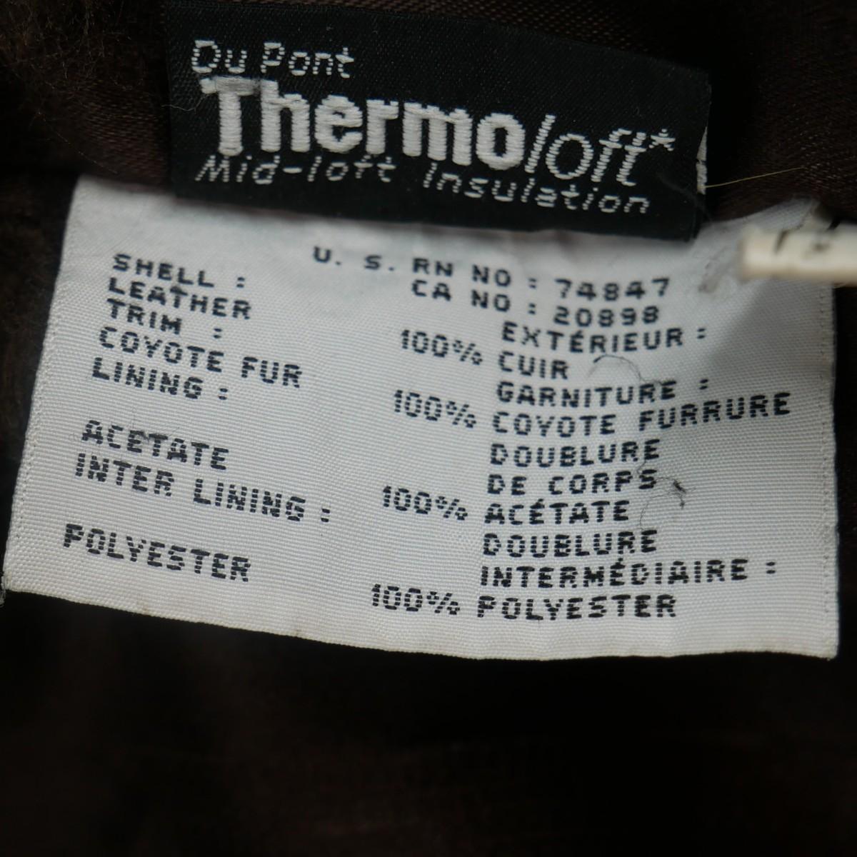 Andrew Marc New York genuine leather and coyote fur snow jacket. Du Pont Thermoloft mid-loft insulation with detachable hood and interior adjustable waist tie. Some minimal marks present, some leather maybe stretched or scuffed, interior by tag is snagged, and is missing one wooden tie on front. Photos represent most accurate condition possible. Overall good condition. Approximate measurements: across chest 20", shoulder to bottom 29.5", arm length 21". Weighs 7 lb. (F8)