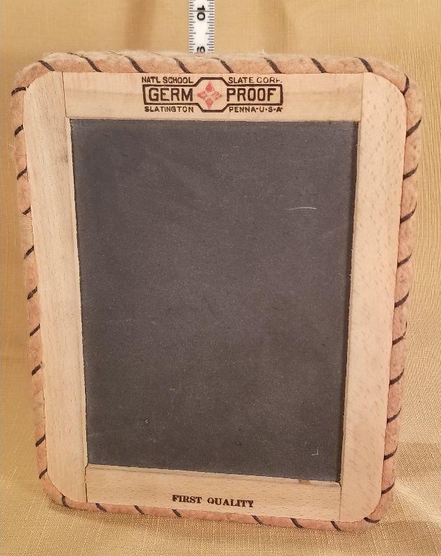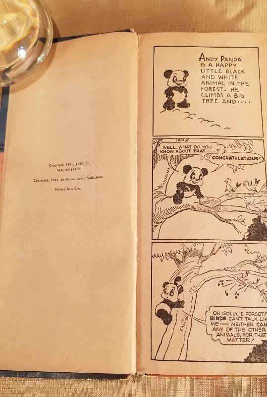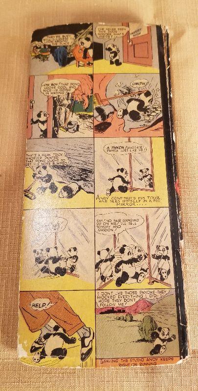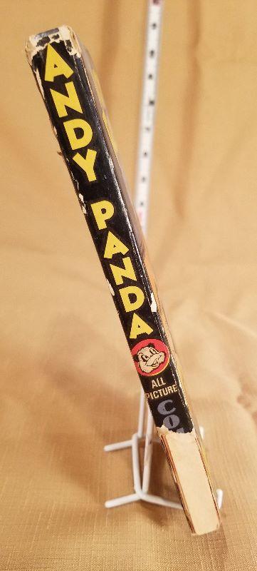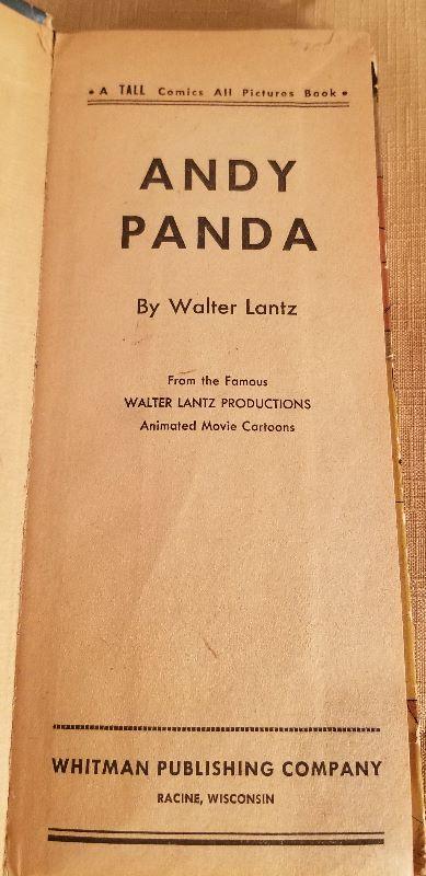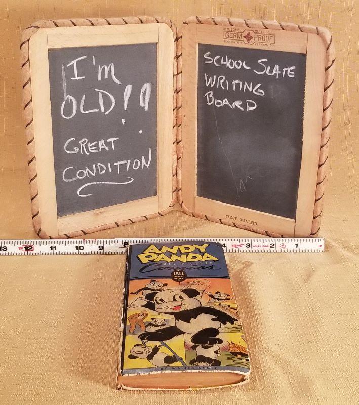Andy Panda Tall Book and Slate Chalk Board Book. Andy Panda all picture comics “Tall Comic Book” 1943. By Walter Lantz Productions. Printed in USA. Cover is worn and spine is missing bottom half of cover. Pages are yellowed but all are intact. Binding is good. Slate Chalk Board Book is by National Slate Corp., states “Germ Proof”, Slatington, Penn., USA First Quality. Edged with roping. Very cool.