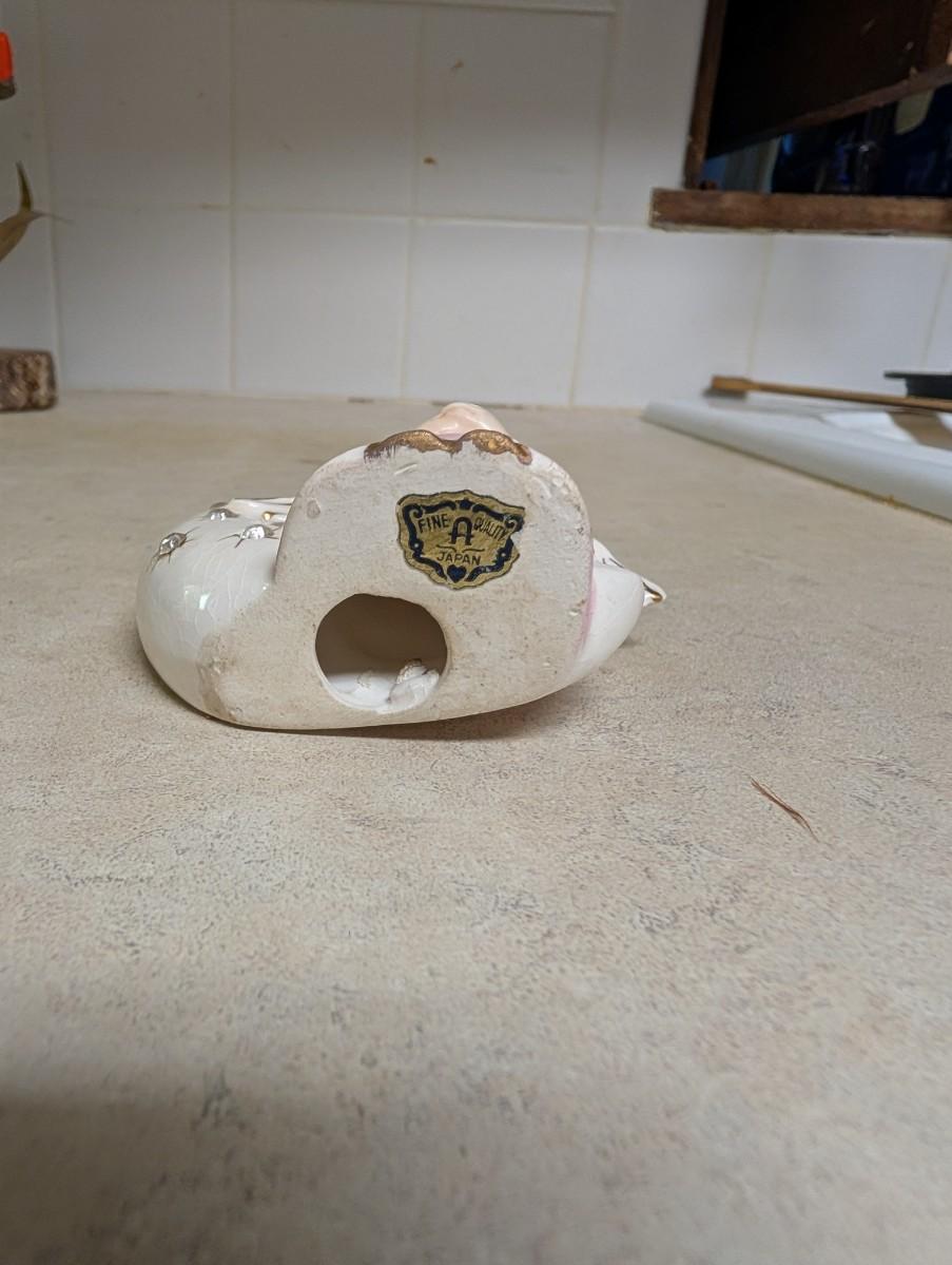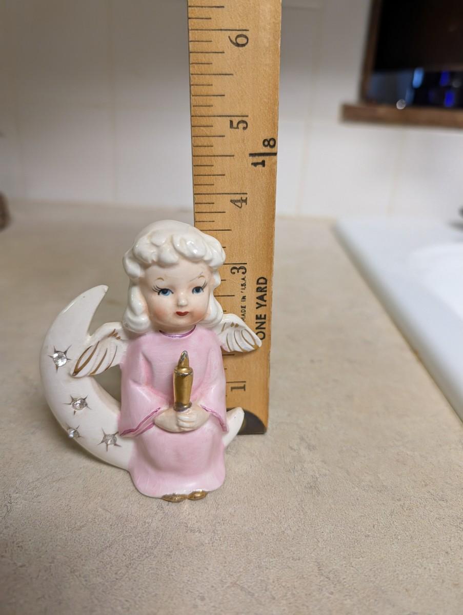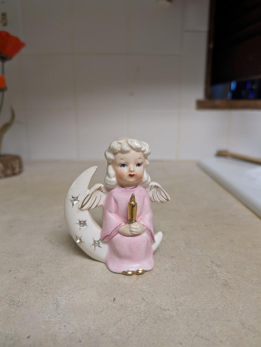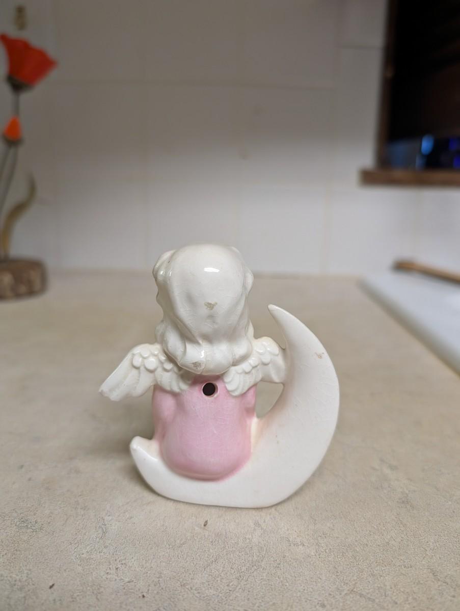 1950's ceramic pink angel figurine on crescent moon. Japan
