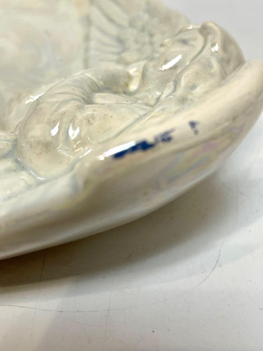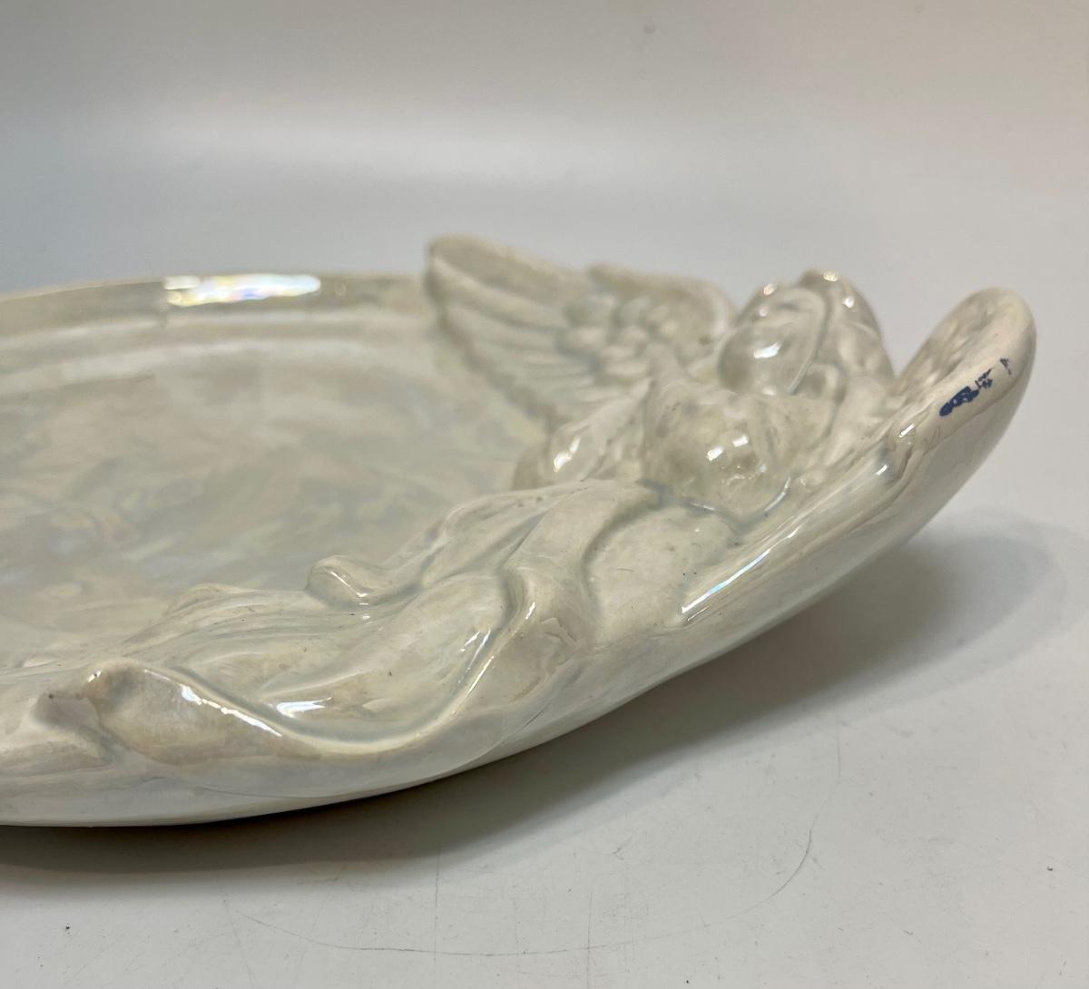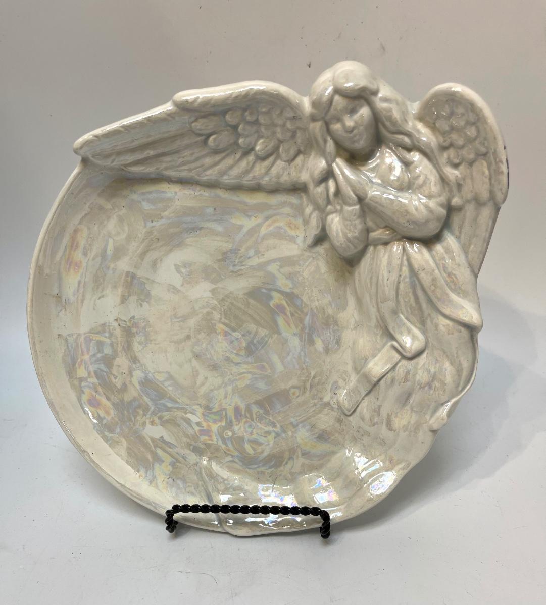 Ceramic White Iridescent Angel Plate. Good for display. Some wear along edge. About 8" size.