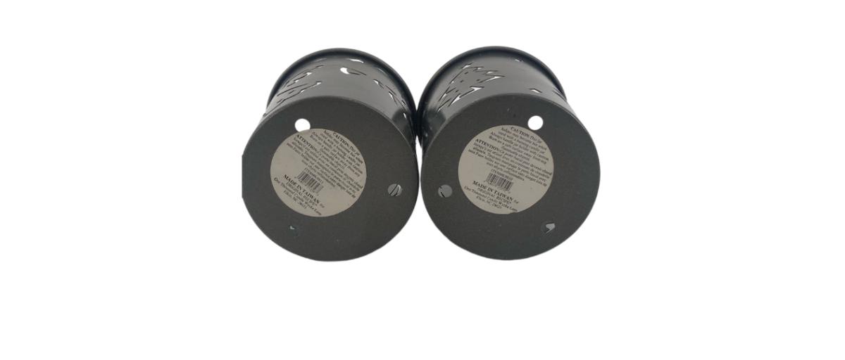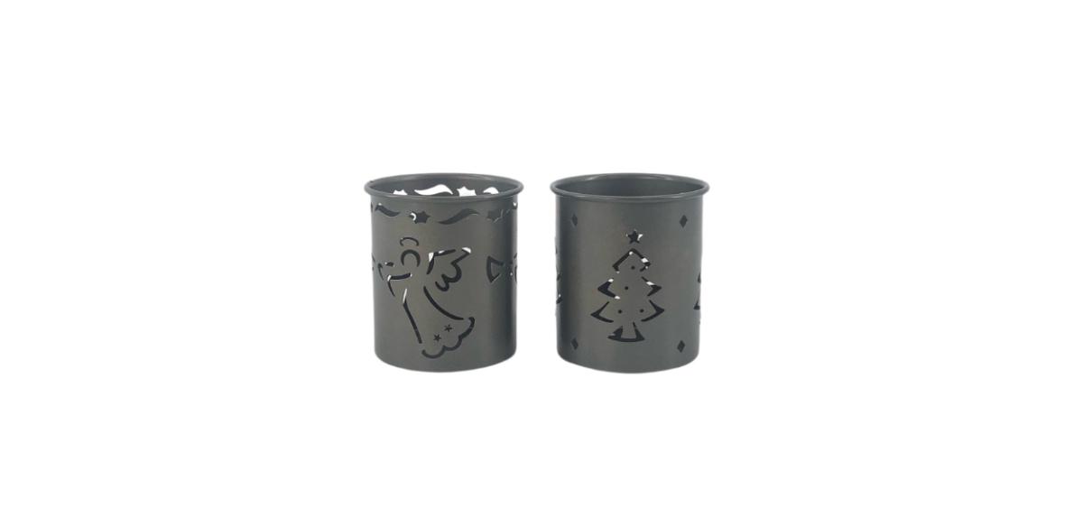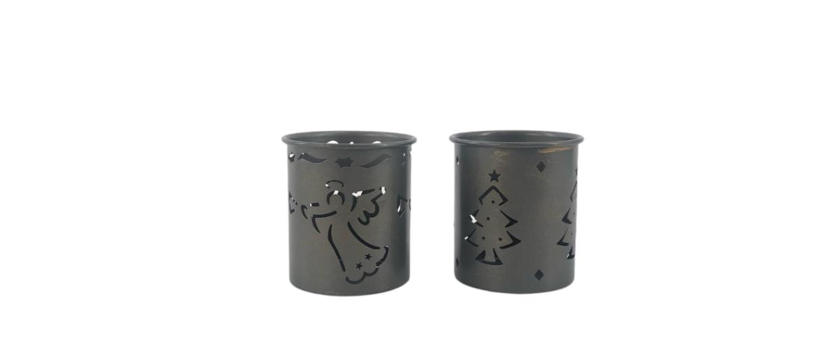 Pair of luminary style metal Christmas holiday candle holders. Painted with gold and silver and have cut pjs of an angel and tree. Each measures 3” x 3.5”.