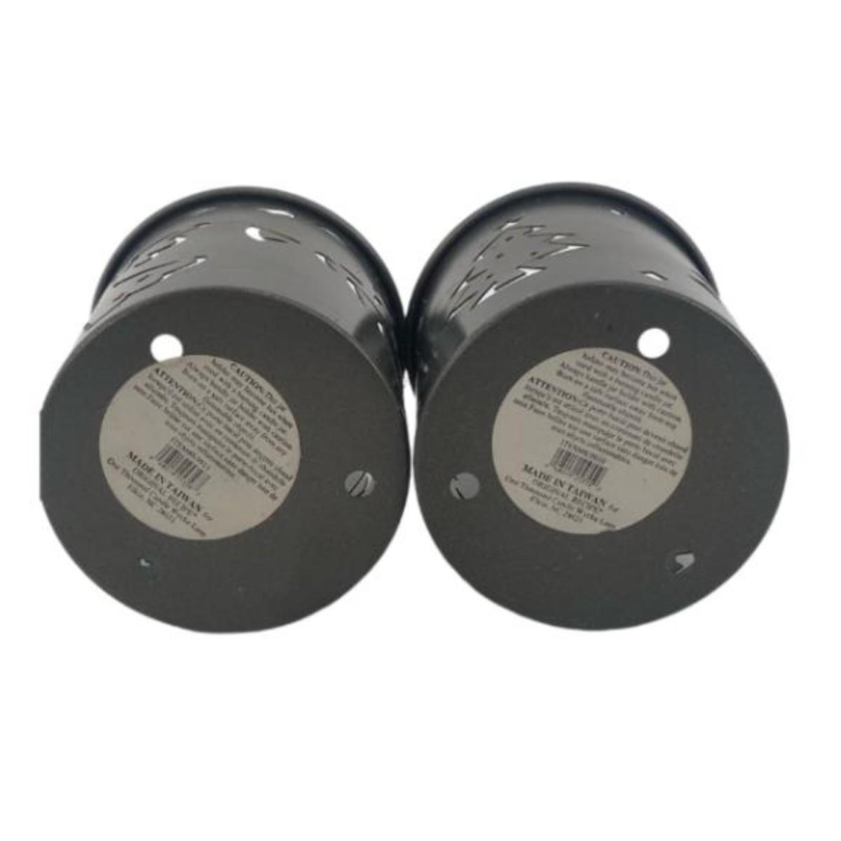 Pair of luminary style metal Christmas holiday candle holders. Painted with gold and silver and have cut pjs of an angel and tree. Each measures 3” x 3.5”.