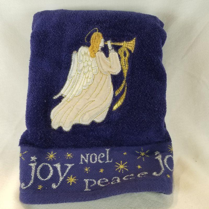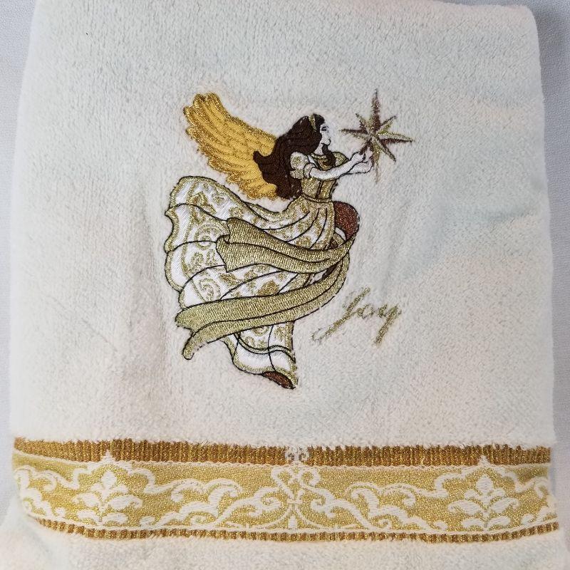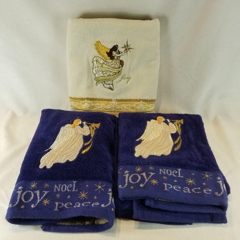 The ivory towel is the standard bath towel size - 44-inches long X 22-inches wide. The two blue towels are a little smaller, but much bigger than a hand towel. They are 38-inches long and 20-inches wide. All towels appear to have only been used for decoration, does not look to have been put in a washing machine. All applique and embroidery is in great condition. Have some nice "Angel" towels to adorn your bathroom.