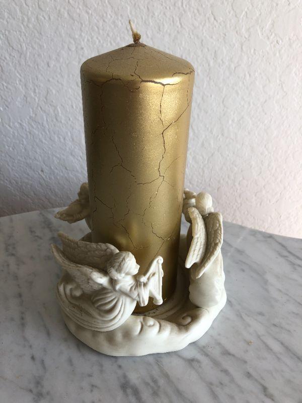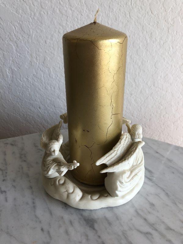 Angel candle holder with a gold candle. Candle is unused. Made by Palm Tree 1997.