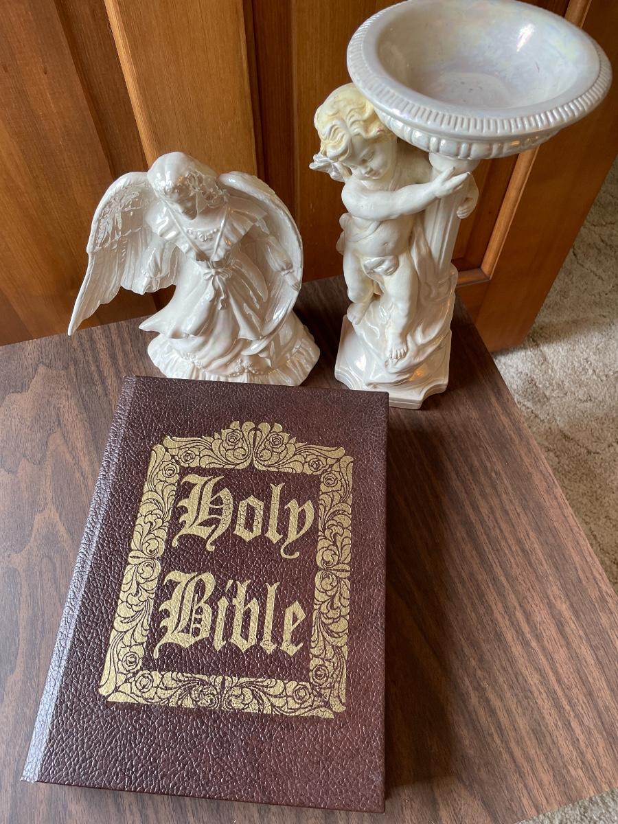 Includes 2 angel decor and large bible