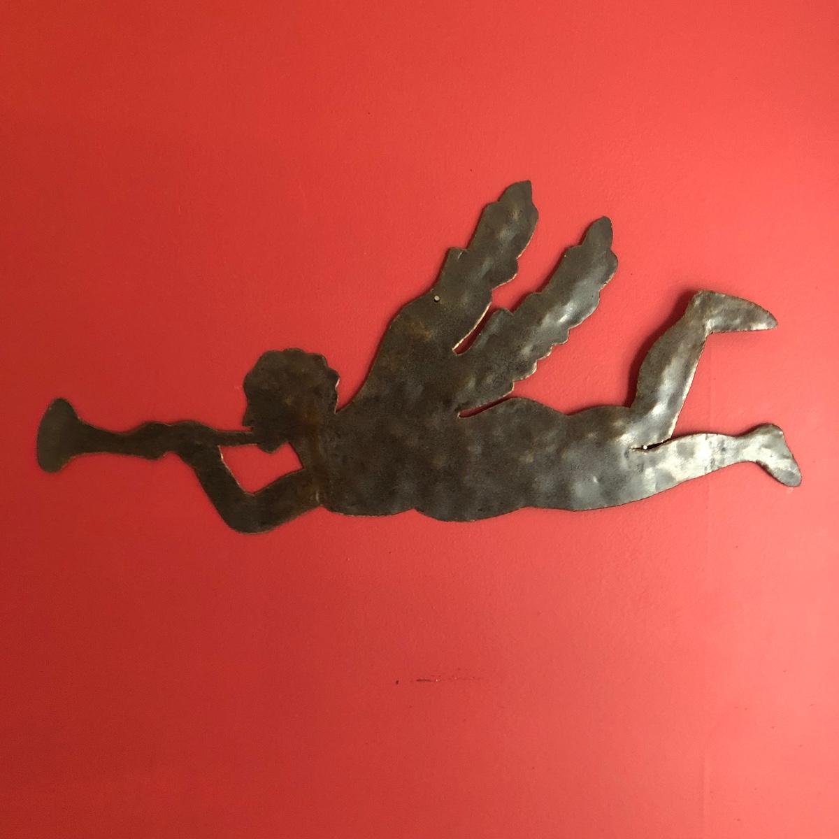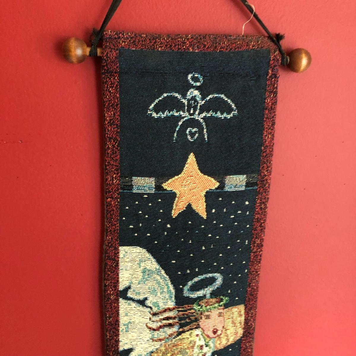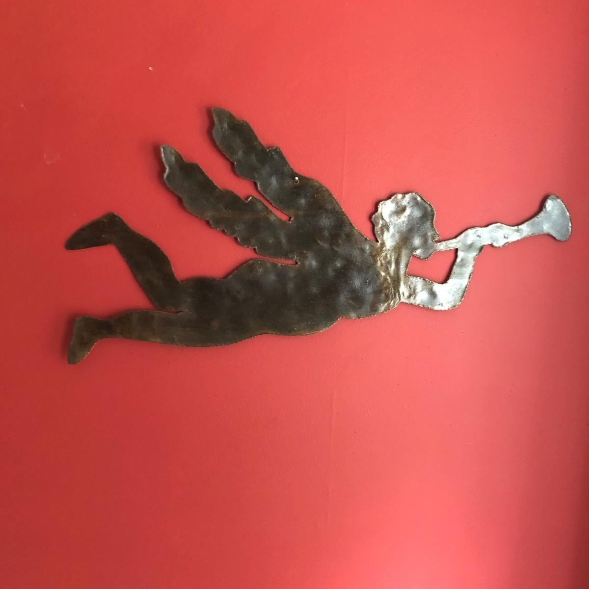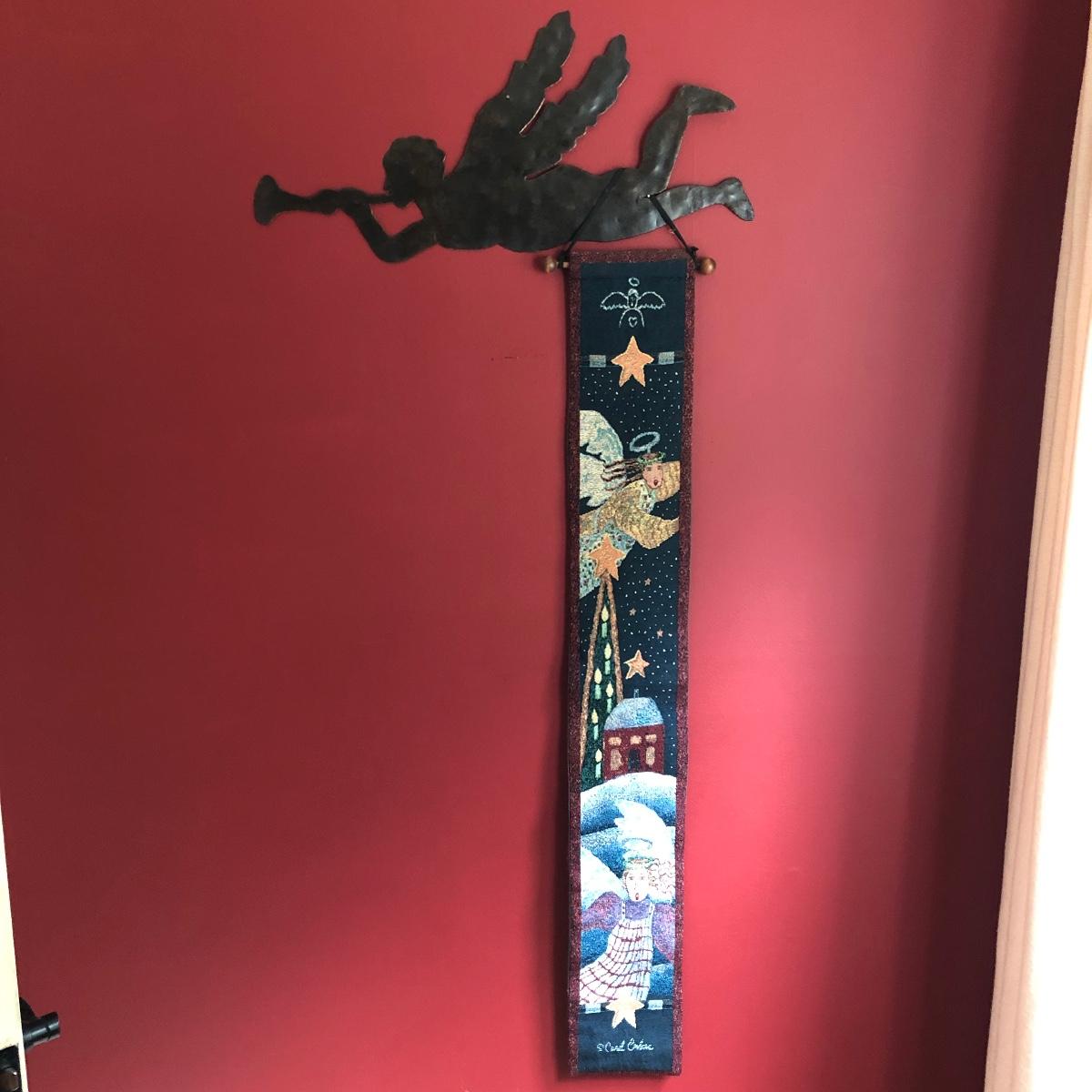 Lot includes a metal angel wall hanging and a cloth wall hanging with angels. Metal angel measures 21” x 10”.
