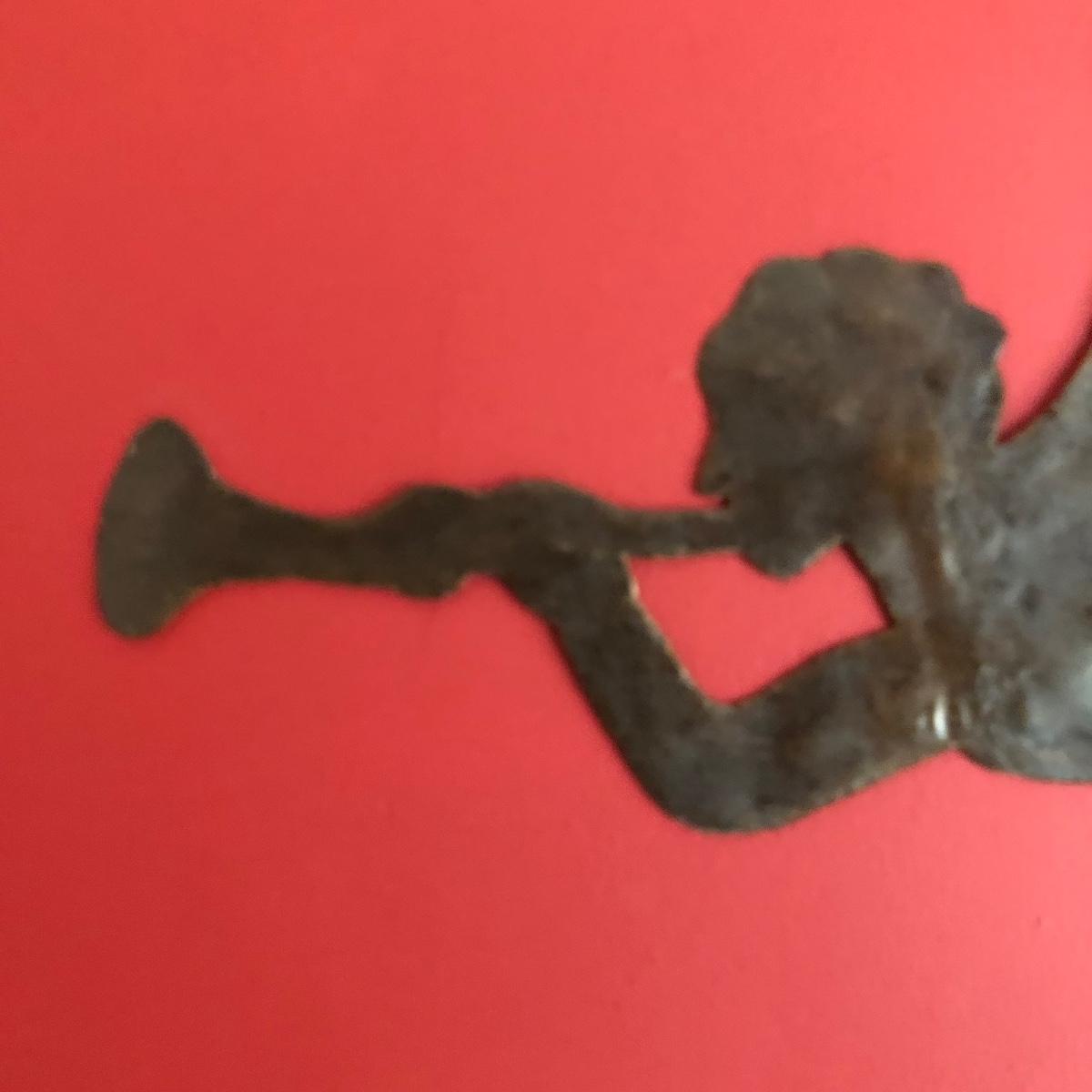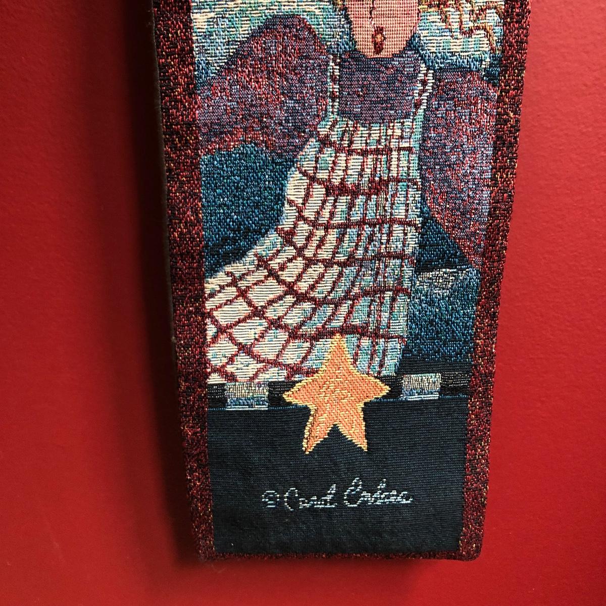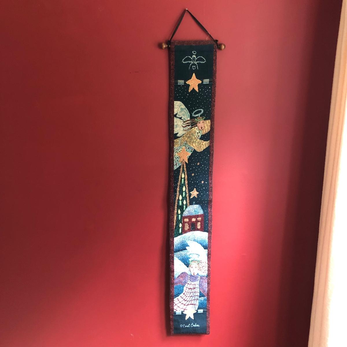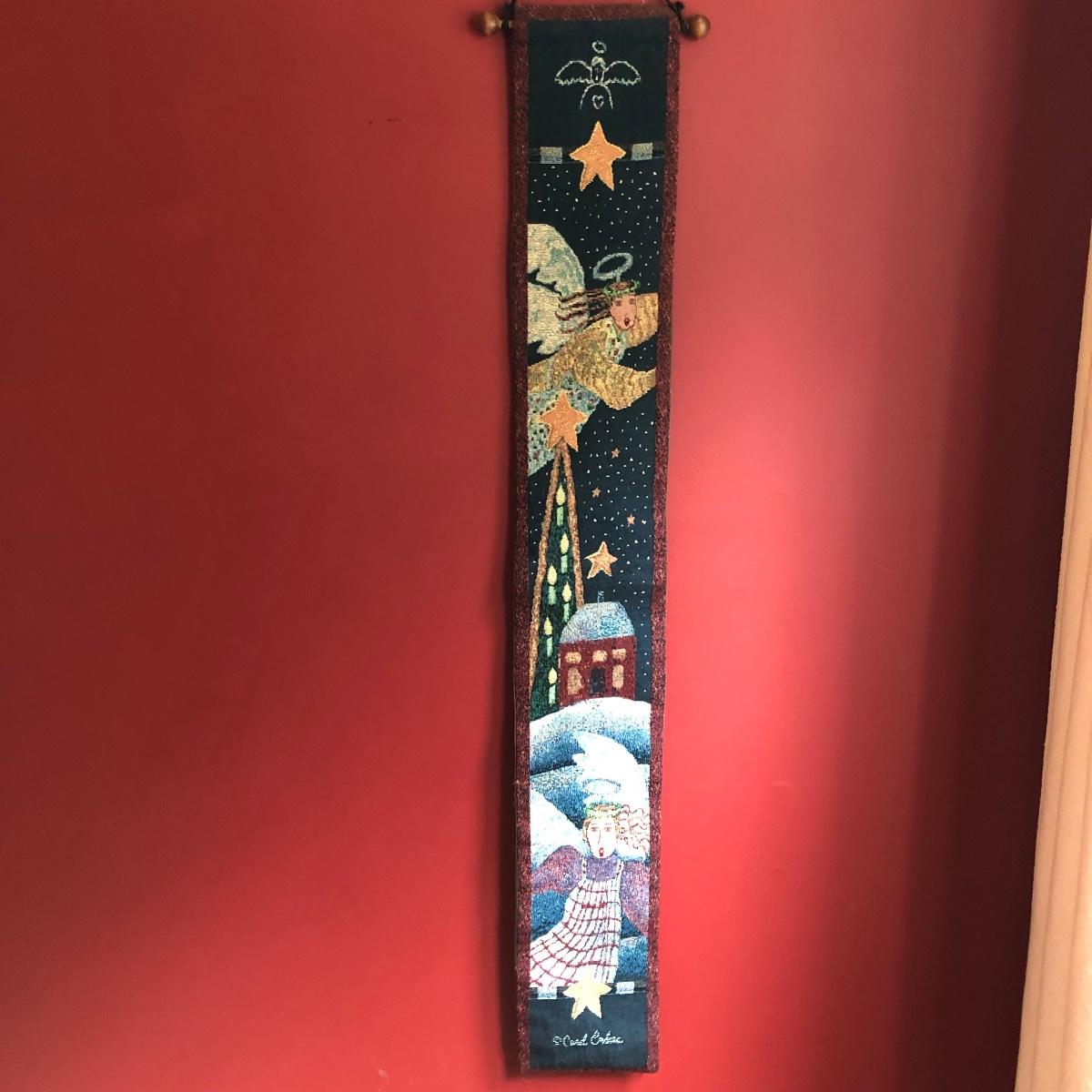 Lot includes a metal angel wall hanging and a cloth wall hanging with angels. Metal angel measures 21” x 10”.