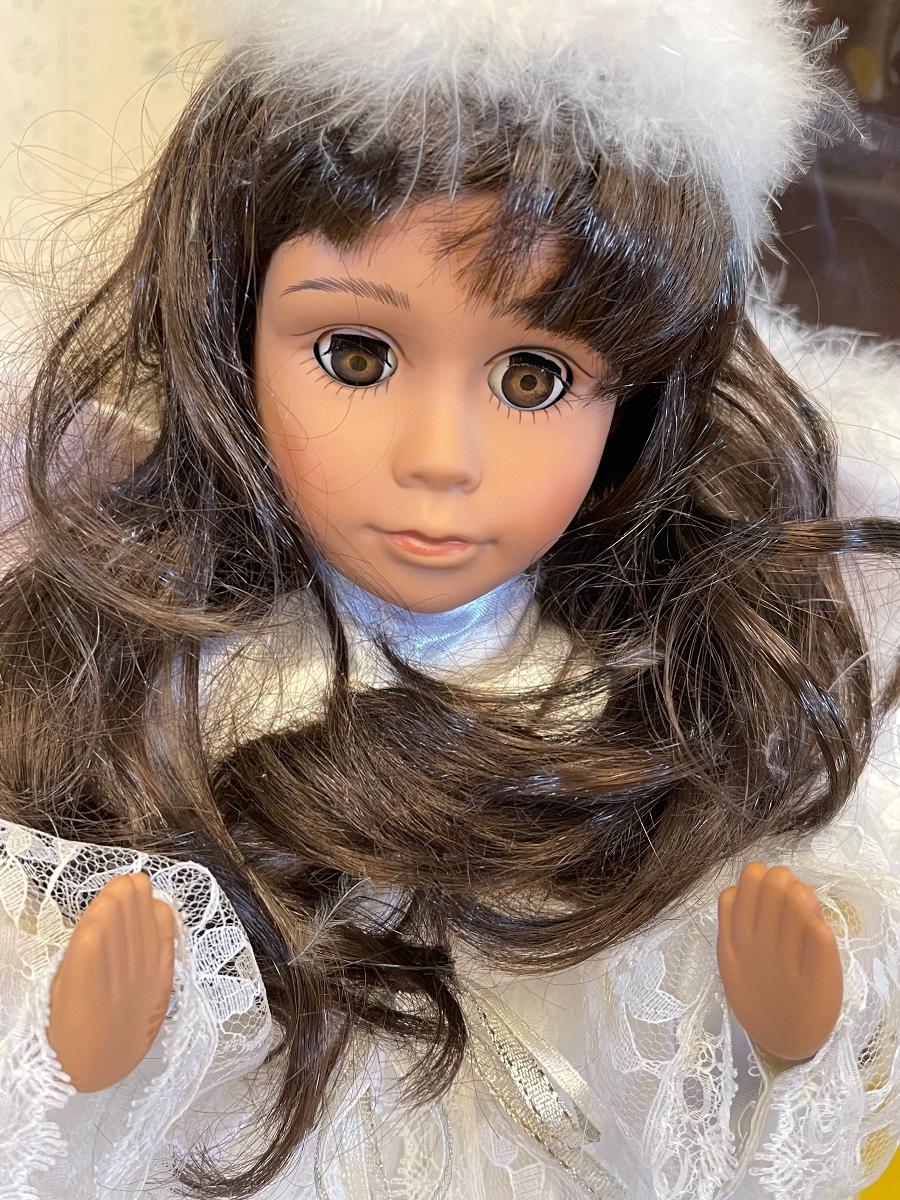 Angel and white gown. In good condition except some feathers are loose. Water bottle for size comparison.