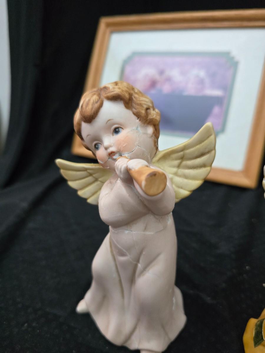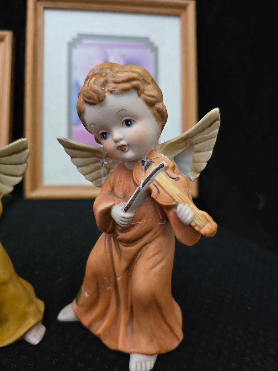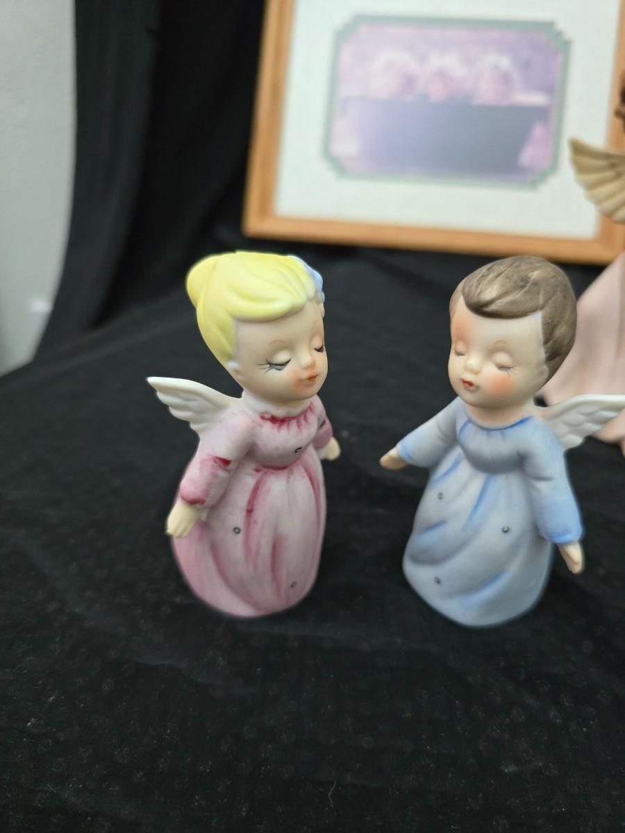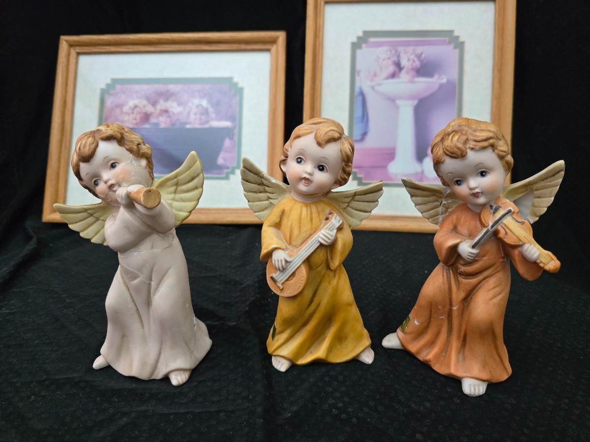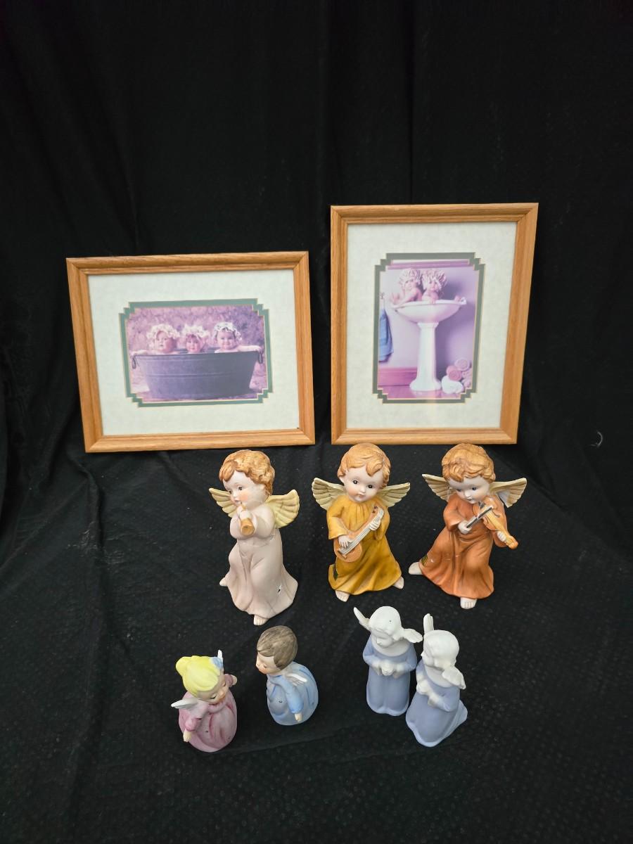 Angel figures with two framed Anne Geddes framed wall art pictures