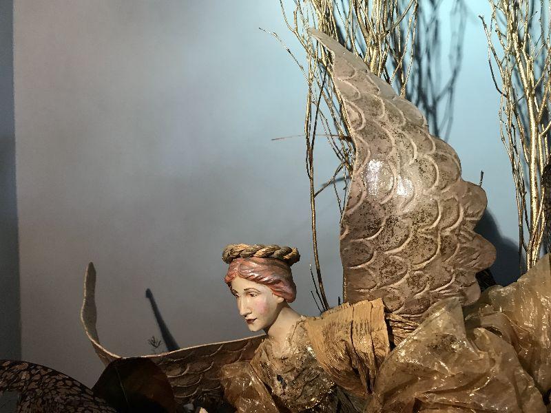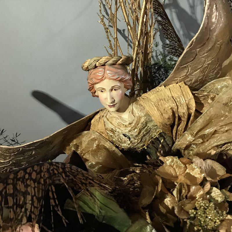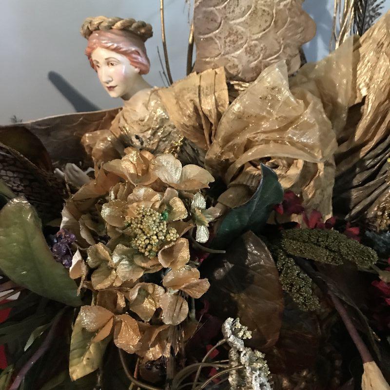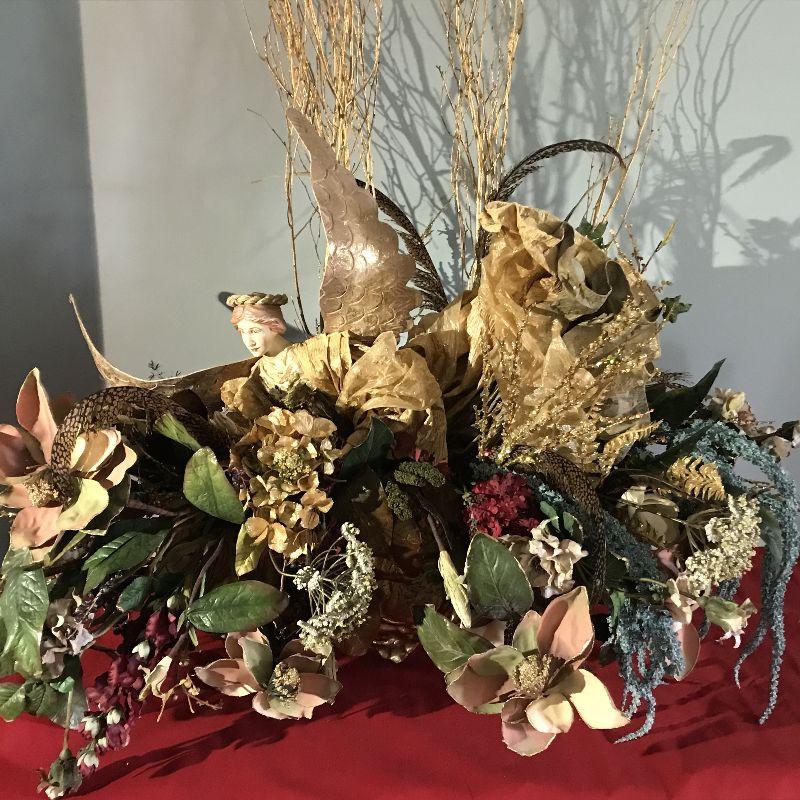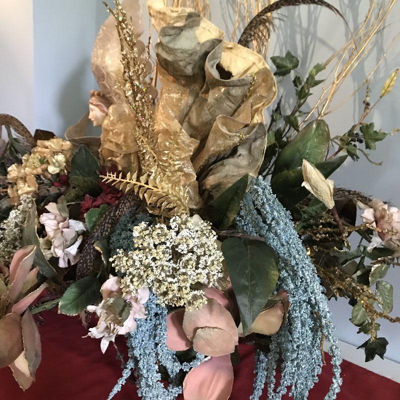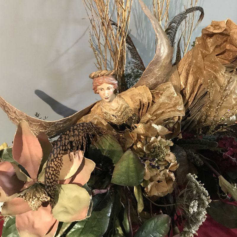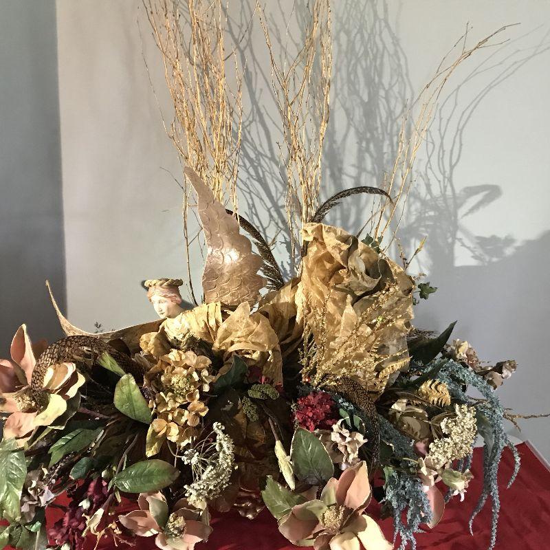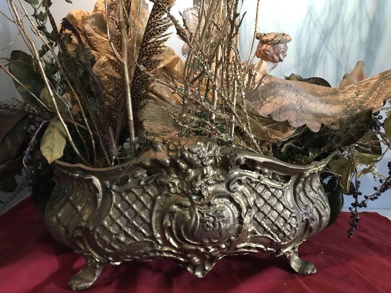 This floral arrangement needs a little refresh. But, what I love about this arrangement is the angel which measures 28 inches from the wing tip to the end of the gown. I believe the container is cast iron. The container is heavy like cast iron and when I knock on it, it sounds like cast iron. This pot stands 2" off the ground, and is 26" X 11". The pictures don't do it justice.