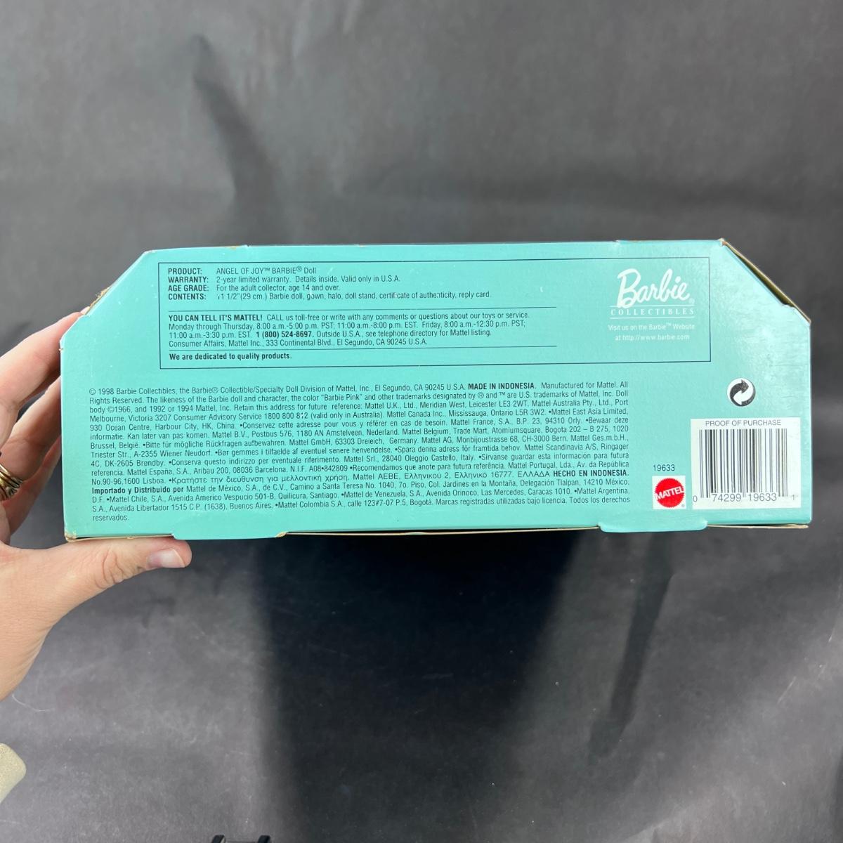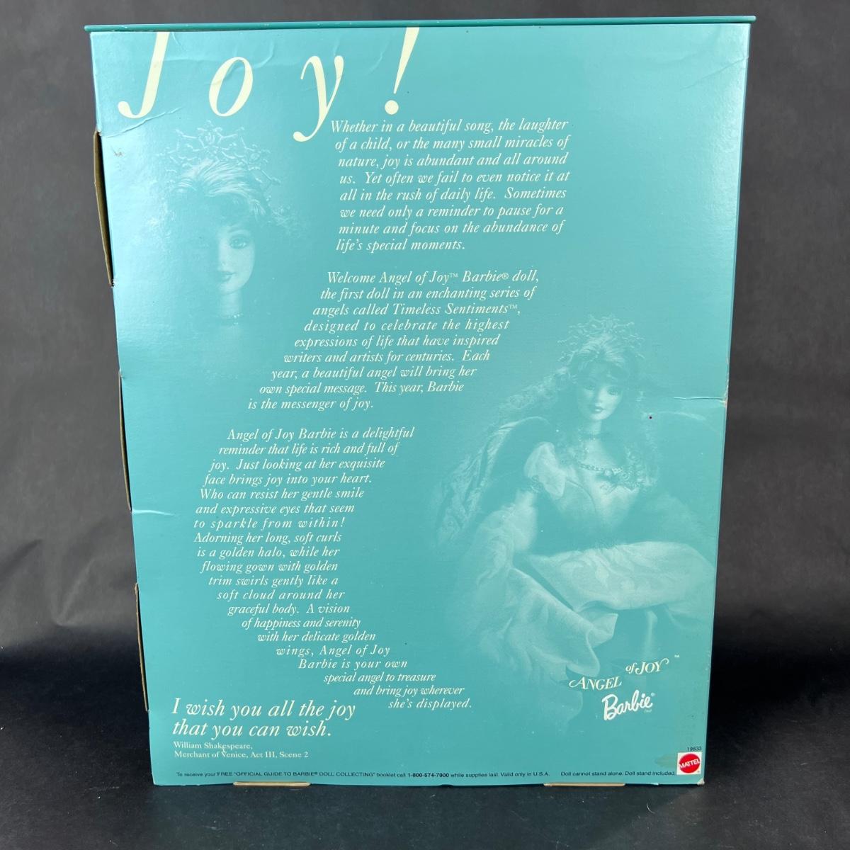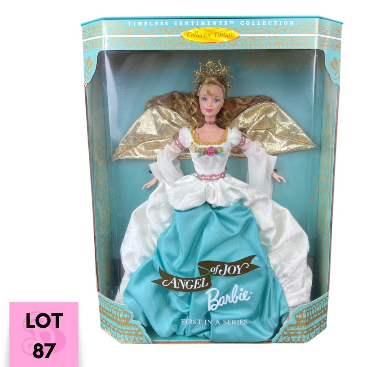 This beautiful Angel of Joy Barbie is a First in a Series of Timeless Sentiments. (whatever that means) This doll has not been out of its box. This doll was produced in 1998 by Mattel. **|** Please see photos for details and condition. ::: Shipping is available on this lot. If you require shipping you must let us know at the close of the auction. We will coordinate with you after the item has been won. Shipping fees will include insurance up to or exceeding the value of all items being mailed. If you have any questions regarding this lot please contact the auctioneer either via this website, by direct email or by phone. PICK UP TIMES and other important information can be found in the TERMS and DESCRIPTION of the auction. Please take a look for pertinent information. Thanks!