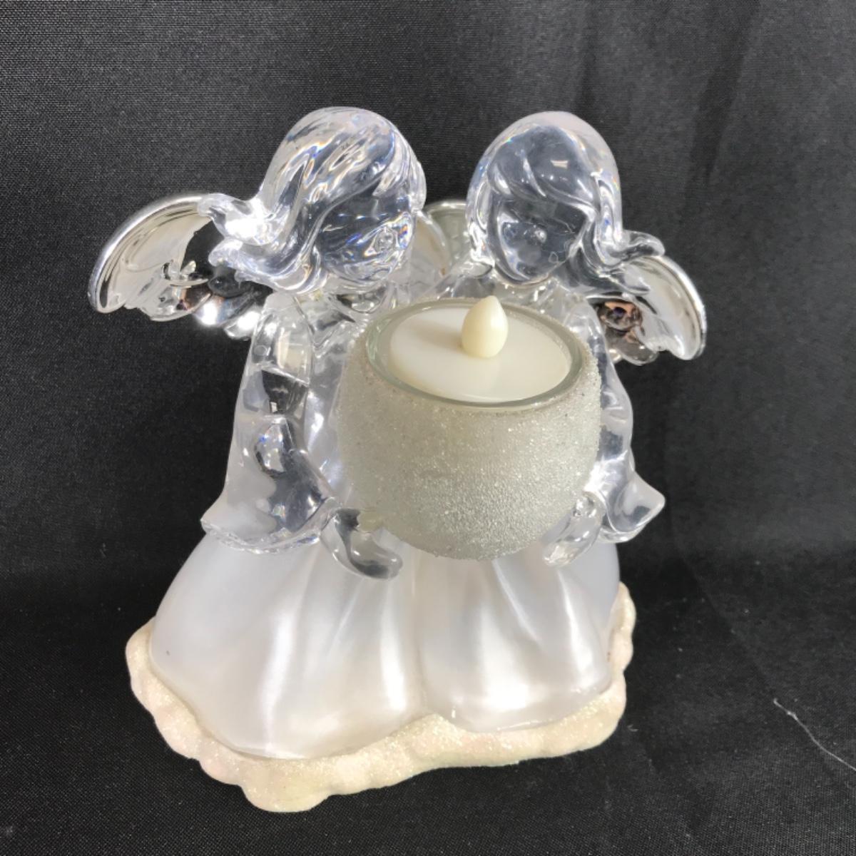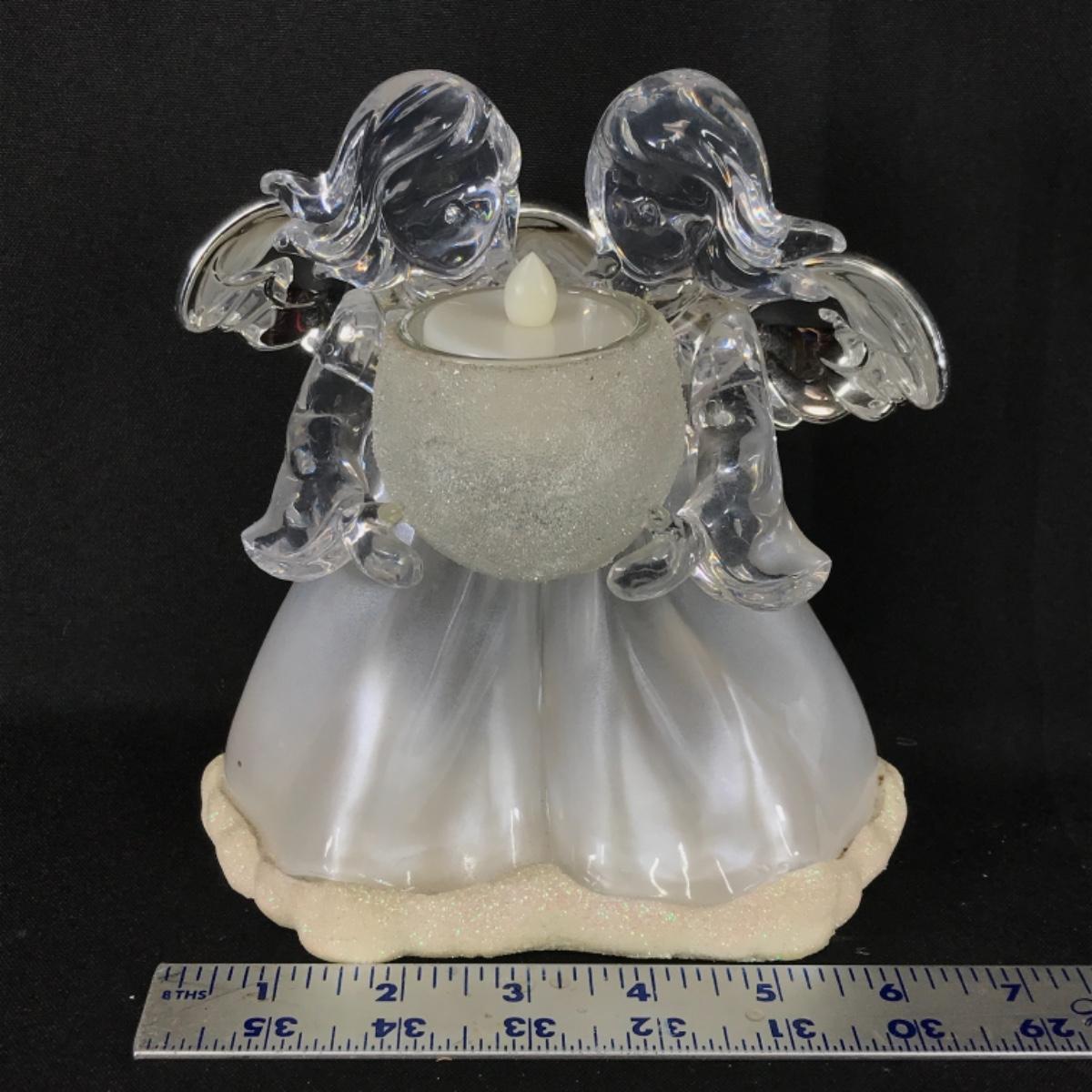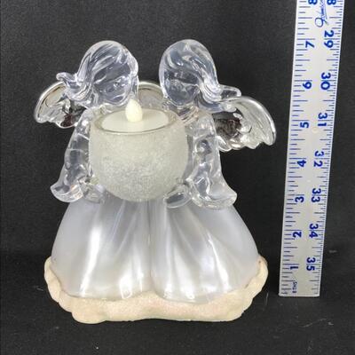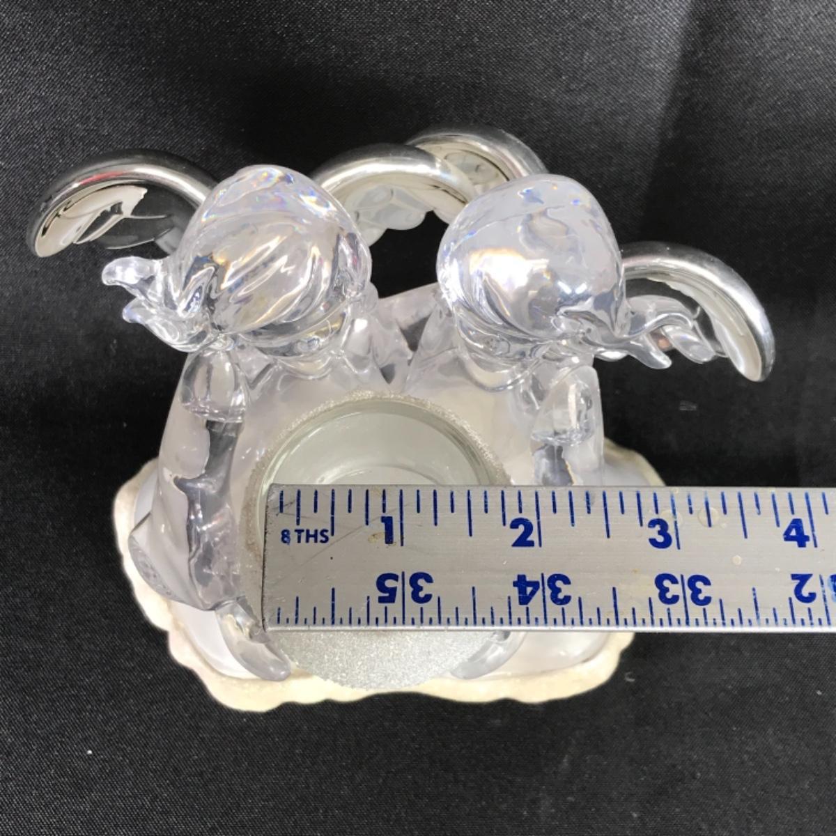 Up for auction is a decorative candle holder depicting two angels. It is made of a hard plastic material and is in good condition; see pictures.