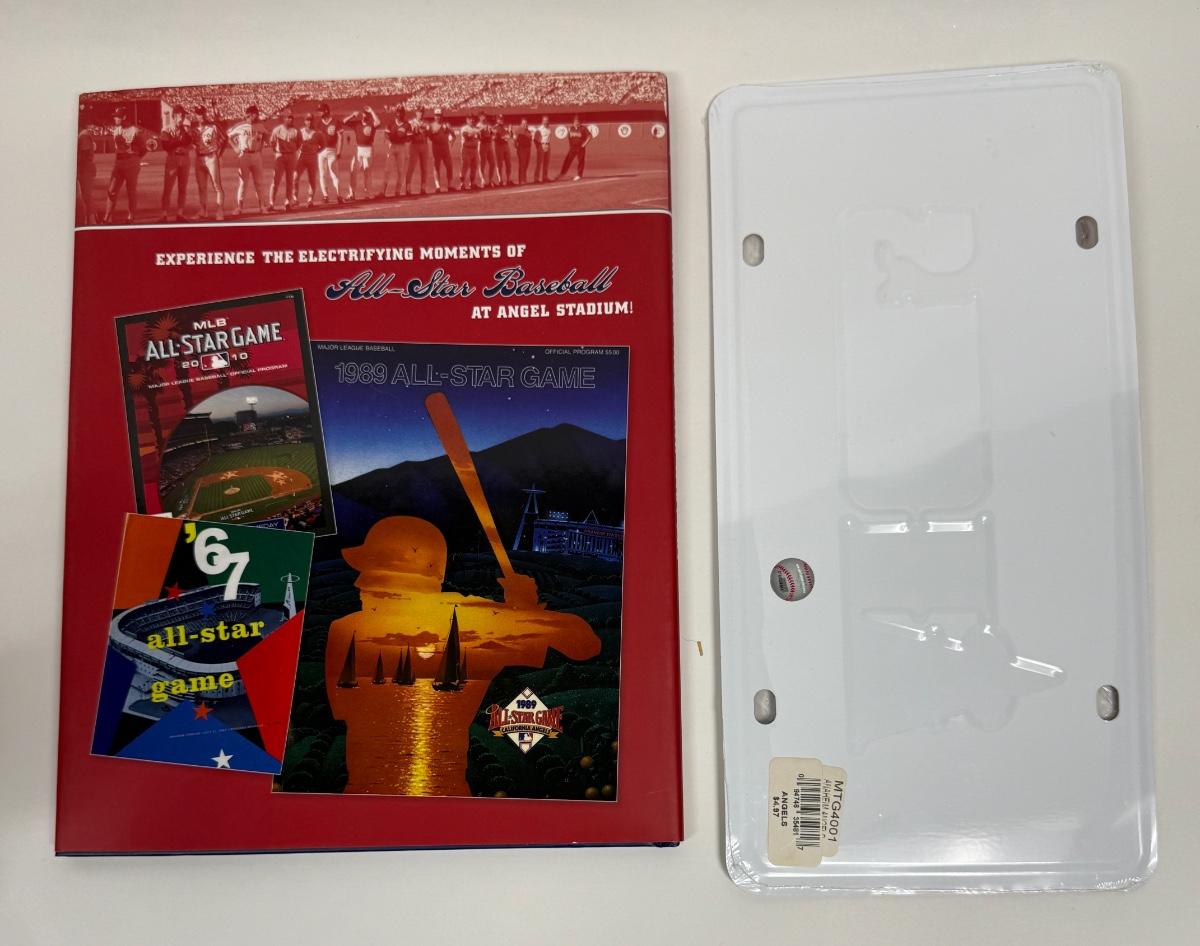 License plate is new, still sealed in plastic wrap. Book has photos of 3 All-Star games played at Angel Stadium: 1967, 1989, and 2010. Great game information and photos. In excellent condition.