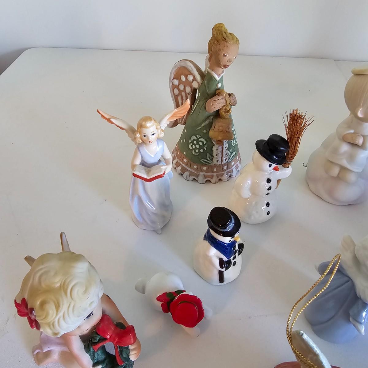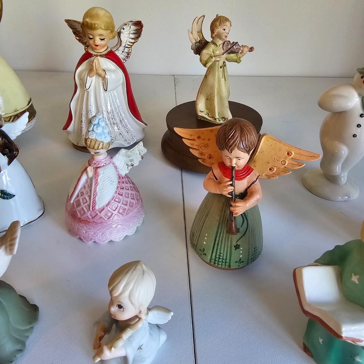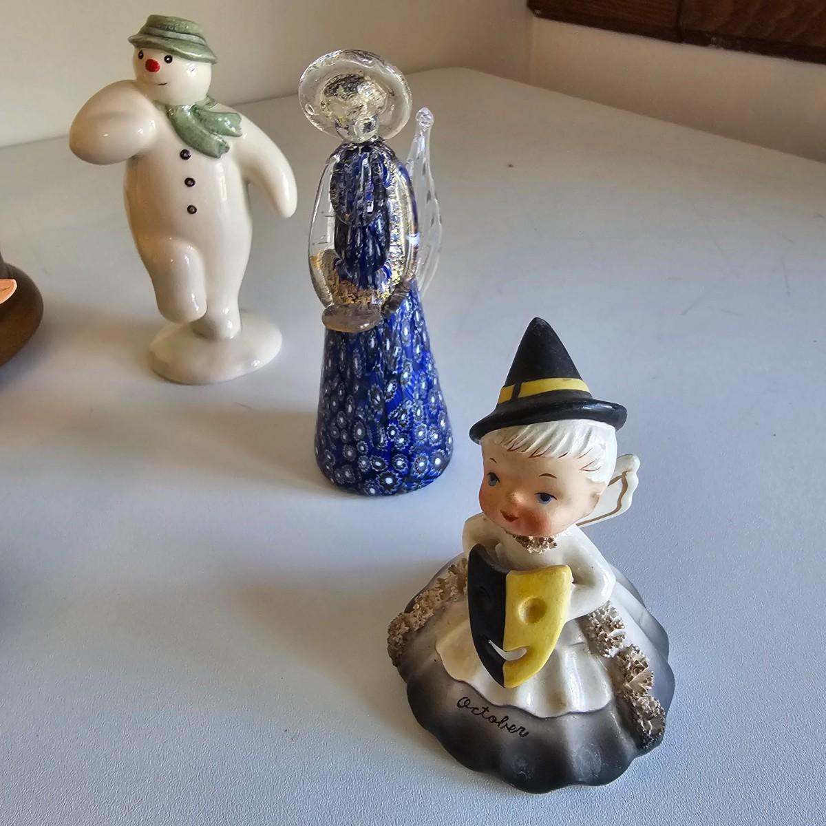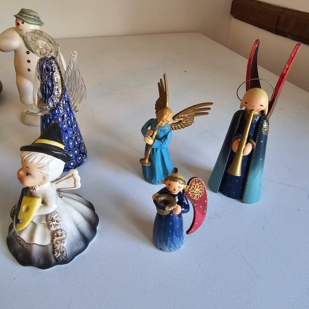 Lovel cherubic figures in glass, porcelain, wood and fabric. Many vintage items as well as newer. Some of these angels are bells, and some are music boxes. Tallest angel is 9.5"H. Produced all over the world, China, Japan, Germany, Taiwan, others. Also some fun snowmen figures. See photos for details. Shipping available.