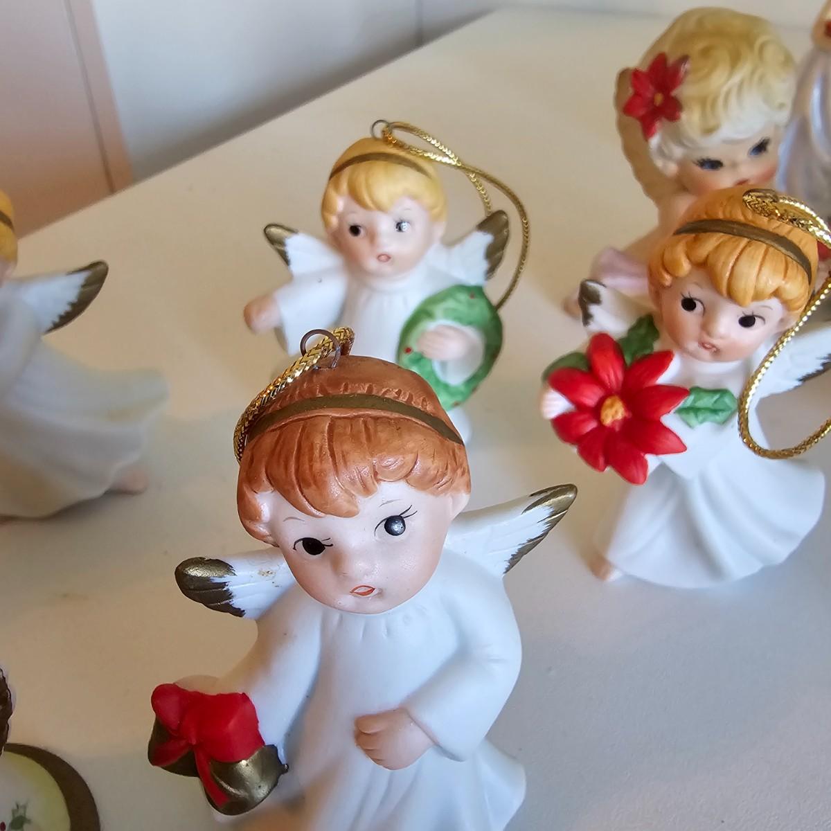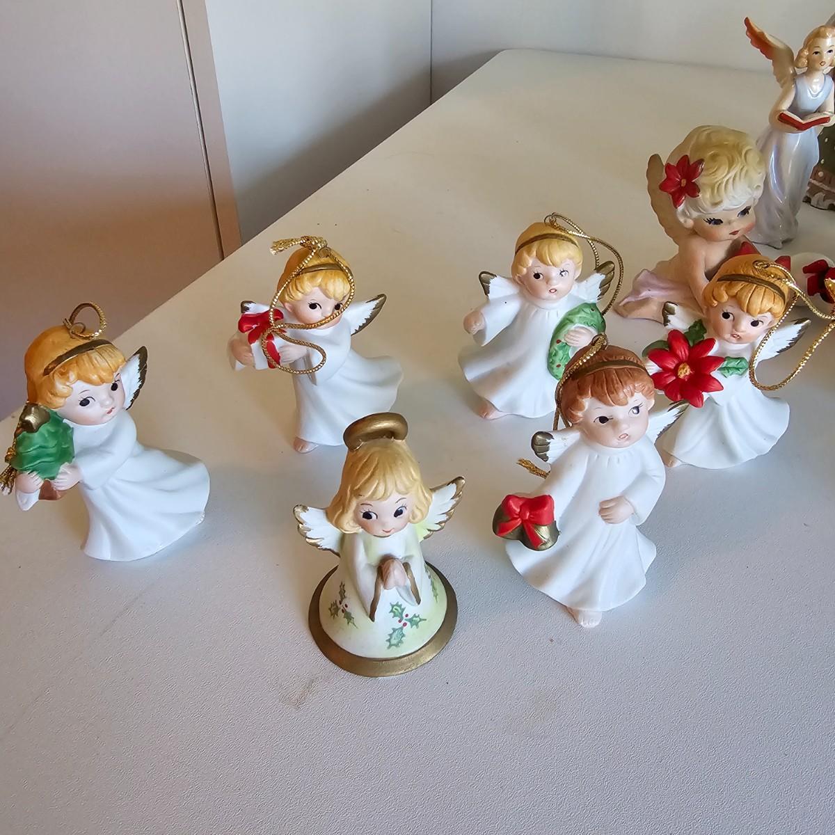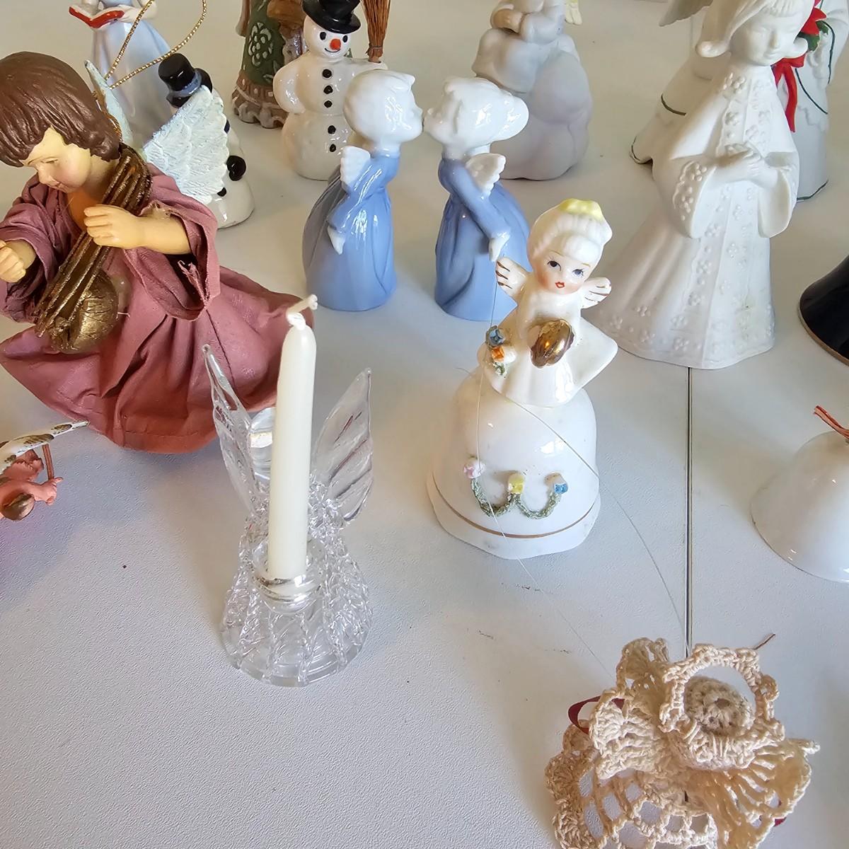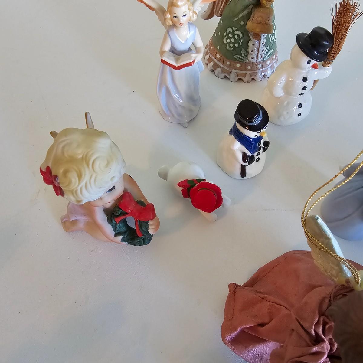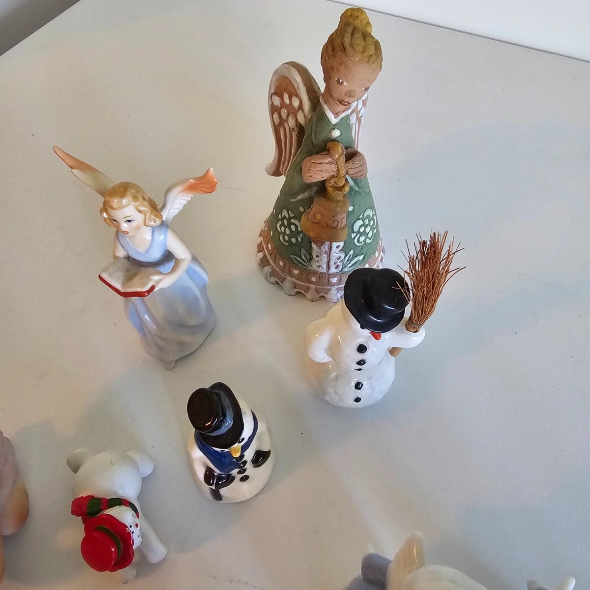 Lovel cherubic figures in glass, porcelain, wood and fabric. Many vintage items as well as newer. Some of these angels are bells, and some are music boxes. Tallest angel is 9.5"H. Produced all over the world, China, Japan, Germany, Taiwan, others. Also some fun snowmen figures. See photos for details. Shipping available.