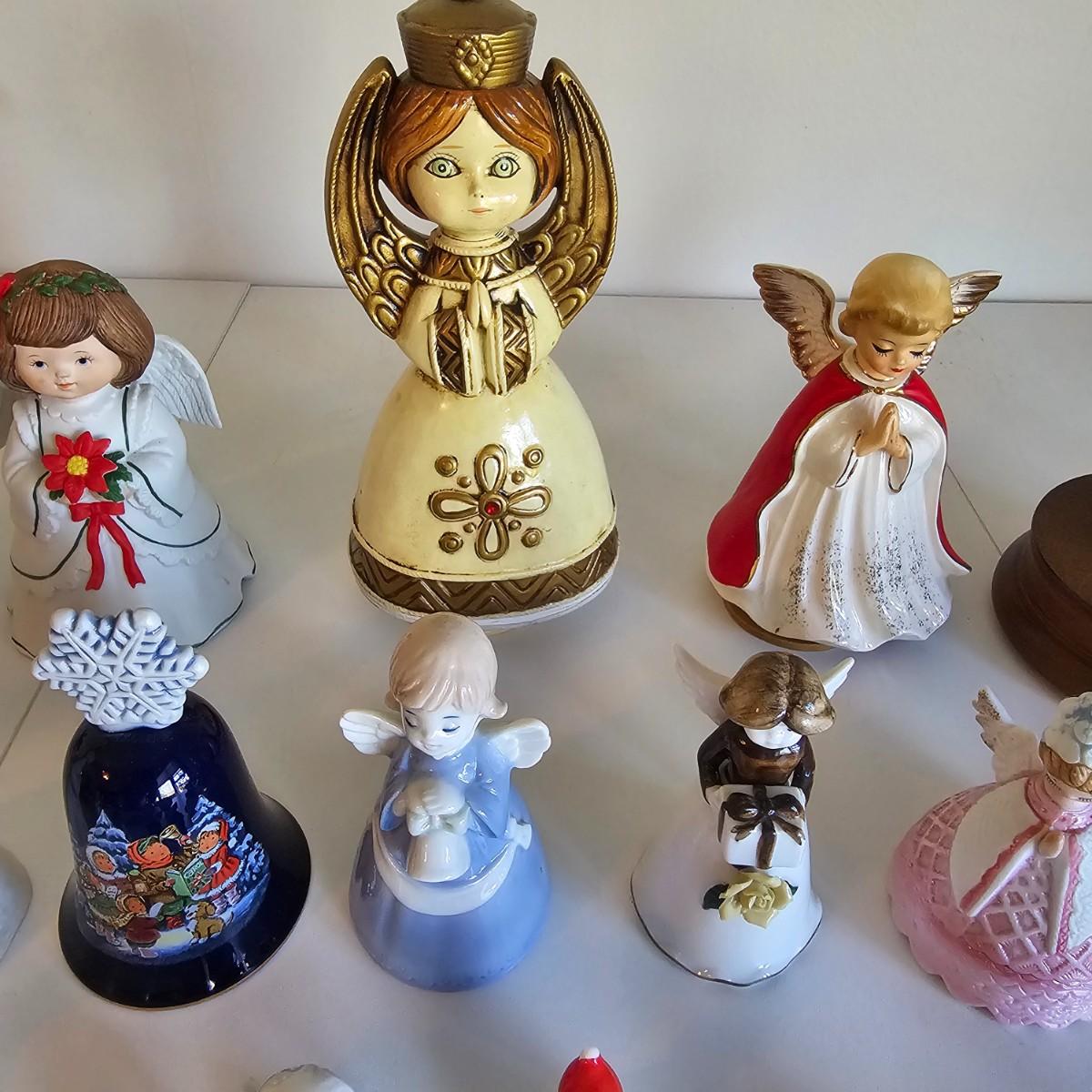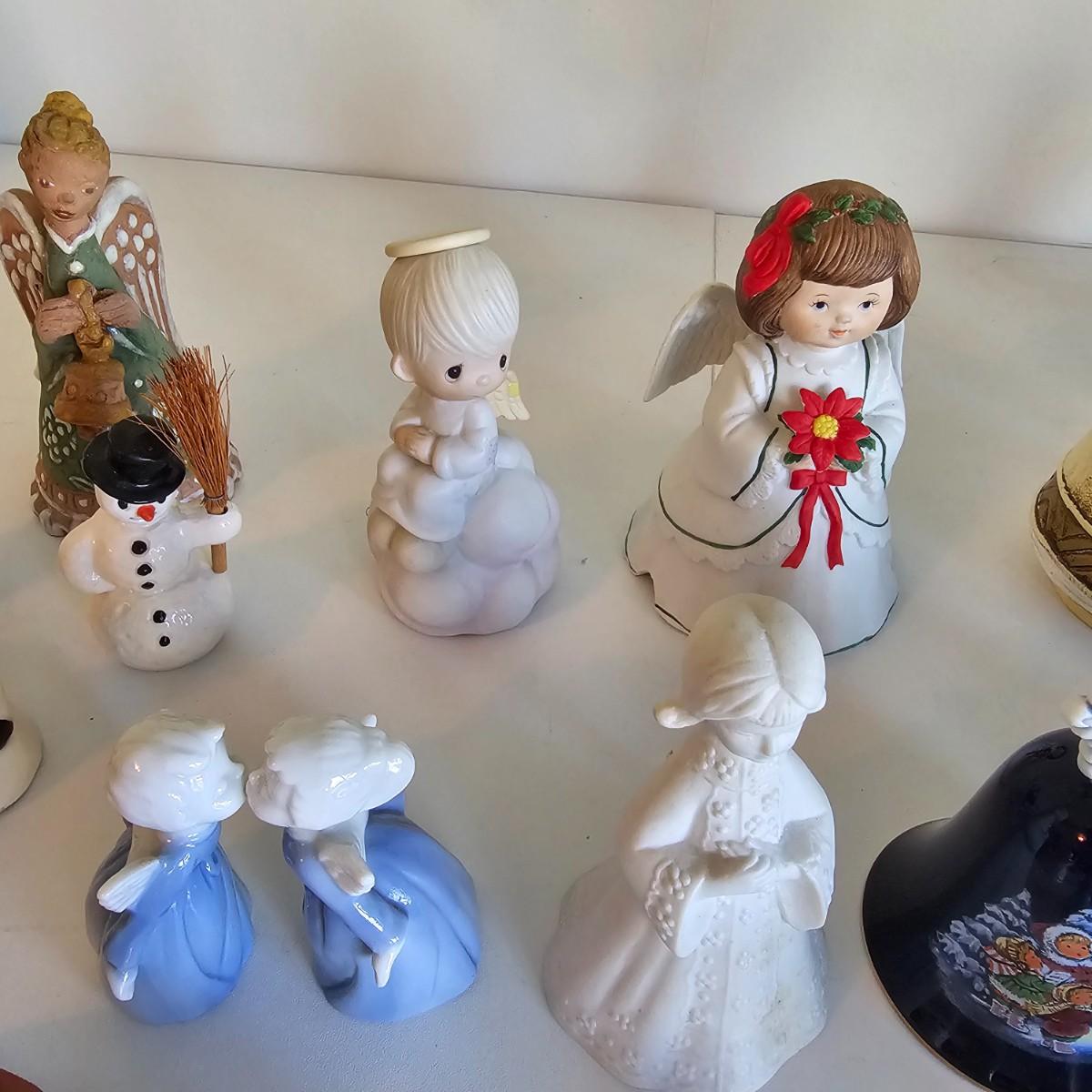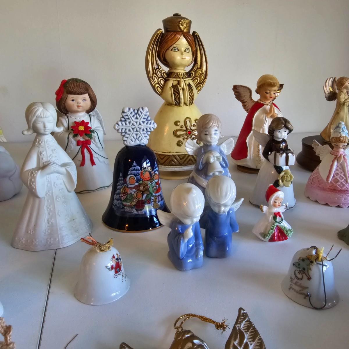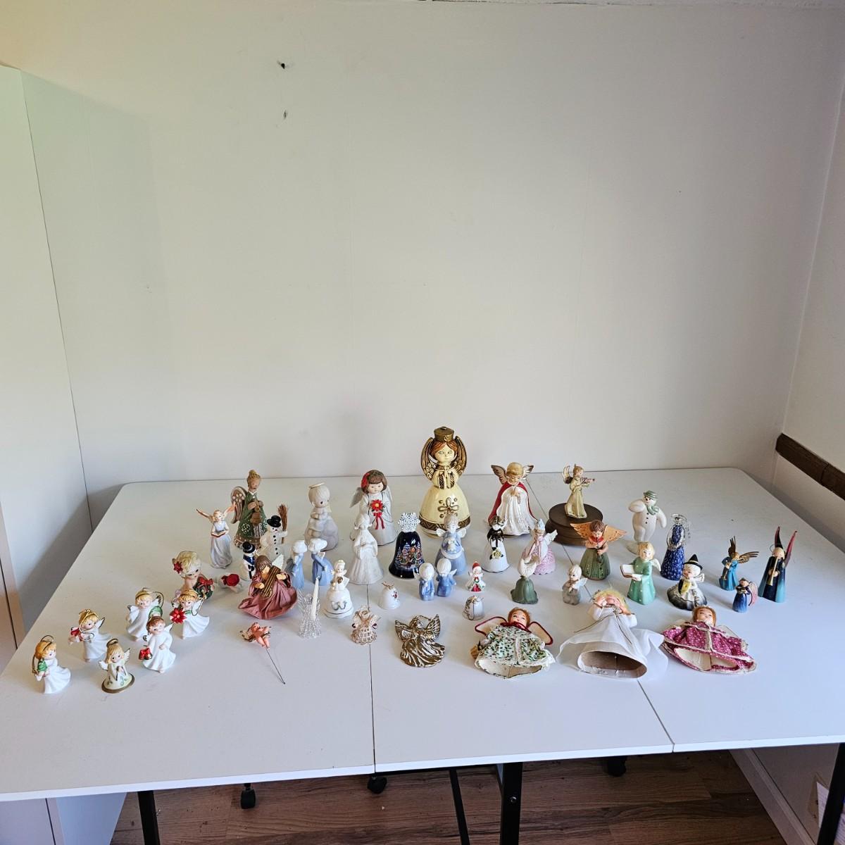 Lovel cherubic figures in glass, porcelain, wood and fabric. Many vintage items as well as newer. Some of these angels are bells, and some are music boxes. Tallest angel is 9.5"H. Produced all over the world, China, Japan, Germany, Taiwan, others. Also some fun snowmen figures. See photos for details. Shipping available.