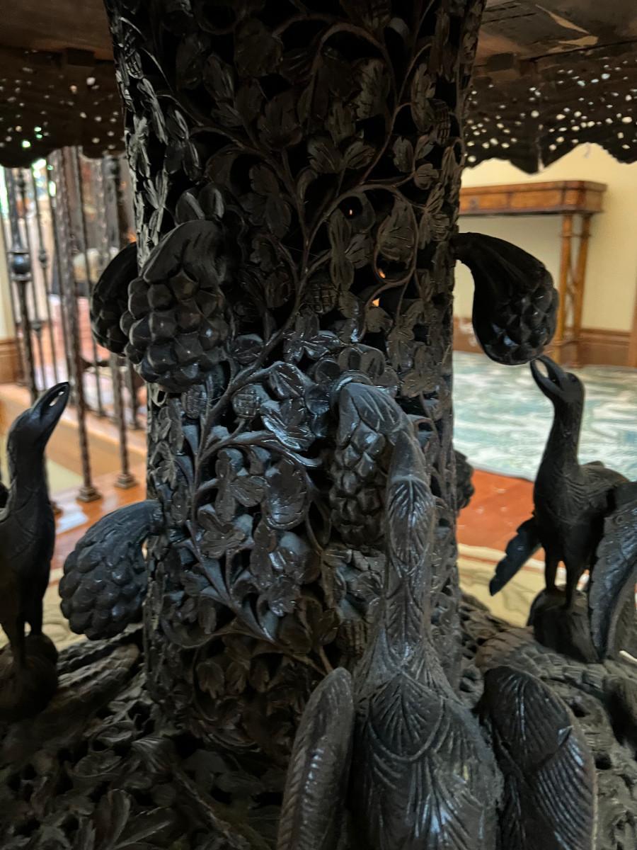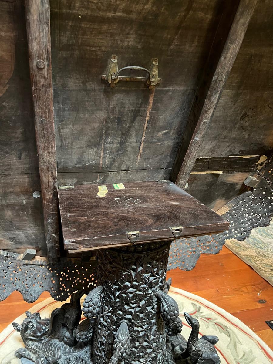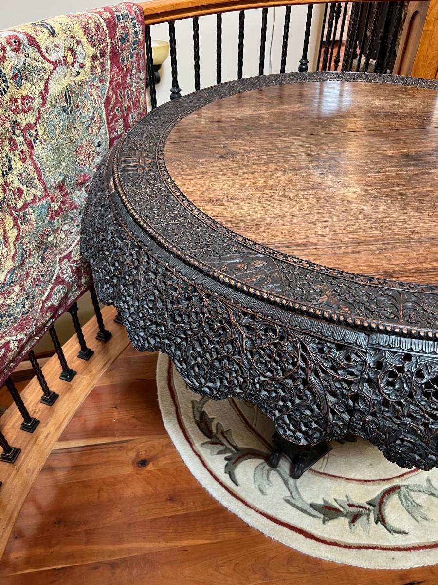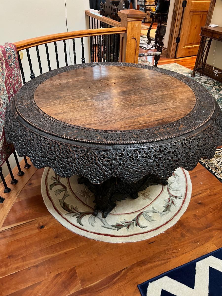This beautifully carved table is from the late 1800's most likely 1890's. Finely carved rosewood of British East Indian Origin. Table does have some age related damage and wear, it appears to also have been repaired in the past but I believe it to be the original finish. Regardless this is a one of a kind piece and quite rare. 48" diameter and 31" tall, Top will swivel as shown for display.