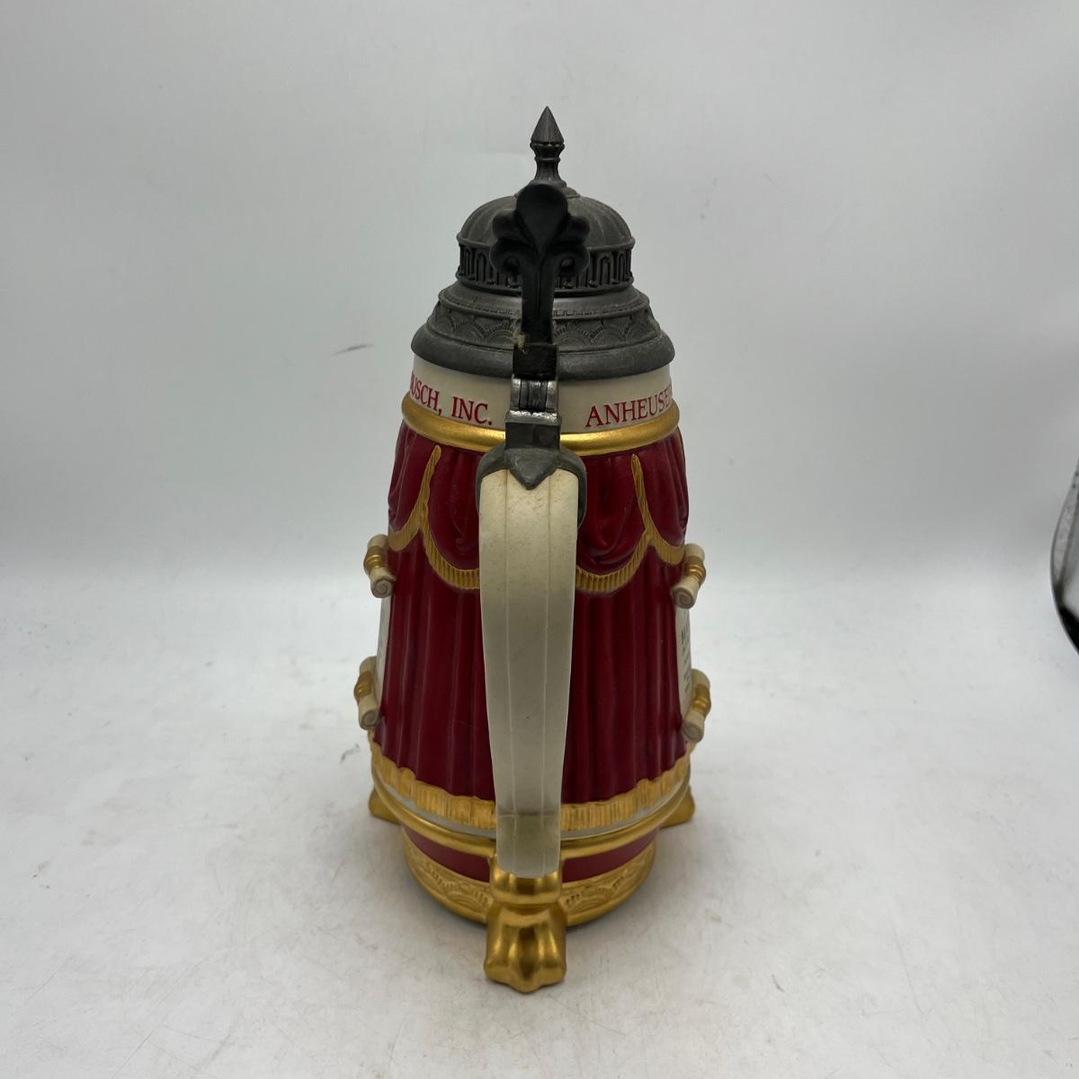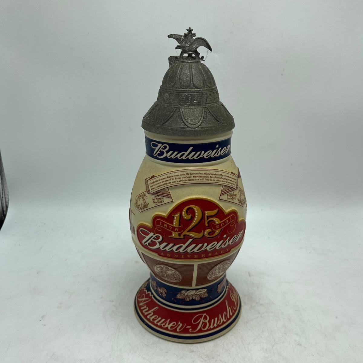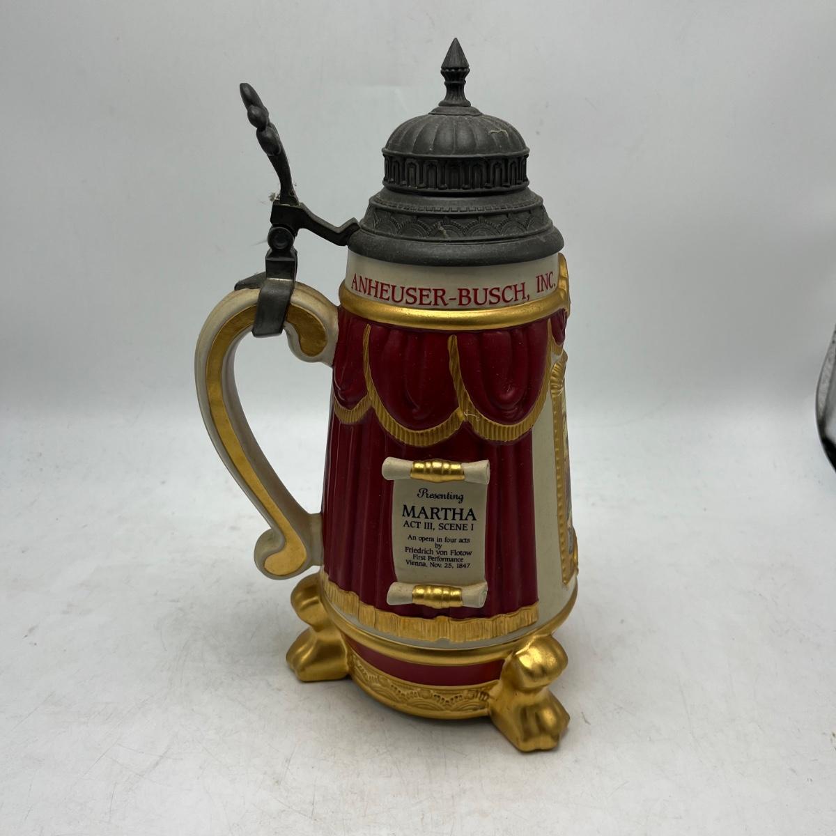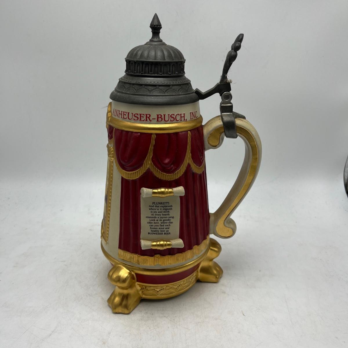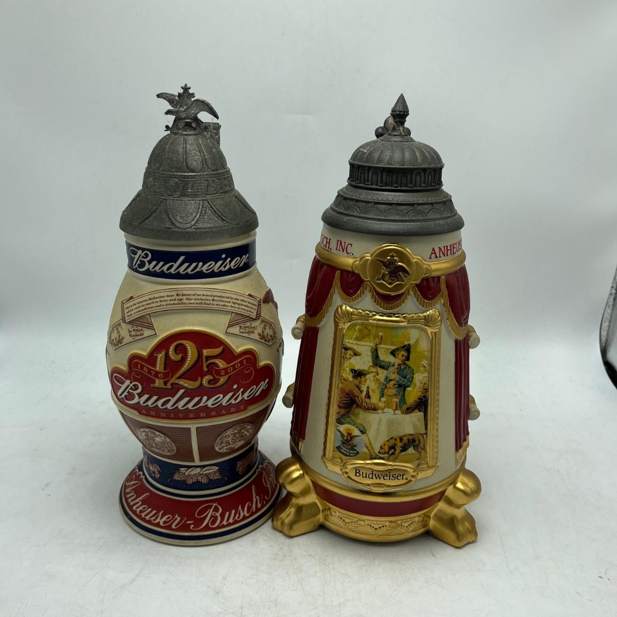 Lot includes Anheuser Busch 125th anniversary stein and a Anheuser Busch Opera card stein. Largest stein measures 4.5” x 6” x 11”.