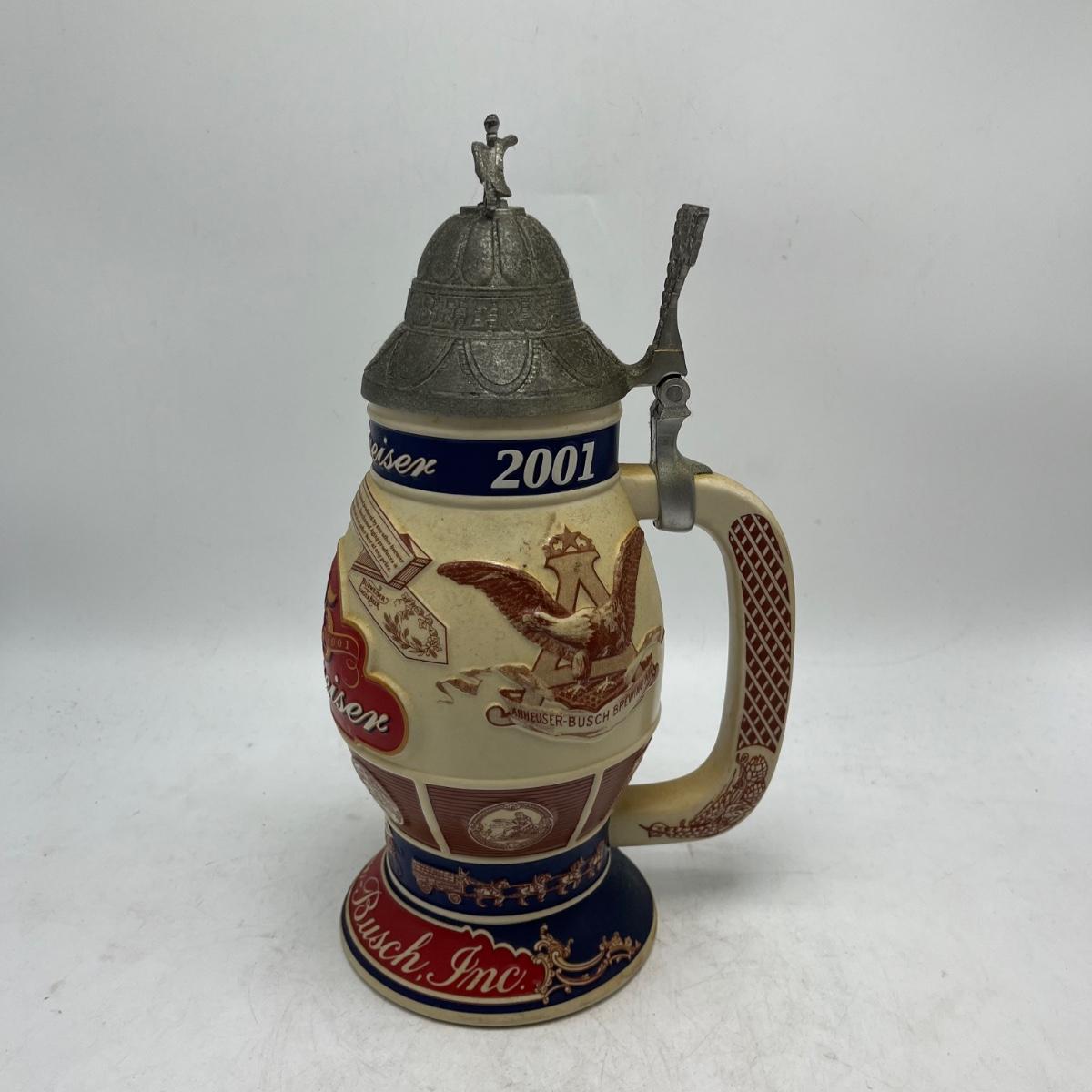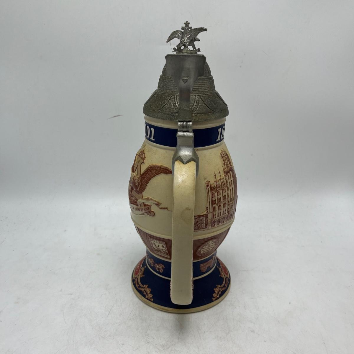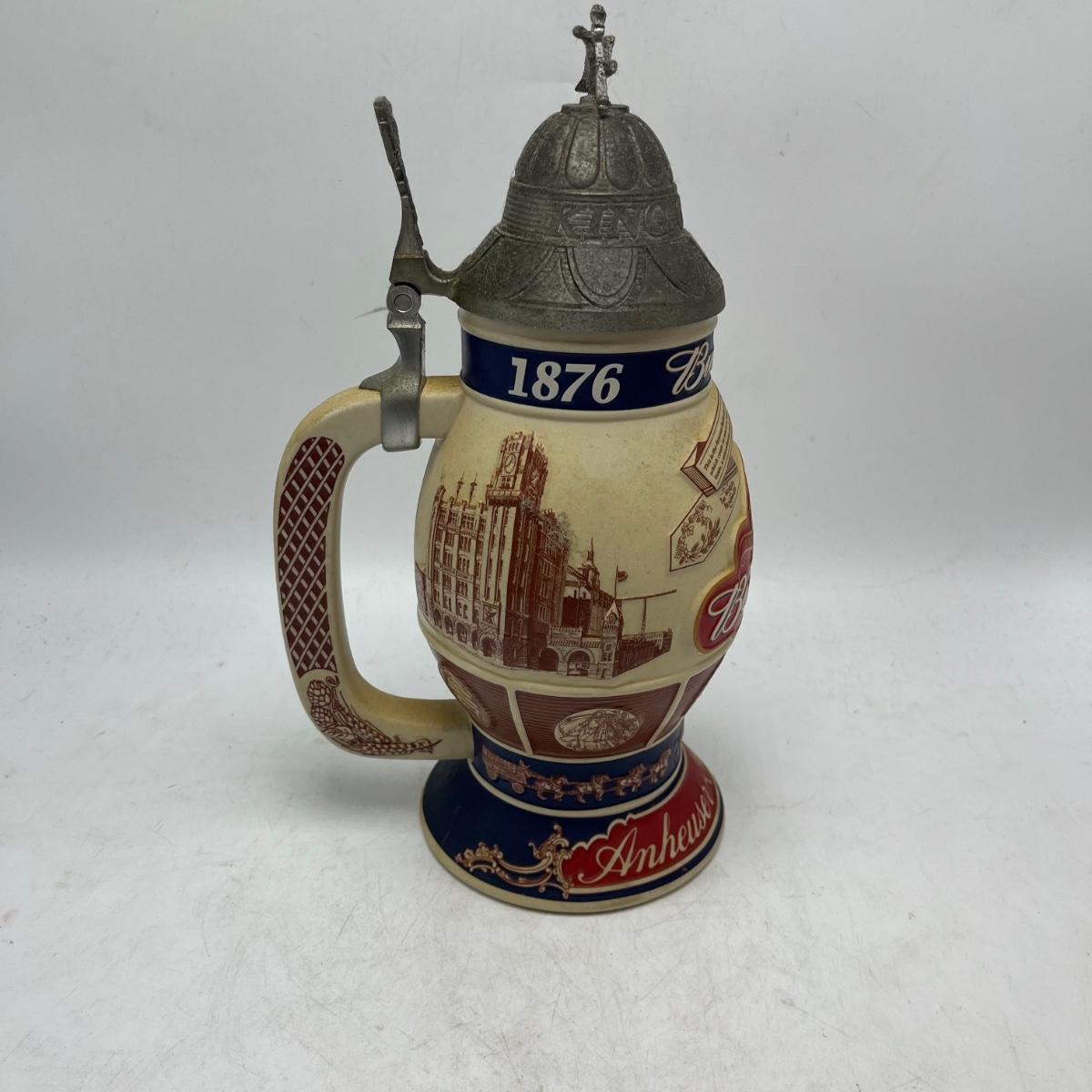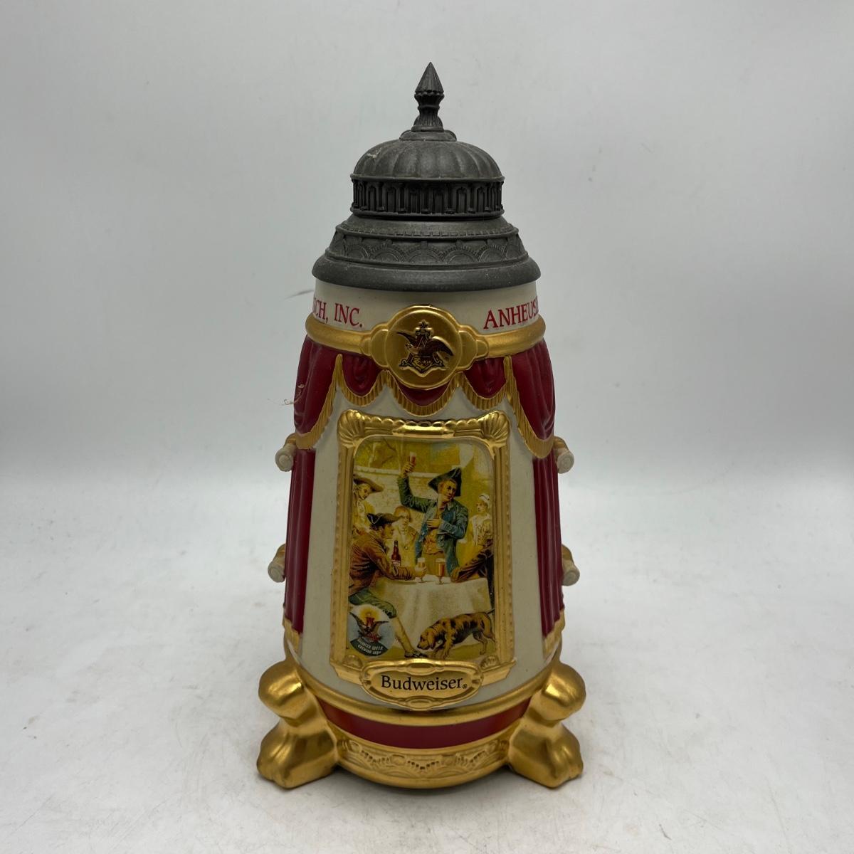 Lot includes Anheuser Busch 125th anniversary stein and a Anheuser Busch Opera card stein. Largest stein measures 4.5” x 6” x 11”.
