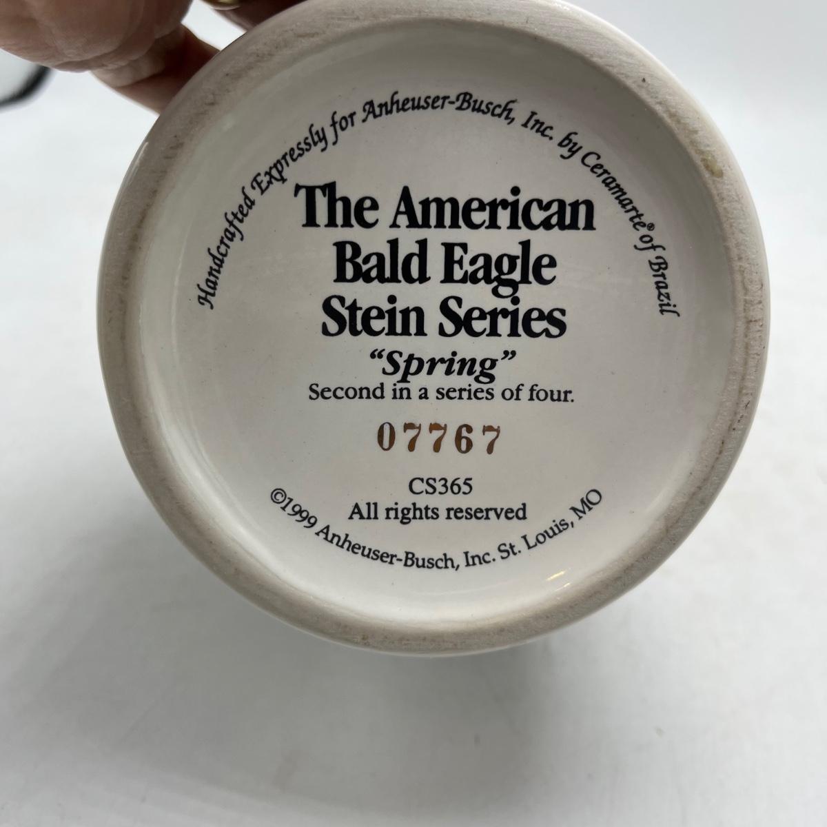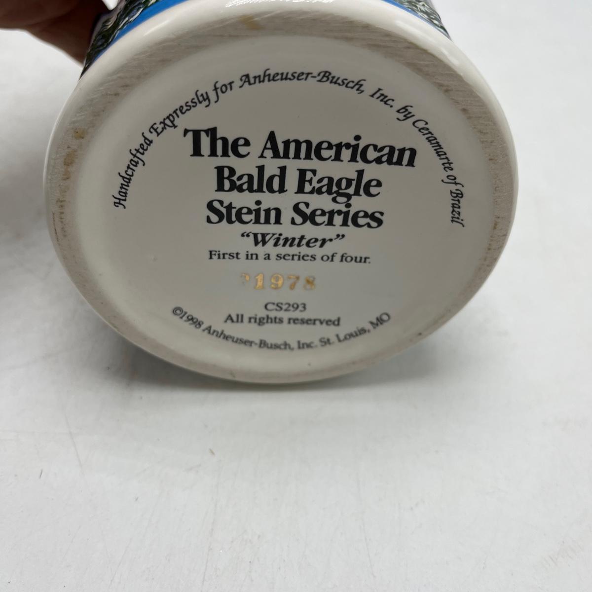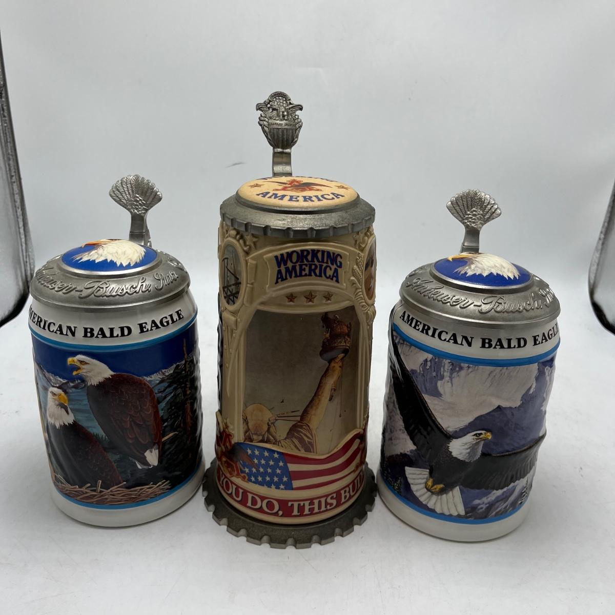 Lot contains two Anheuser Busch American Bald Eagle Series steins and a Working America Stein. Tallest stein measures 4.5” x 6” x 9.5”.