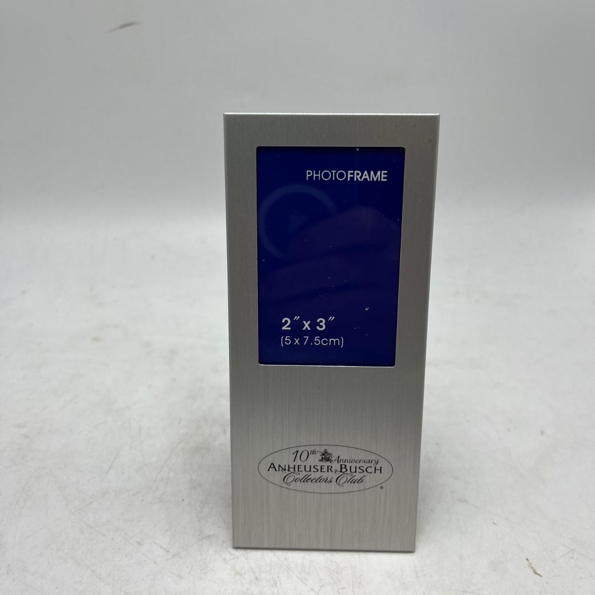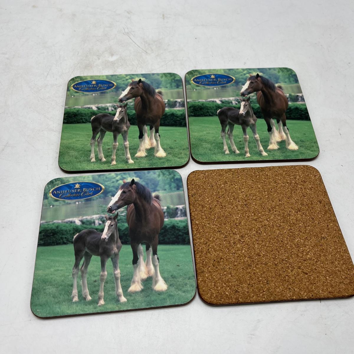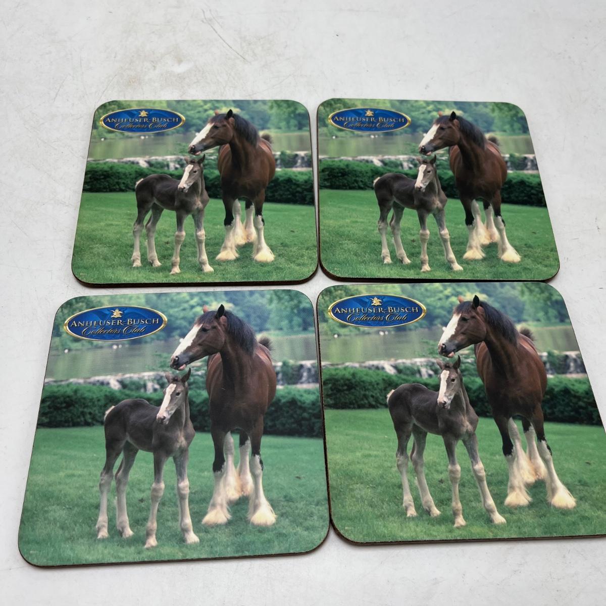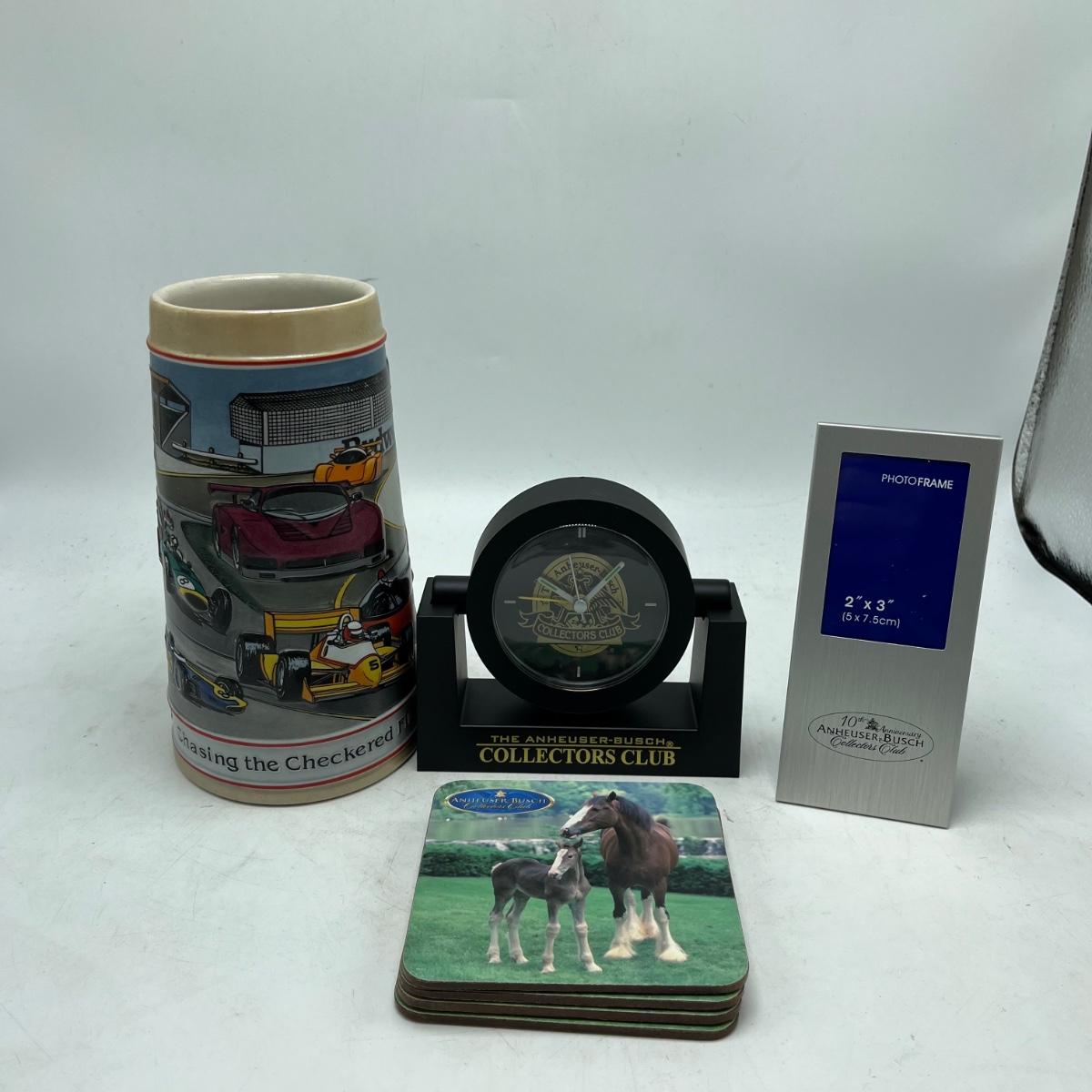 Lot includes a Anheuser Busch Auto racing sport series stein and Collectors Club Clock and picture frame and four coasters. Stein measures 4” x 6” x 7.5”.