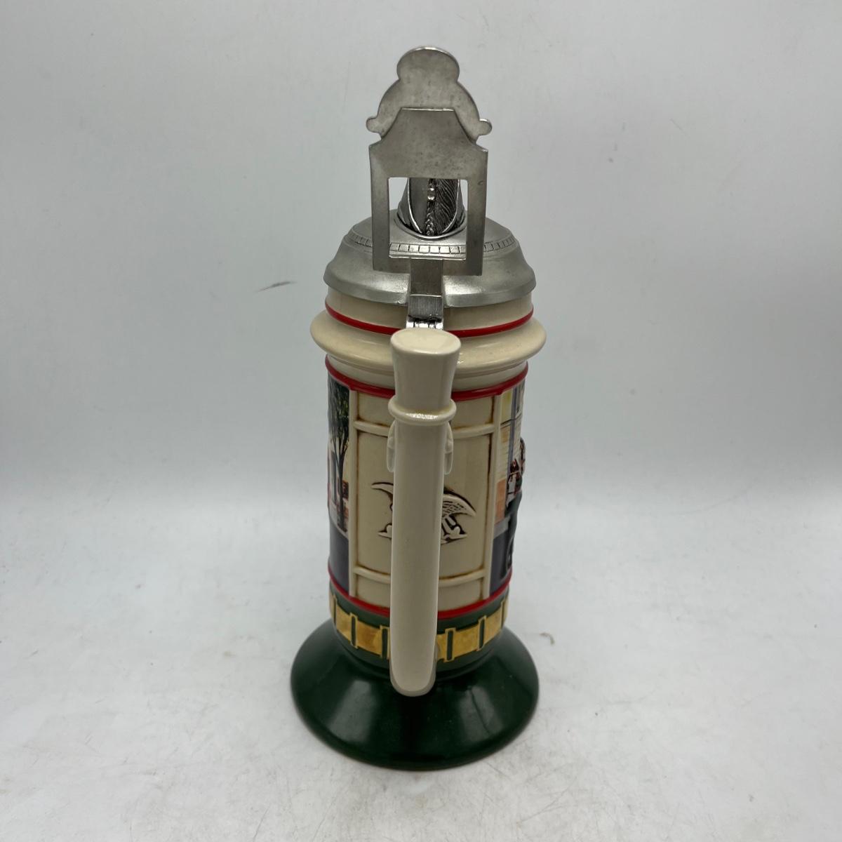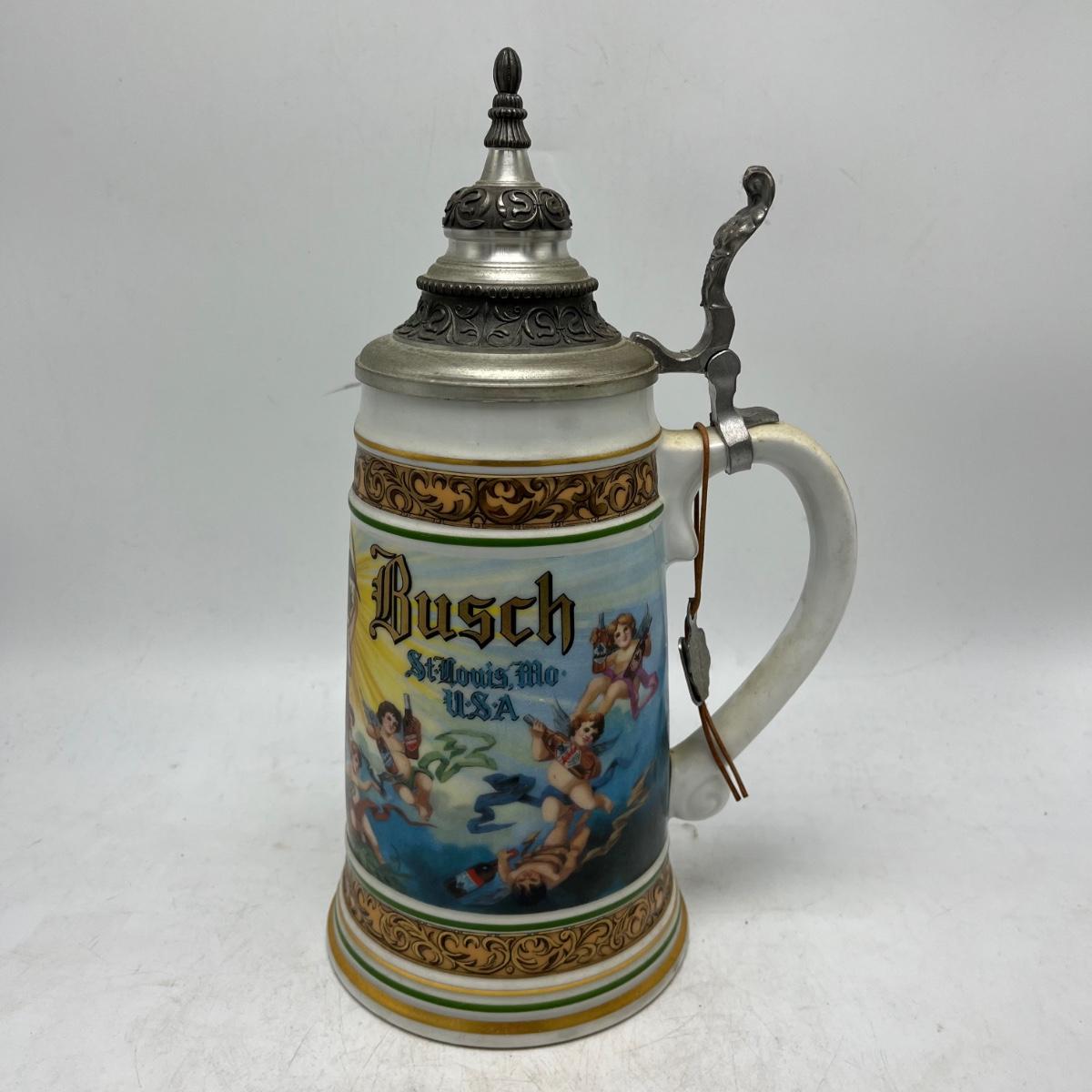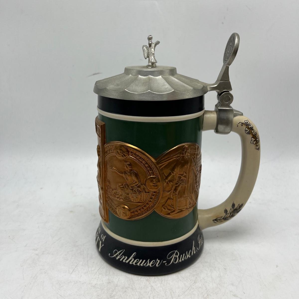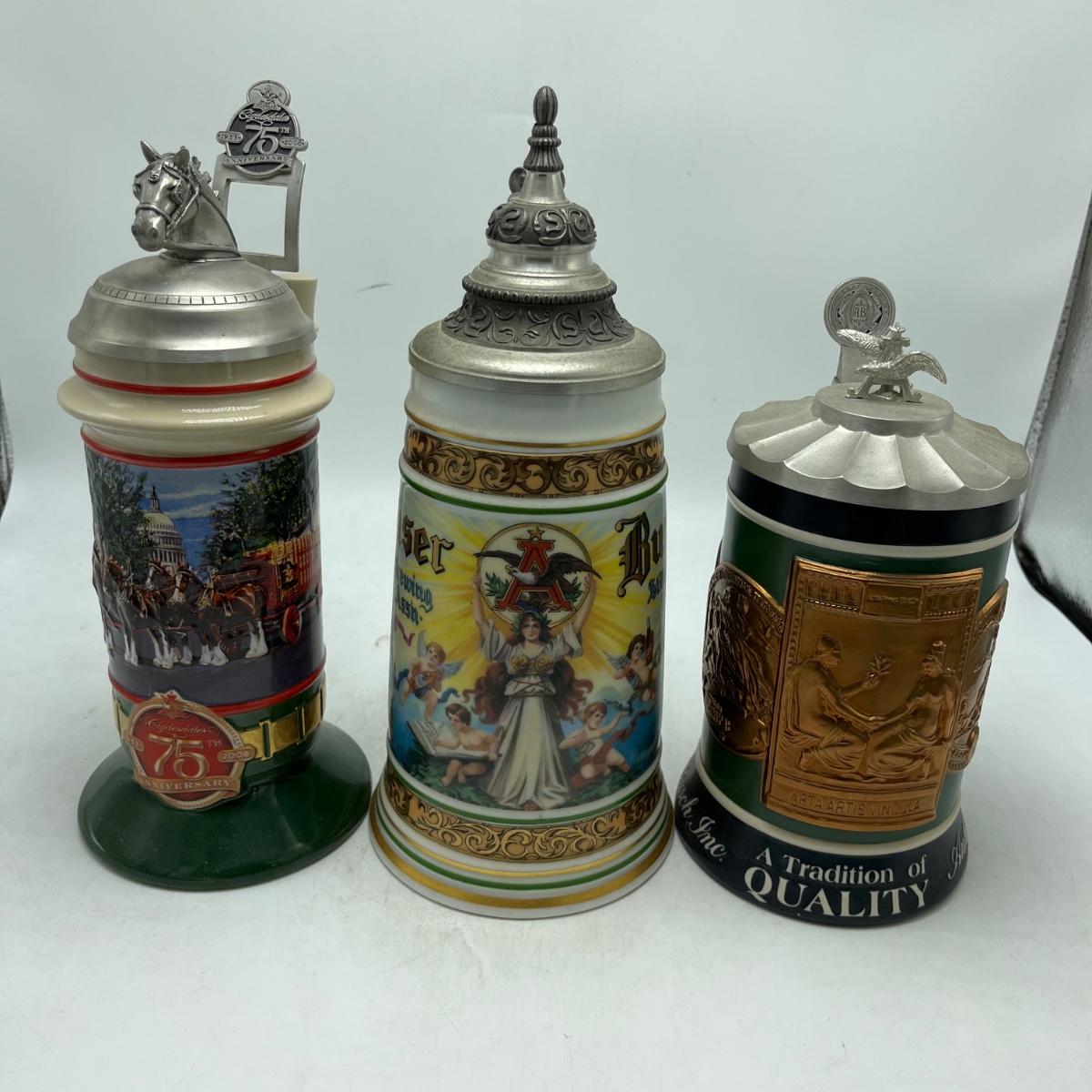 Lot includes a Anheuser Busch Clydesdales 75th anniversary stein. Cherub stein and a Tradition of BBC Quality stein. Tallest stein measures 4.75” x 6” x 11”.