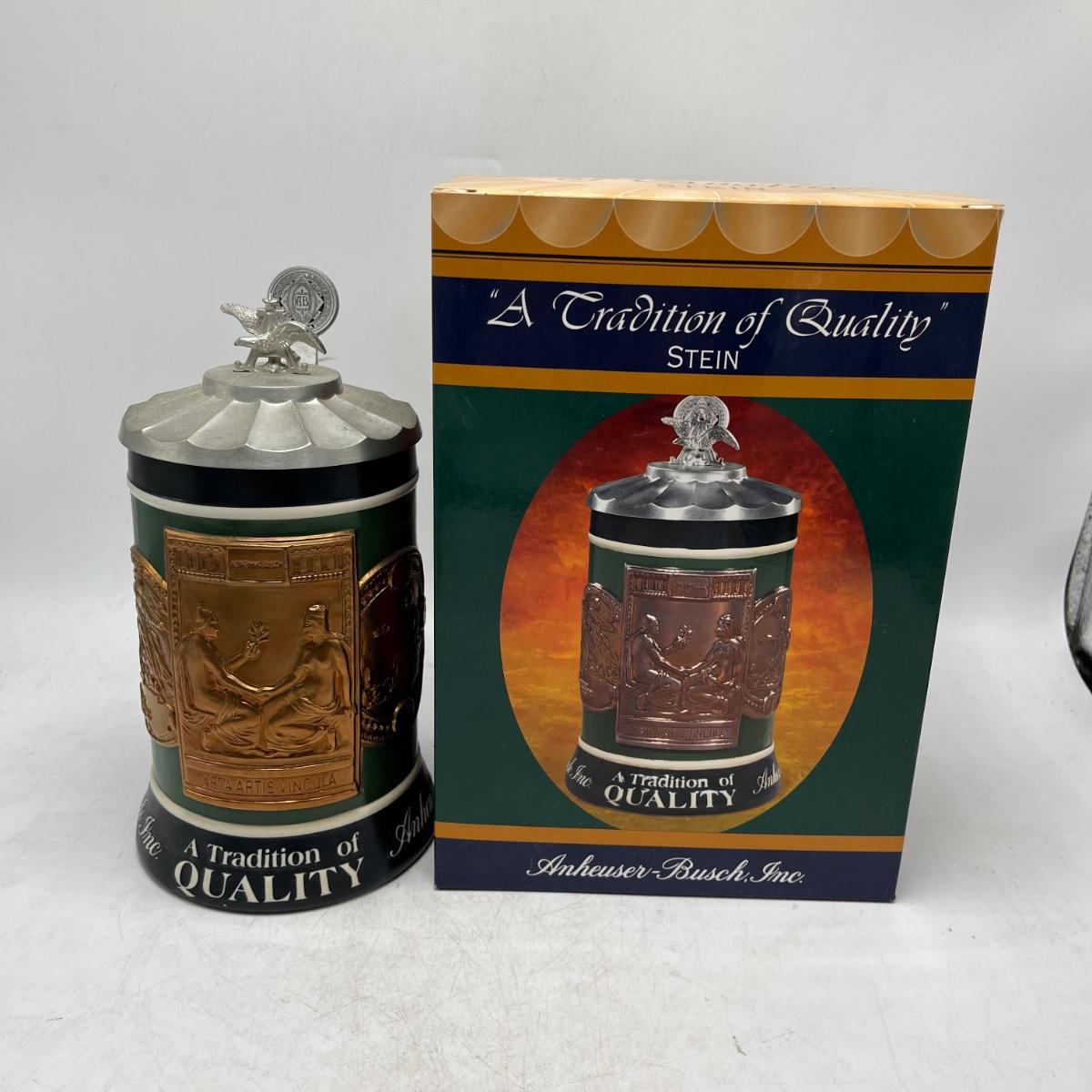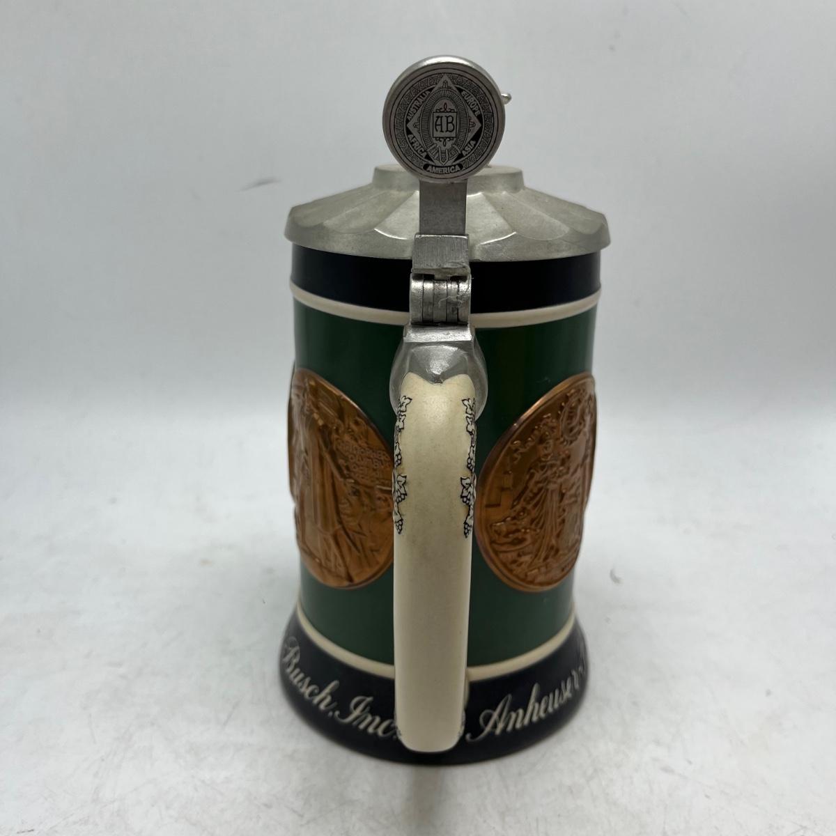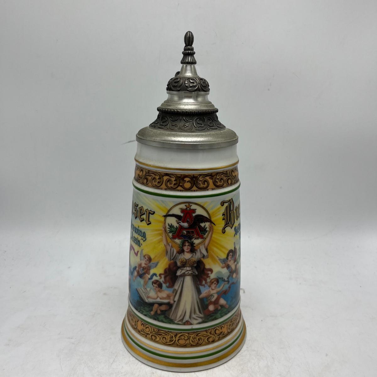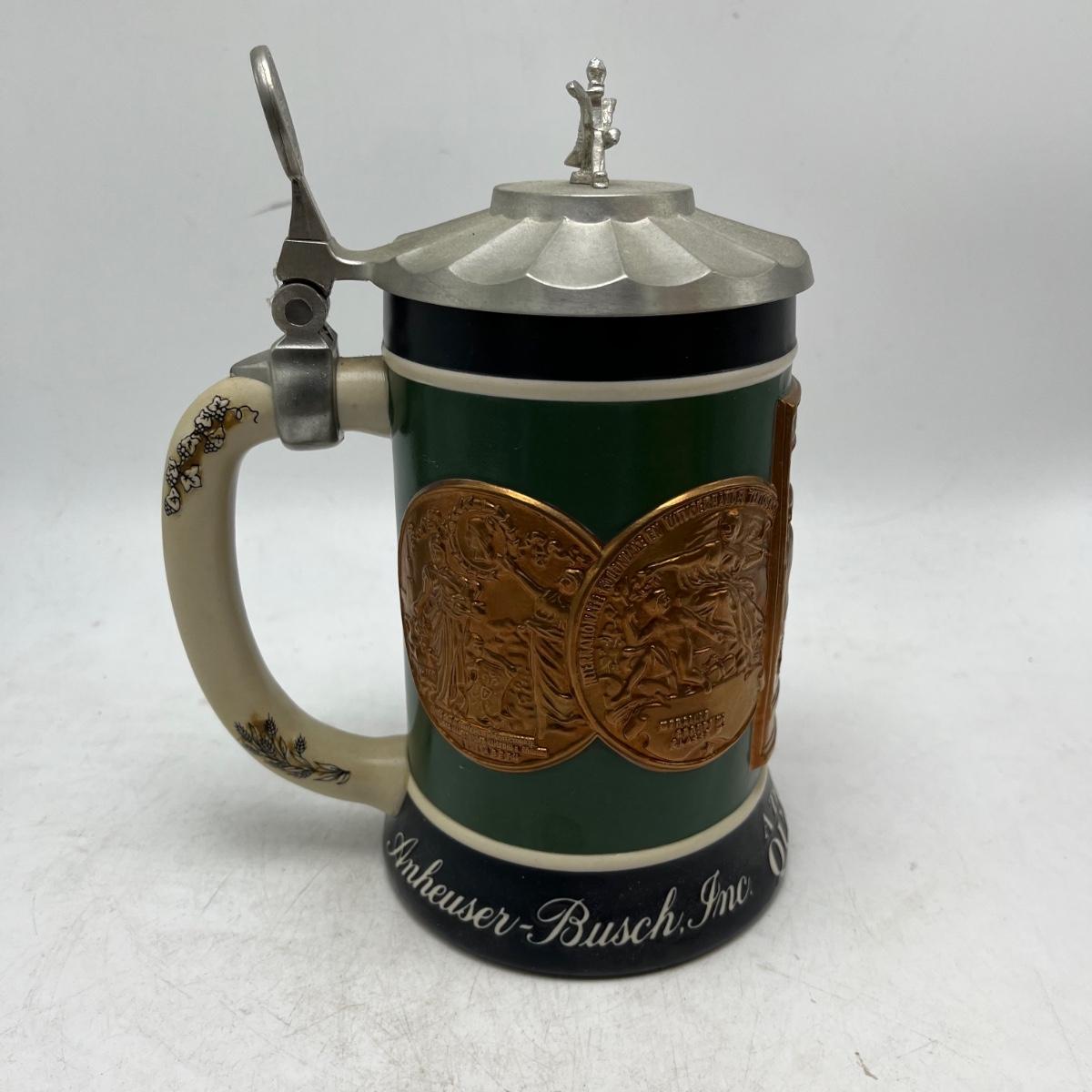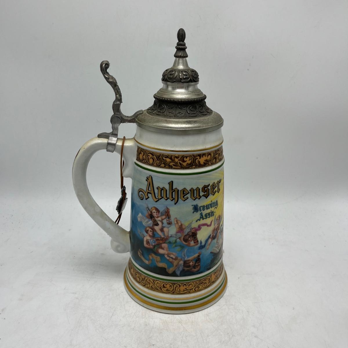 Lot includes a Anheuser Busch Clydesdales 75th anniversary stein. Cherub stein and a Tradition of BBC Quality stein. Tallest stein measures 4.75” x 6” x 11”.