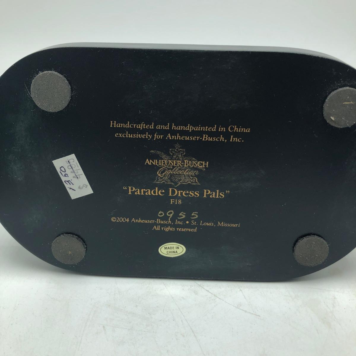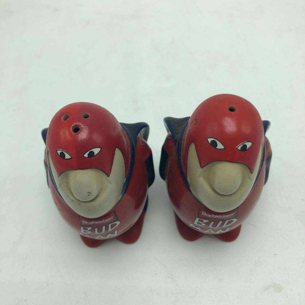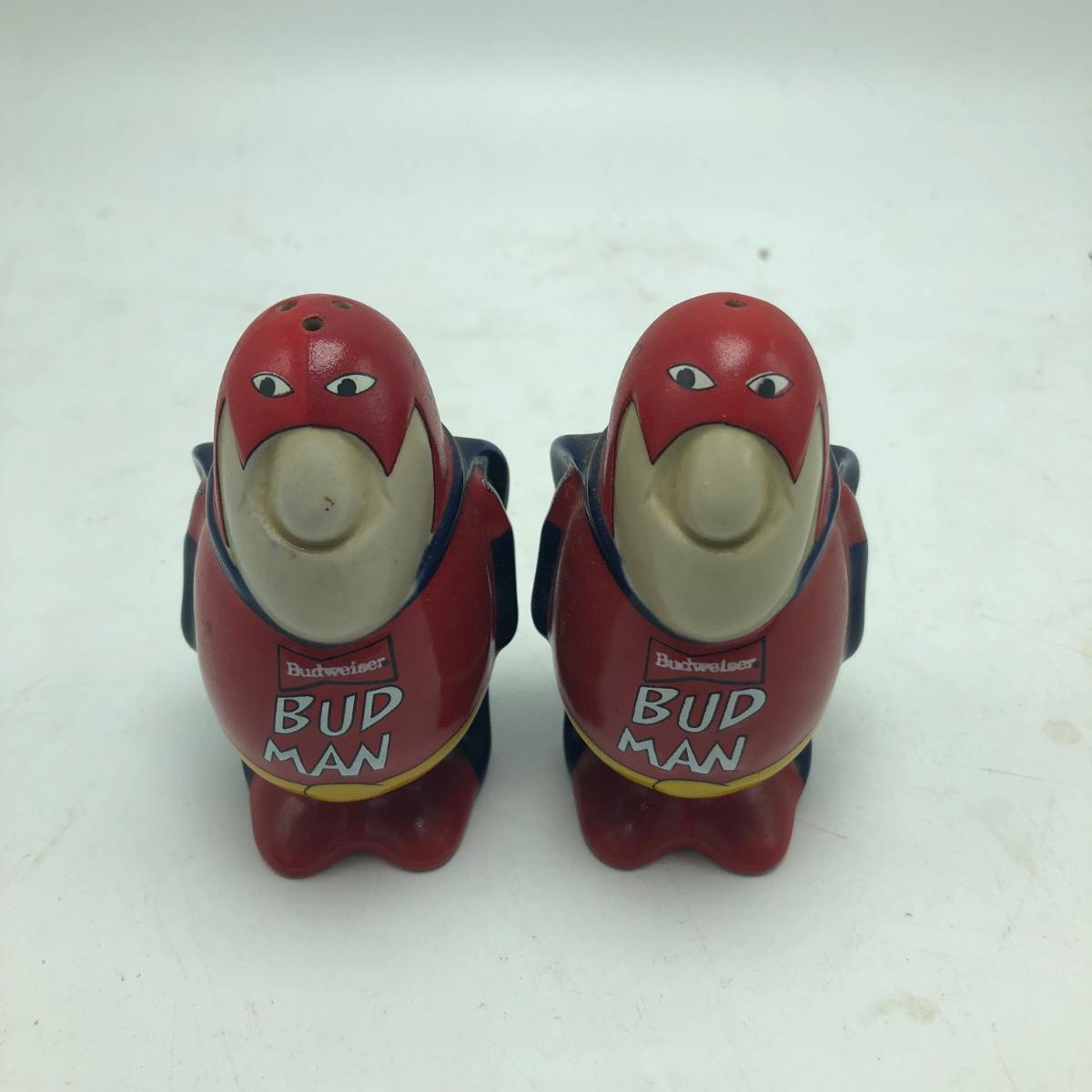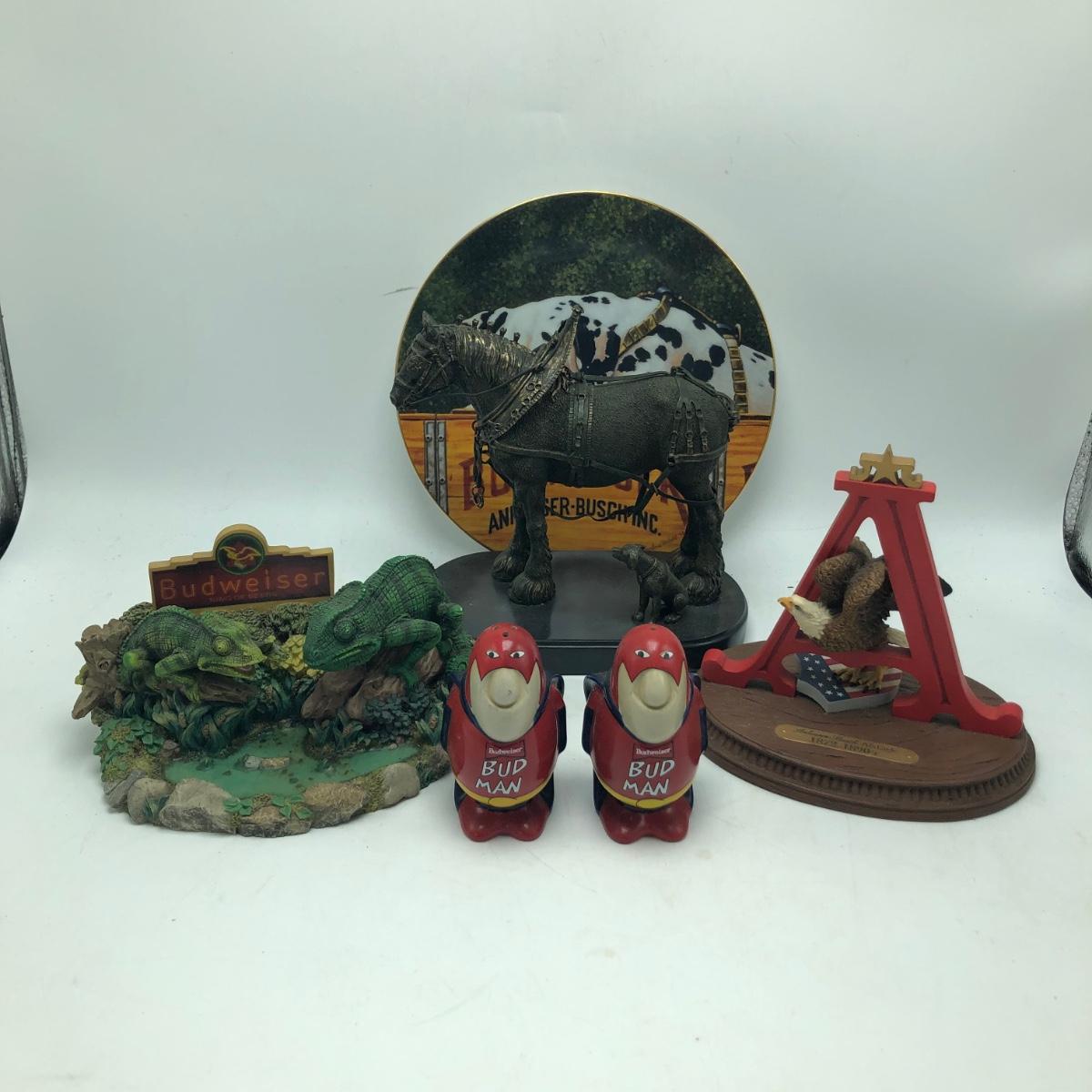 Lot includes Bud Man salt and pepper shakers, plate, Louie and Frank figurine, Eagle figurine and a figurine titled “ Parade Dress Pals “. Plate measures 8”D.