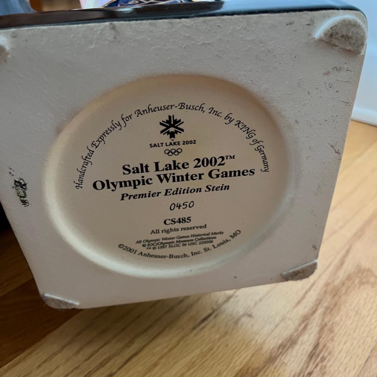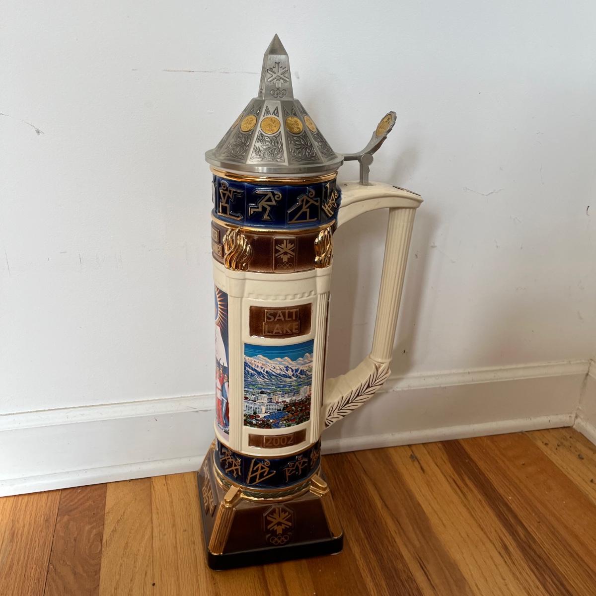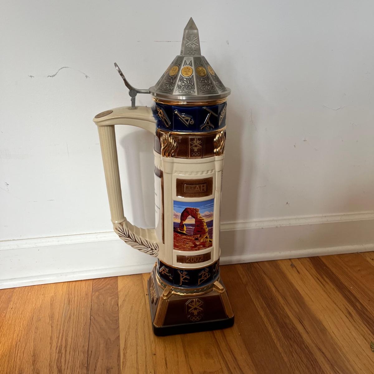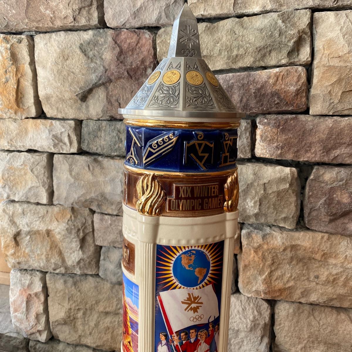 Lot includes a large Anheuser Busch Salt Lake City 2002 Olympic Stein number 0450. Stein base measures 6.5” x 6.5” x 22.5” tall.