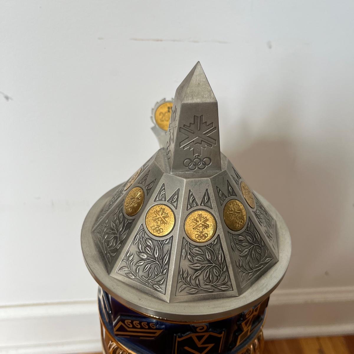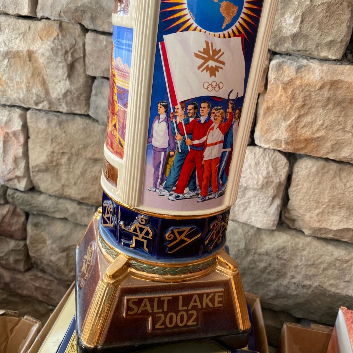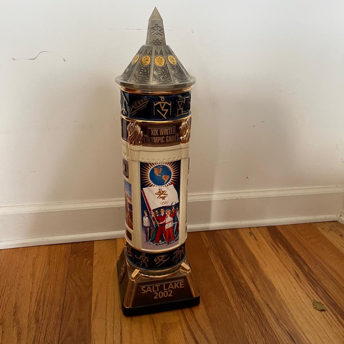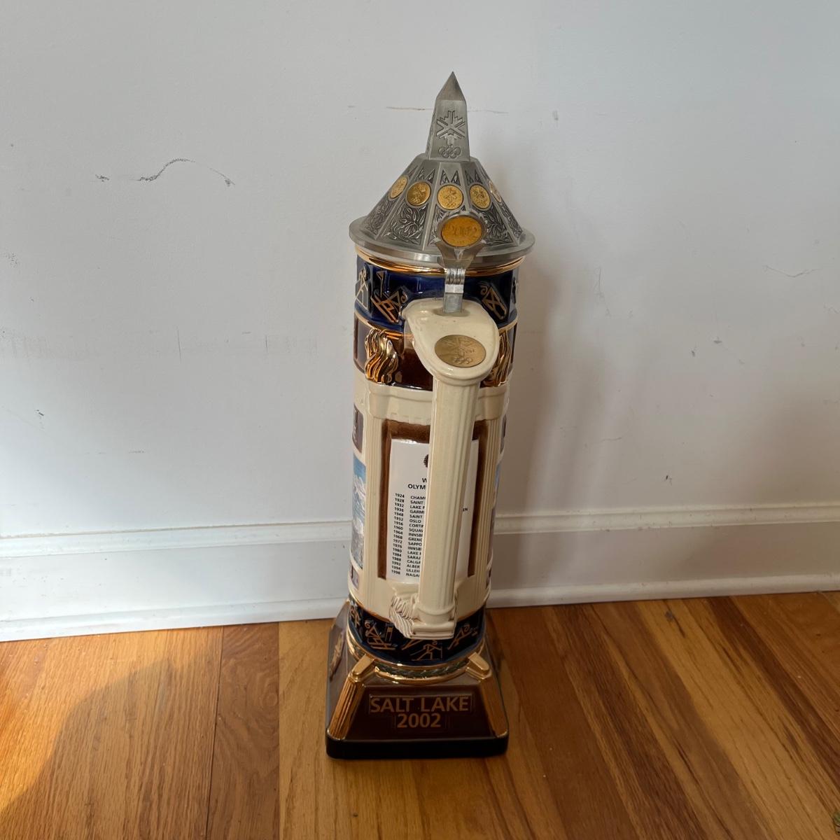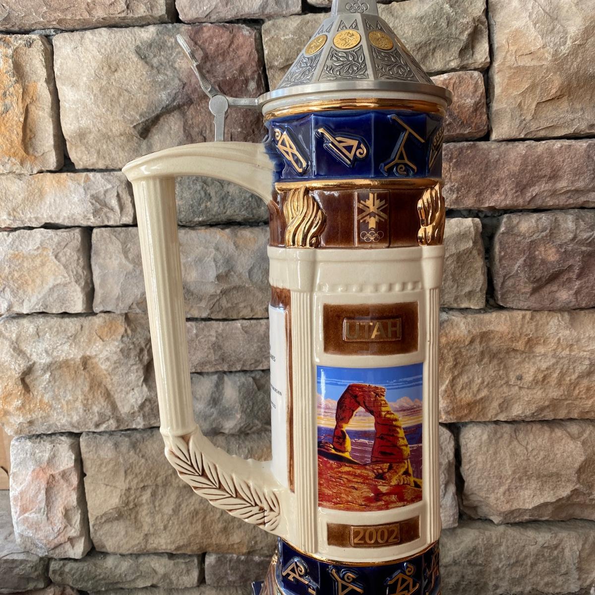 Lot includes a large Anheuser Busch Salt Lake City 2002 Olympic Stein number 0450. Stein base measures 6.5” x 6.5” x 22.5” tall.