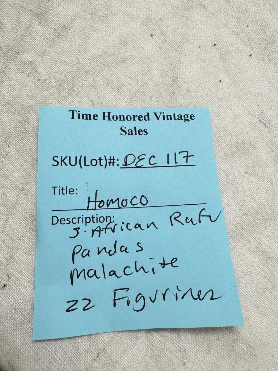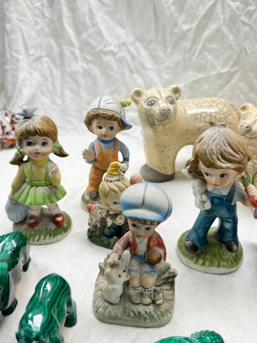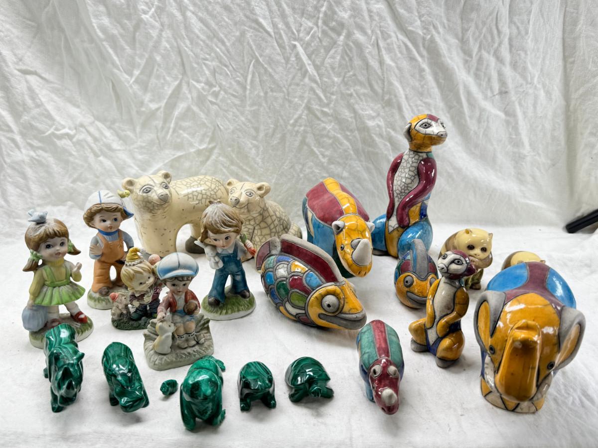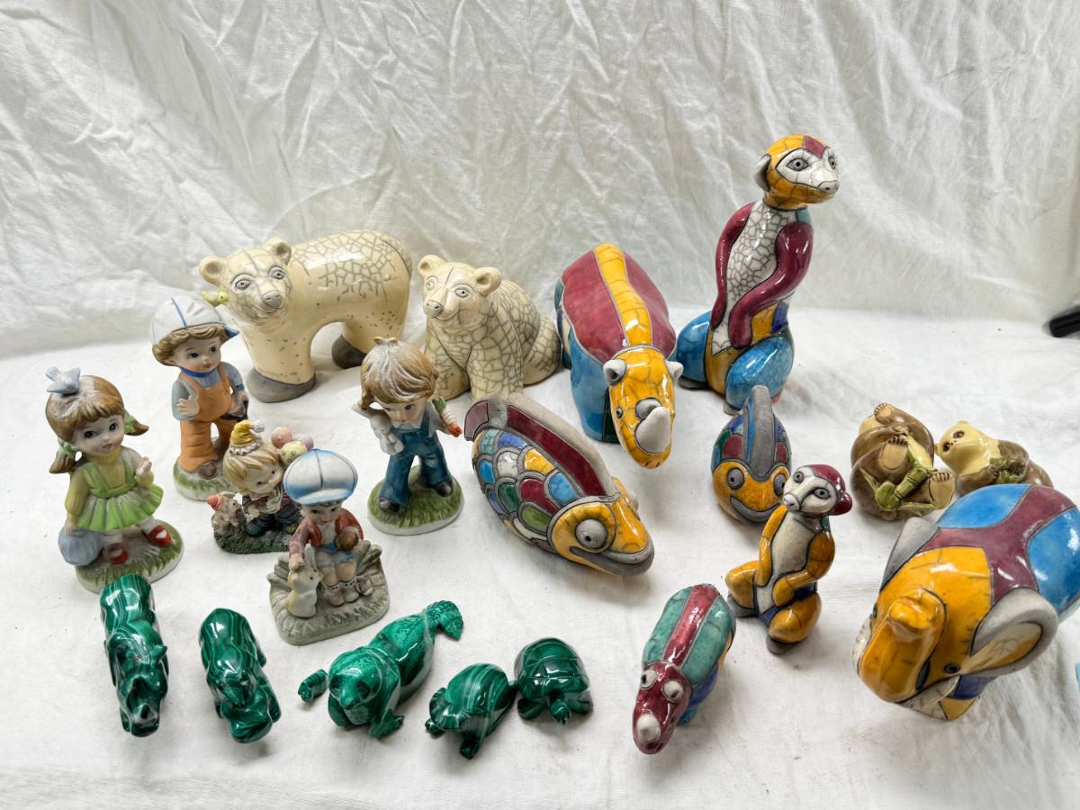 Malachite carved animals , South African handmade raku ceramic animals, 2 resin pandas, Ceramic "stone" Polar bears,
