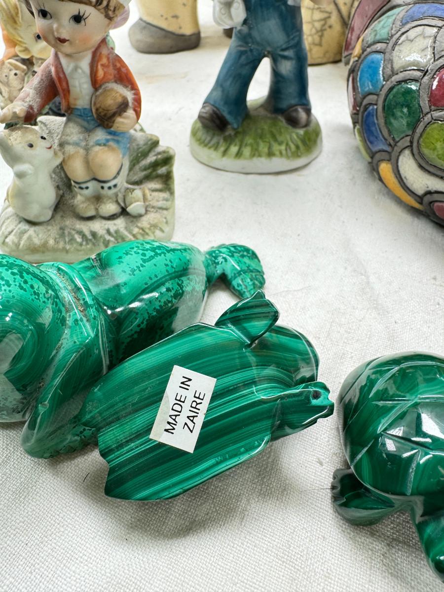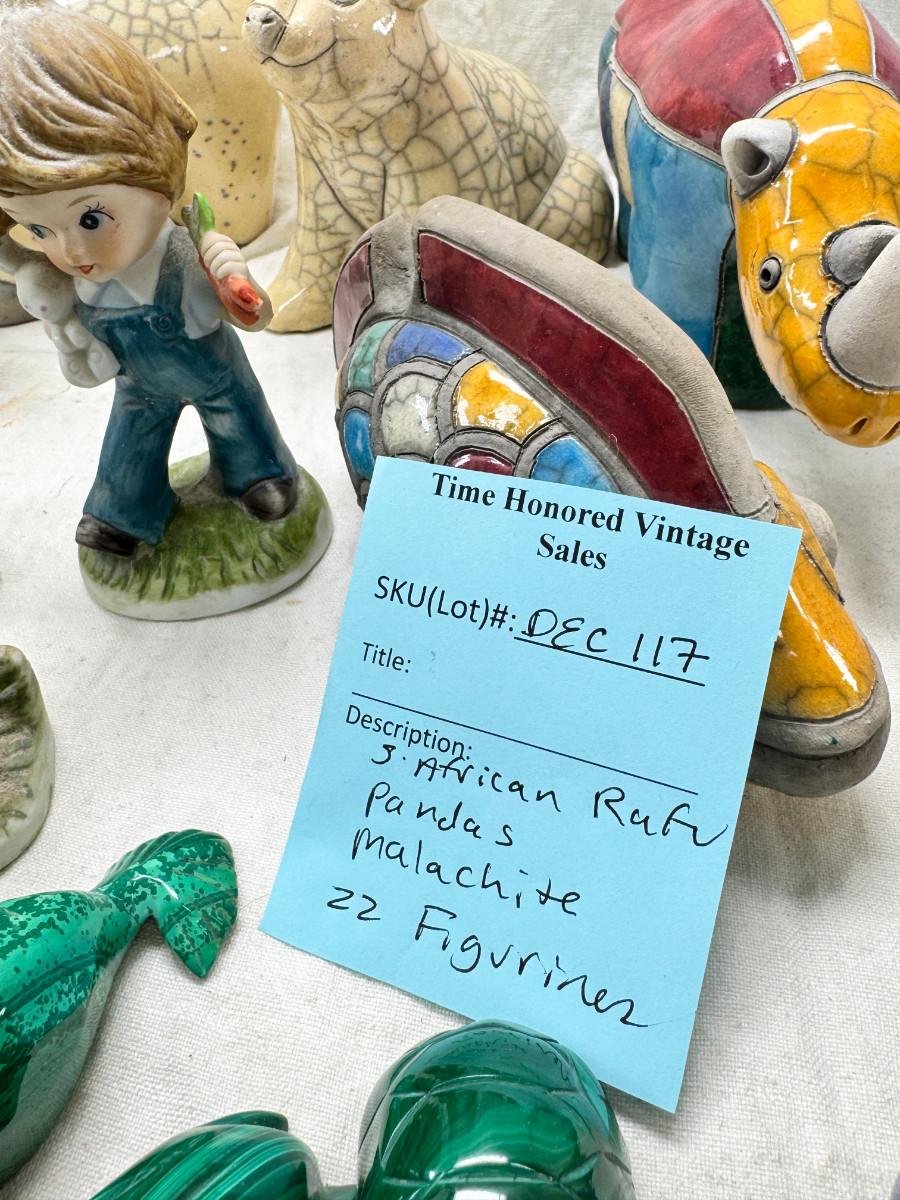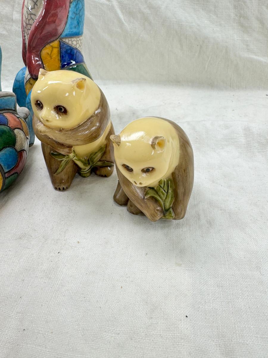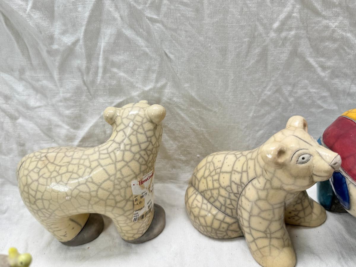 Malachite carved animals , South African handmade raku ceramic animals, 2 resin pandas, Ceramic "stone" Polar bears,