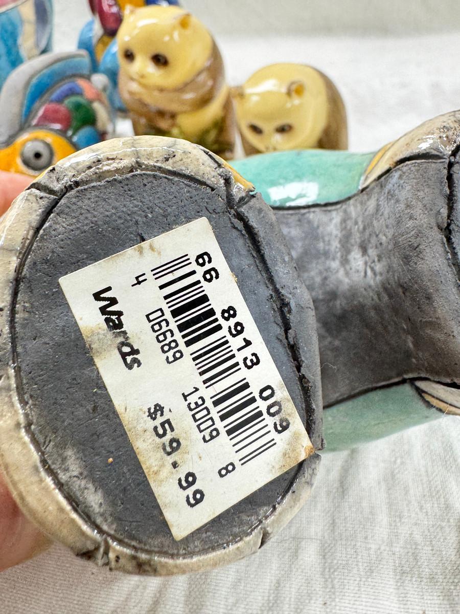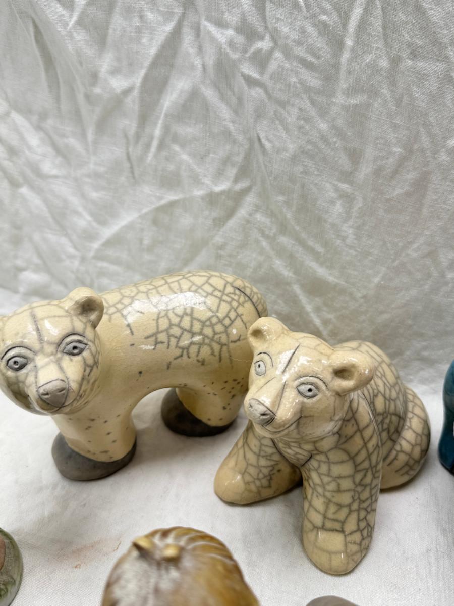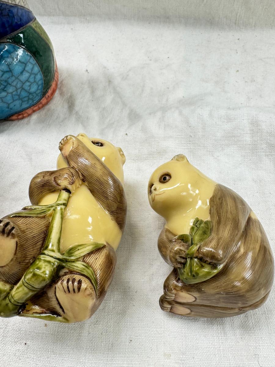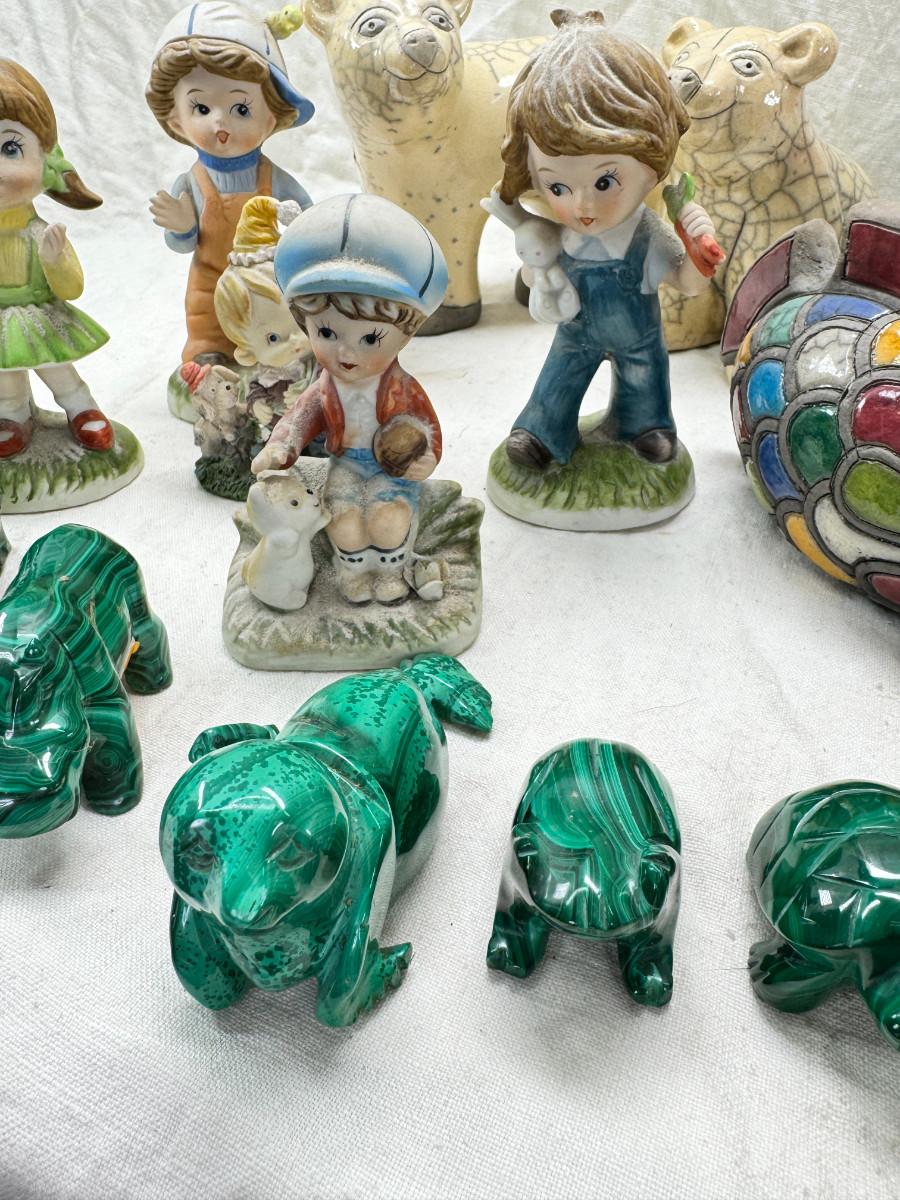 Malachite carved animals , South African handmade raku ceramic animals, 2 resin pandas, Ceramic "stone" Polar bears,